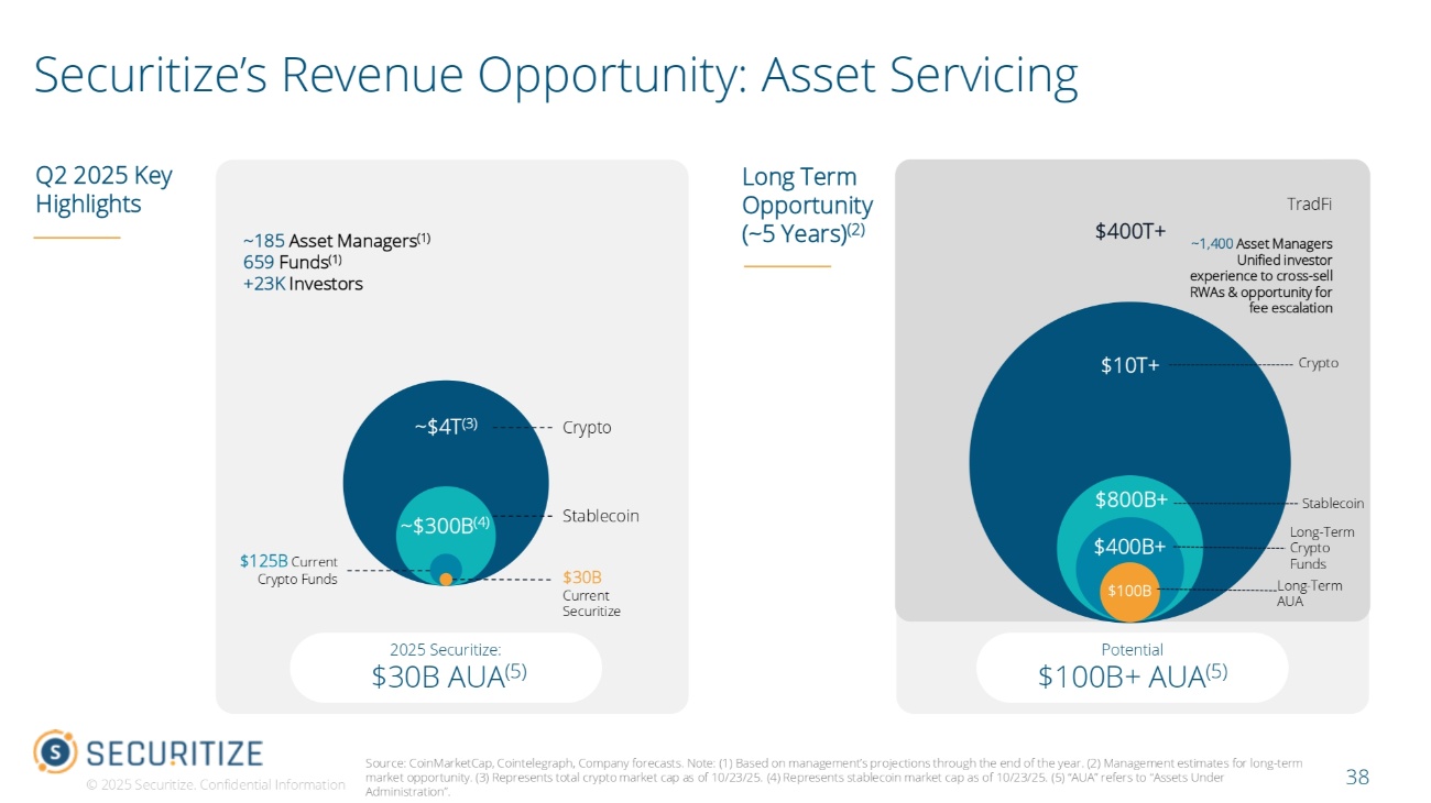 © 2025 Securitize. Confidential Information 38 $10T+ $800B+ $400B+ ~$4T (3) Securitize’s Revenue Opportunity: Asset Servicing Q2 2025 Key Highlights 2025 Securitize: $30B AUA (5) Crypto Crypto Funds Stablecoin Crypto $100B Long - Term AUA Potential $100B+ AUA (5) ~185 Asset Managers (1) 659 Funds (1) +23K Investors Stablecoin ~$300B (4) $125B Current Long - Term Crypto Funds Long Term Opportunity (~5 Years) (2) $30B Current Securitize $400T+ ~ 1 , 400 Asset Managers Unified investor experience to cross - sell RWAs & opportunity for fee escalation TradFi Source: CoinMarketCap, Cointelegraph, Company forecasts. Note: (1) Based on management’s projections through the end of the year. (2) Management estimates for long - term market opportunity. (3) Represents total crypto market cap as of 10/23/25. (4) Represents stablecoin market cap as of 10/23/25. (5) “AUA” refers to “Assets Under Administration”.