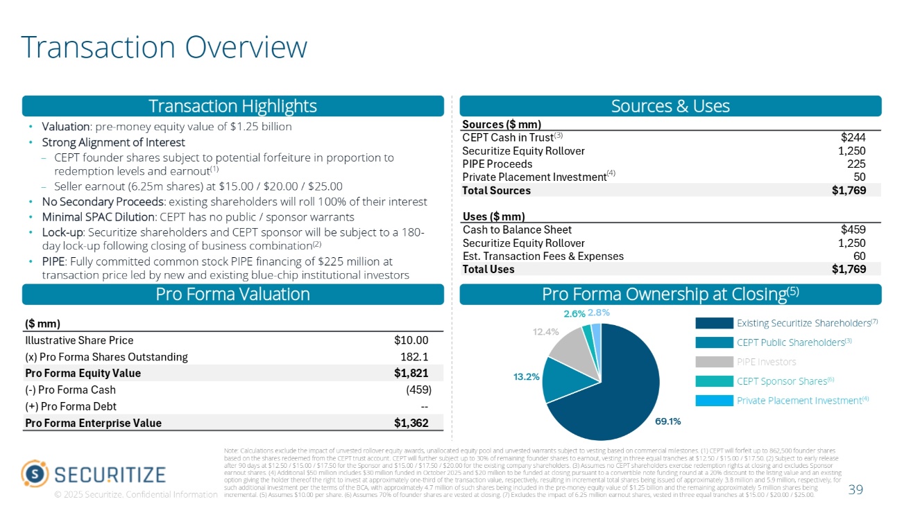 39 Transaction Overview Transaction Highlights Sources & Uses • Valuation: pre - money equity value of $1.25 billion • Strong Alignment of Interest – CEPT founder shares subject to potential forfeiture in proportion to redemption levels and earnout (1) – Seller earnout (6.25m shares) at $15.00 / $20.00 / $25.00 • No Secondary Proceeds: existing shareholders will roll 100% of their interest • Minimal SPAC Dilution: CEPT has no public / sponsor warrants • Lock - up: Securitize shareholders and CEPT sponsor will be subject to a 180 - day lock - up following closing of business combination (2) • PIPE: Fully committed common stock PIPE financing of $225 million at transaction price led by new and existing blue - chip institutional investors Pro Forma Valuation Pro Forma Ownership at Closing (5) Sources ($ mm) PIPE Proceeds Private Placement Investment $244 1,250 225 50 Total Sources $1,76G CEPT Cash in Trust (3) Securitize Equity Rollover 69.1% 13.2% 12.4% 2.6% 2.8% Existing Securitize Shareholders (7) CEPT Public Shareholders (3) PIPE Investors CEPT Sponsor Shares (6) Private Placement Investment (4) Note: Calculations exclude the impact of unvested rollover equity awards, unallocated equity pool and unvested warrants subject to vesting based on commercial milestones. (1) CEPT will forfeit up to 862,500 founder shares based on the shares redeemed from the CEPT trust account. CEPT will further subject up to 30% of remaining founder shares to earnout, vesting in three equal tranches at $12.50 / $15.00 / $17.50. (2) Subject to early release after 90 days at $12.50 / $15.00 / $17.50 for the Sponsor and $15.00 / $17.50 / $20.00 for the existing company shareholders. (3) Assumes no CEPT shareholders exercise redemption rights at closing and excludes Sponsor earnout shares. (4) Additional $50 million includes $30 million funded in October 2025 and $20 million to be funded at closing pursuant to a convertible note funding round at a 20% discount to the listing value and an existing option giving the holder thereof the right to invest at approximately one - third of the transaction value, respectively, resulting in incremental total shares being issued of approximately 3.8 million and 5.9 million, respectively, for such additional investment per the terms of the BCA, with approximately 4.7 million of such shares being included in the pre - money equity value of $1.25 billion and the remaining approximately 5 million shares being © 2025 Securitize. Confidential Information incremental. (5) Assumes $10.00 per share. (6) Assumes 70% of founder shares are vested at closing. (7) Excludes the impact of 6.25 million earnout shares, vested in three equal tranches at $15.00 / $20.00 / $25.00. (4) Uses ($ mm) Cash to Balance Sheet Securitize Equity Rollover Est. Transaction Fees & Expenses $459 1,250 60 Total Uses $1,76G $10.00 Illustrative Share Price 182.1 (x) Pro Forma Shares Outstanding $1,821 Pro Forma Equity Value (459) ( - ) Pro Forma Cash - - (+) Pro Forma Debt $1,362 Pro Forma Enterprise Value ($ mm)