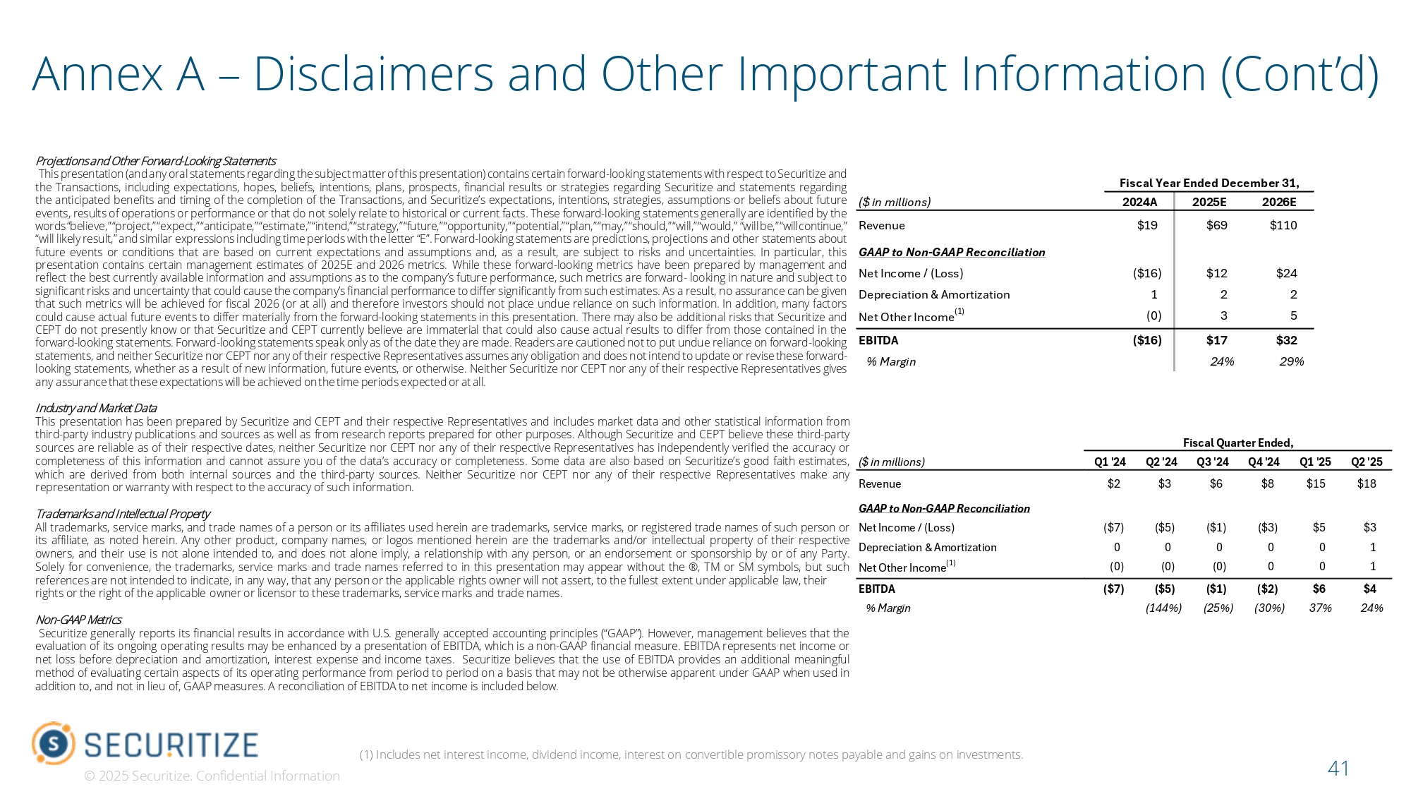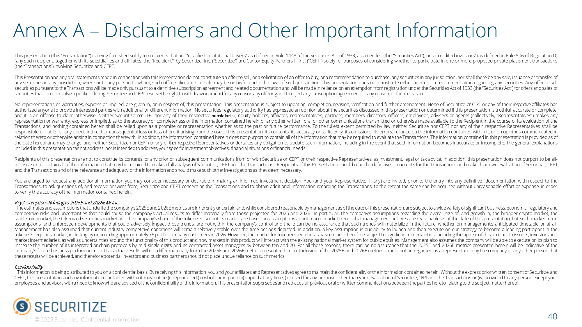 © 2025 Securitize. Confidential Information 40 Annex A – Disclaimers and Other Important Information This presentation (this “Presentation”) is being furnished solely to recipients that are “qualified institutional buyers” as defined in Rule 144 A of the Securities Act of 1933 , as amended (the “Securities Act”), or “accredited investors” (as defined in Rule 506 of Regulation D) (any such recipient, together with its subsidiaries and affiliates, the “Recipient”) by Securitize, Inc . (“Securitize”) and Cantor Equity Partners II, Inc . (“CEPT”) solely for purposes of considering whether to participate in one or more proposed private placement transactions (the “Transactions”) involving Securitize and CEPT . This Presentation and any oral statements made in connection with this Presentation do not constitute an offer to sell, or a solicitation of an offer to buy, or a recommendation to purchase, any securities in any jurisdiction, nor shall there be any sale, issuance or transfer of any securities in any jurisdiction, where or to any person to whom, such offer, solicitation or sale may be unlawful under the laws of such jurisdiction . This presentation does not constitute either advice or a recommendation regarding any securities . Any offer to sell securities pursuant to the Transactions will be made only pursuant to a definitive subscription agreement and related documentation and will be made in reliance on an exemption from registration under the Securities Act of 1933 (the “Securities Act”) for offers and sales of securities that do notinvolve a public offering . Securitize and CEPTreserve the right to withdraw or amend for any reason any offeringand to reject any subscription agreementfor any reason, or for no reason . No representations or warranties, express or implied, are given in, or in respect of, this presentation . This presentation is subject to updating, completion, revision, verification and further amendment . None of Securitize or CEPT or any of their respective affiliates has authorized anyone to provide interested parties with additional or different information . No securities regulatory authority has expressed an opinion about the securities discussed in this presentation or determined if this presentation is truthful, accurate or complete, and it is an offense to claim otherwise . Neither Securitize nor CEPT nor any of their respective subsidiaries , equity holders, affiliates, representatives, partners, members, directors, officers, employees, advisers or agents (collectively, “Representatives”) makes any representation or warranty, express or implied, as to the accuracy or completeness of the information contained herein or any other written, oral or other communications transmitted or otherwise made available to the Recipient in the course of its evaluation of the Transactions, and nothing contained herein shall be relied upon as a promise or representation whether as to the past or future performance . To the fullest extent permitted by law, neither Securitize nor CEPT nor any of their respective Representatives shall be responsible or liable for any direct, indirect or consequential loss or loss of profit arising from the use of this presentation, its contents, its accuracy or sufficiency, its omissions, its errors, reliance on the information contained within it, or on opinions communicated in relation thereto or otherwise arising in connection therewith . In addition, the information contained herein does not purport to contain all of the information that may be required to evaluate the Transactions . The information contained in this presentation is provided as of the date hereof and may change, and neither Securitize nor CEPT nor any of their respective Representatives undertakes any obligation to update such information, including in the event that such information becomes inaccurate or incomplete . The general explanations included in this presentation cannotaddress, nor is intended to address, yourspecific investment objectives, financial situations orfinancial needs . Recipients of this presentation are not to construe its contents, or any prior or subsequent communications from or with Securitize or CEPT or their respective Representatives, as investment, legal or tax advice . In addition, this presentation does not purport to be all - inclusive or to contain all of the information that may be required to make a full analysis of Securitize, CEPT and the Transactions . Recipients of this Presentation should read the definitive documents for the Transactions and make their own evaluation of Securitize, CEPT and the Transactions and of the relevance and adequacy of the information and should make such other investigations as they deem necessary . You are urged to request any additional information you may consider necessary or desirable in making an informed investment decision . You (and your Representative, if any) are invited, prior to the entry into any definitive documentation with respect to the Transactions, to ask questions of, and receive answers from, Securitize and CEPT concerning the Transactions and to obtain additional information regarding the Transactions, to the extent the same can be acquired without unreasonable effort or expense, in order to verify the accuracy of the information contained herein . Key Assumptions Relating to 2025E and 2026E Metrics The estimates and assumptions that underlie the company’s 2025 E and 2026 E metrics are inherently uncertain and, while considered reasonable by management as of the date of this presentation, are subject to a wide variety of significant business, economic, regulatory and competitive risks and uncertainties that could cause the company’s actual results to differ materially from those projected for 2025 and 2026 . In particular, the company’s assumptions regarding the overall size of, and growth in, the broader crypto market, the stablecoin mar