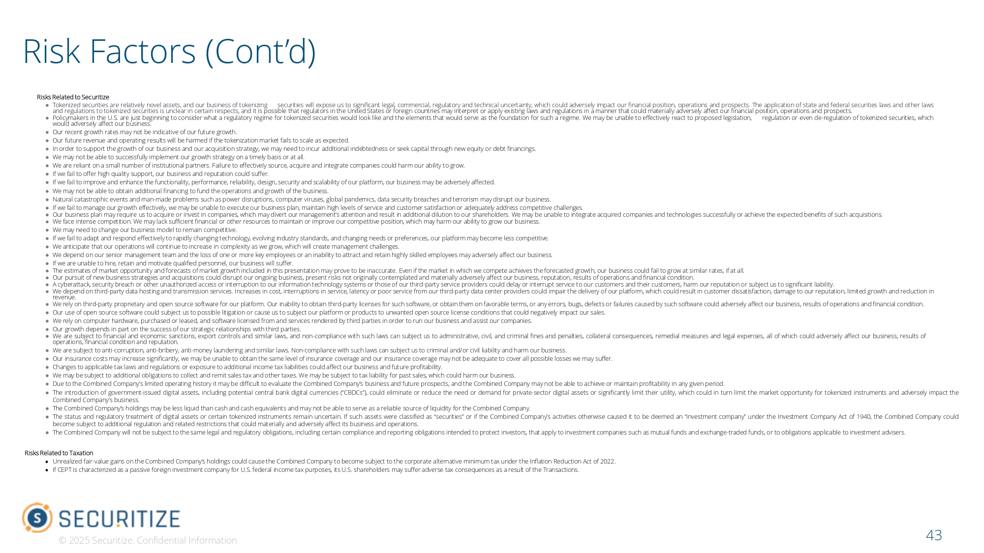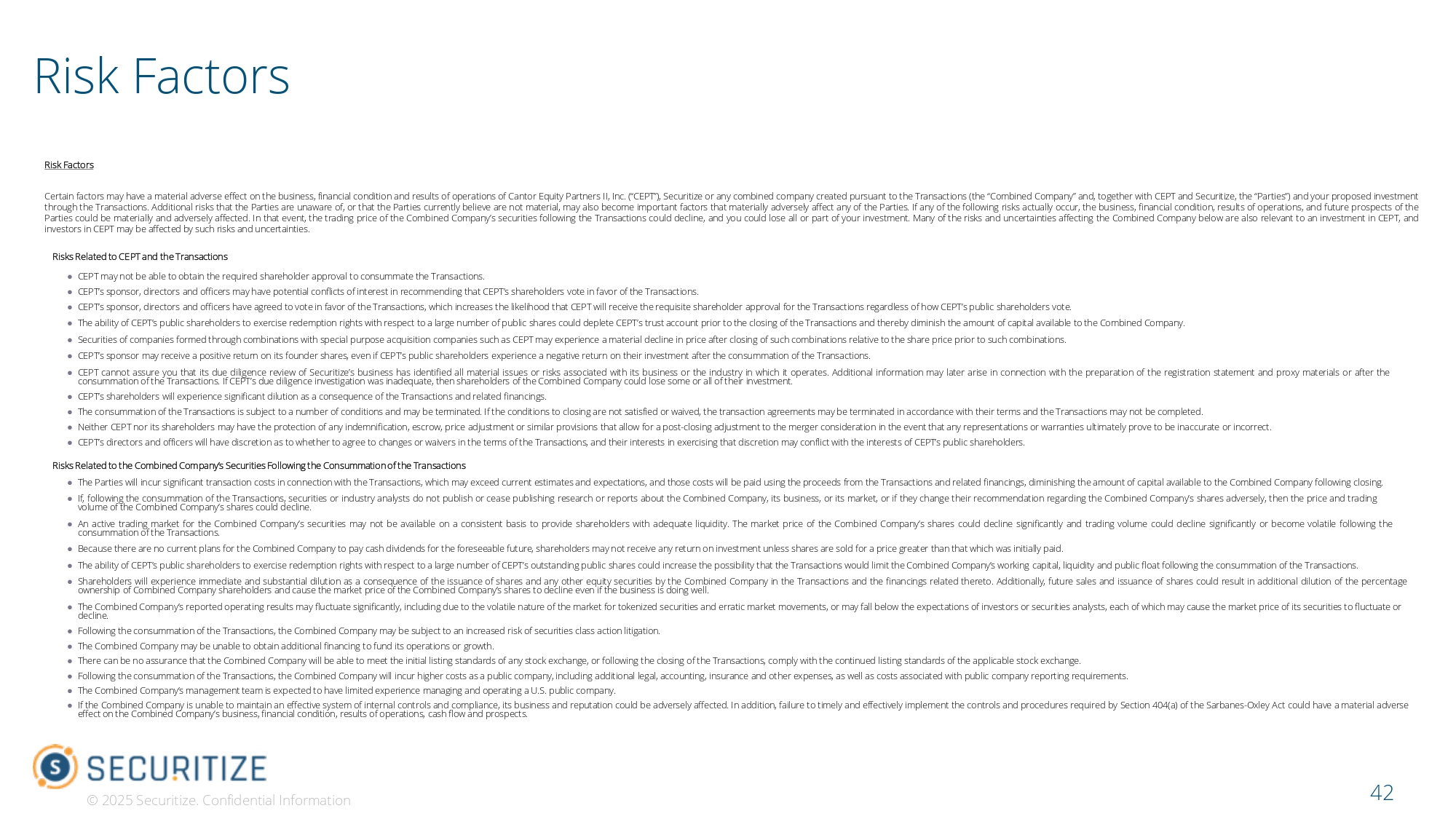 Risk Factors 42 © 2025 Securitize. Confidential Information Risk Factors Certain factors may have a material adverse effect on the business, financial condition and results of operations of Cantor Equity Partners II, Inc . (“CEPT”), Securitize or any combined company created pursuant to the Transactions (the “Combined Company” and, together with CEPT and Securitize, the “Parties”) and your proposed investment through the Transactions . Additional risks that the Parties are unaware of, or that the Parties currently believe are not material, may also become important factors that materially adversely affect any of the Parties . If any of the following risks actually occur, the business, financial condition, results of operations, and future prospects of the Parties could be materially and adversely affected . In that event, the trading price of the Combined Company’s securities following the Transactions could decline, and you could lose all or part of your investment . Many of the risks and uncertainties affecting the Combined Company below are also relevant to an investment in CEPT, and investors in CEPT may be affected by such risks and uncertainties . Risks Related to CEPT and the Transactions ● CEPT may not be able to obtain the required shareholder approval to consummate the Transactions. ● CEPT’s sponsor, directors and officers may have potential conflicts of interest in recommending that CEPT’s shareholders vote in favor of the Transactions. ● CEPT’s sponsor, directors and officers have agreed to vote in favor of the Transactions, which increases the likelihood that CEPT will receive the requisite shareholder approval for the Transactions regardless of how CEPT’s public shareholders vote. ● The ability of CEPT’s public shareholders to exercise redemption rights with respect to a large number of public shares could deplete CEPT’s trust account prior to the closing of the Transactions and thereby diminish the amount of capital available to the Combined Company. ● Securities of companies formed through combinations with special purpose acquisition companies such as CEPT may experience a material decline in price after closing of such combinations relative to the share price prior to such combinations. ● CEPT’s sponsor may receive a positive return on its founder shares, even if CEPT’s public shareholders experience a negative return on their investment after the consummation of the Transactions. ● CEPT cannot assure you that its due diligence review of Securitize’s business has identified all material issues or risks associated with its business or the industry in which it operates. Additional information may later arise in connection with the preparation of the registration statement and proxy materials or after the consummation of the Transactions. If CEPT’s due diligence investigation was inadequate, then shareholders of the Combined Company could lose some or all of their investment. ● CEPT’s shareholders will experience significant dilution as a consequence of the Transactions and related financings. ● The consummation of the Transactions is subject to a number of conditions and may be terminated. If the conditions to closing are not satisfied or waived, the transaction agreements may be terminated in accordance with their terms and the Transactions may not be completed. ● Neither CEPT nor its shareholders may have the protection of any indemnification, escrow, price adjustment or similar provisions that allow for a post - closing adjustment to the merger consideration in the event that any representations or warranties ultimately prove to be inaccurate or incorrect. ● CEPT’s directors and officers will have discretion as to whether to agree to changes or waivers in the terms of the Transactions, and their interests in exercising that discretion may conflict with the interests of CEPT’s public shareholders. Risks Related to the Combined Company’s Securities Following the Consummation of the Transactions ● The Parties will incur significant transaction costs in connection with the Transactions, which may exceed current estimates and expectations, and those costs will be paid using the proceeds from the Transactions and related financings, diminishing the amount of capital available to the Combined Company following closing. ● If, following the consummation of the Transactions, securities or industry analysts do not publish or cease publishing research or reports about the Combined Company, its business, or its market, or if they change their recommendation regarding the Combined Company’s shares adversely, then the price and trading volume of the Combined Company’s shares could decline. ● An active trading market for the Combined Company’s securities may not be available on a consistent basis to provide shareholders with adequate liquidity. The market price of the Combined Company’s shares could decline significantly and trading volume could decline significantly or become volatile following the consummation of the Transactions. ● Because there are no current plans for the Combined Company to pay cash dividends for the foreseeable future, shareholders may not receive any return on investment unless shares are sold for a price greater than that which was initially paid. ● The ability of CEPT’s public shareholders to exercise redemption rights with respect to a large number of CEPT’s outstanding public shares could increase the possibility that the Transactions would limit the Combined Company’s working capital, liquidity and public float following the consummation of the Transactions. ● Shareholders will experience immediate and substantial dilution as a consequence of the issuance of shares and any other equity securities by the Combined Company in the Transactions and the financings related thereto. Additionally, future sales and issuance of shares could result in additional dilution of the