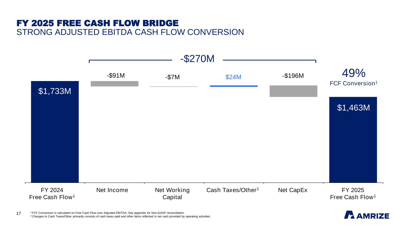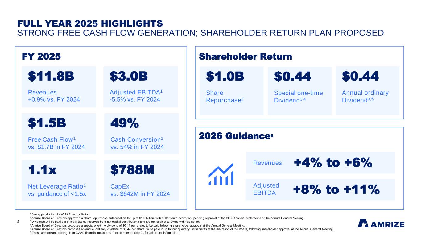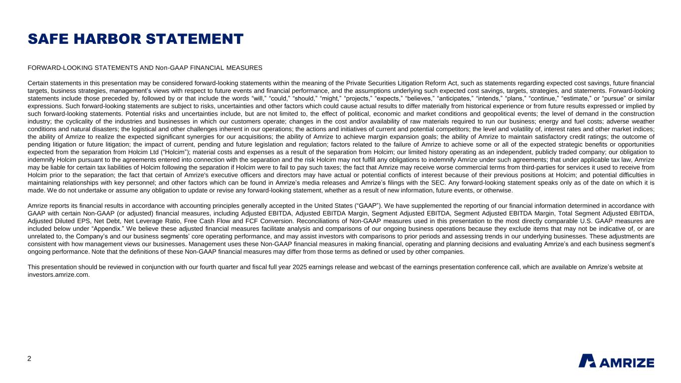 2 SAFE HARBOR STATEMENT FORWARD-LOOKING STATEMENTS AND Non-GAAP FINANCIAL MEASURES Certain statements in this presentation may be considered forward-looking statements within the meaning of the Private Securities Litigation Reform Act, such as statements regarding expected cost savings, future financial targets, business strategies, management’s views with respect to future events and financial performance, and the assumptions underlying such expected cost savings, targets, strategies, and statements. Forward-looking statements include those preceded by, followed by or that include the words “will,” “could,” “should,” “might,” “projects,” “expects,” “believes,” “anticipates,” “intends,” “plans,” “continue,” “estimate,” or “pursue” or similar expressions. Such forward-looking statements are subject to risks, uncertainties and other factors which could cause actual results to differ materially from historical experience or from future results expressed or implied by such forward-looking statements. Potential risks and uncertainties include, but are not limited to, the effect of political, economic and market conditions and geopolitical events; the level of demand in the construction industry; the cyclicality of the industries and businesses in which our customers operate; changes in the cost and/or availability of raw materials required to run our business; energy and fuel costs; adverse weather conditions and natural disasters; the logistical and other challenges inherent in our operations; the actions and initiatives of current and potential competitors; the level and volatility of, interest rates and other market indices; the ability of Amrize to realize the expected significant synergies for our acquisitions; the ability of Amrize to achieve margin expansion goals; the ability of Amrize to maintain satisfactory credit ratings; the outcome of pending litigation or future litigation; the impact of current, pending and future legislation and regulation; factors related to the failure of Amrize to achieve some or all of the expected strategic benefits or opportunities expected from the separation from Holcim Ltd (“Holcim”); material costs and expenses as a result of the separation from Holcim; our limited history operating as an independent, publicly traded company; our obligation to indemnify Holcim pursuant to the agreements entered into connection with the separation and the risk Holcim may not fulfill any obligations to indemnify Amrize under such agreements; that under applicable tax law, Amrize may be liable for certain tax liabilities of Holcim following the separation if Holcim were to fail to pay such taxes; the fact that Amrize may receive worse commercial terms from third-parties for services it used to receive from Holcim prior to the separation; the fact that certain of Amrize's executive officers and directors may have actual or potential conflicts of interest because of their previous positions at Holcim; and potential difficulties in maintaining relationships with key personnel; and other factors which can be found in Amrize’s media releases and Amrize’s filings with the SEC. Any forward-looking statement speaks only as of the date on which it is made. We do not undertake or assume any obligation to update or revise any forward-looking statement, whether as a result of new information, future events, or otherwise. Amrize reports its financial results in accordance with accounting principles generally accepted in the United States (“GAAP”). We have supplemented the reporting of our financial information determined in accordance with GAAP with certain Non-GAAP (or adjusted) financial measures, including Adjusted EBITDA, Adjusted EBITDA Margin, Segment Adjusted EBITDA, Segment Adjusted EBITDA Margin, Total Segment Adjusted EBITDA, Adjusted Diluted EPS, Net Debt, Net Leverage Ratio, Free Cash Flow and FCF Conversion. Reconciliations of Non-GAAP measures used in this presentation to the most directly comparable U.S. GAAP measures are included below under “Appendix.” We believe these adjusted financial measures facilitate analysis and comparisons of our ongoing business operations because they exclude items that may not be indicative of, or are unrelated to, the Company’s and our business segments’ core operating performance, and may assist investors with comparisons to prior periods and assessing trends in our underlying businesses. These adjustments are consistent with how management views our businesses. Management uses these Non-GAAP financial measures in making financial, operating and planning decisions and evaluating Amrize’s and each business segment’s ongoing performance. Note that the definitions of these Non-GAAP financial measures may differ from those terms as defined or used by other companies. This presentation should be reviewed in conjunction with our fourth quarter and fiscal full year 2025 earnings release and webcast of the earnings presentation conference call, which are available on Amrize’s website at investors.amrize.com.
