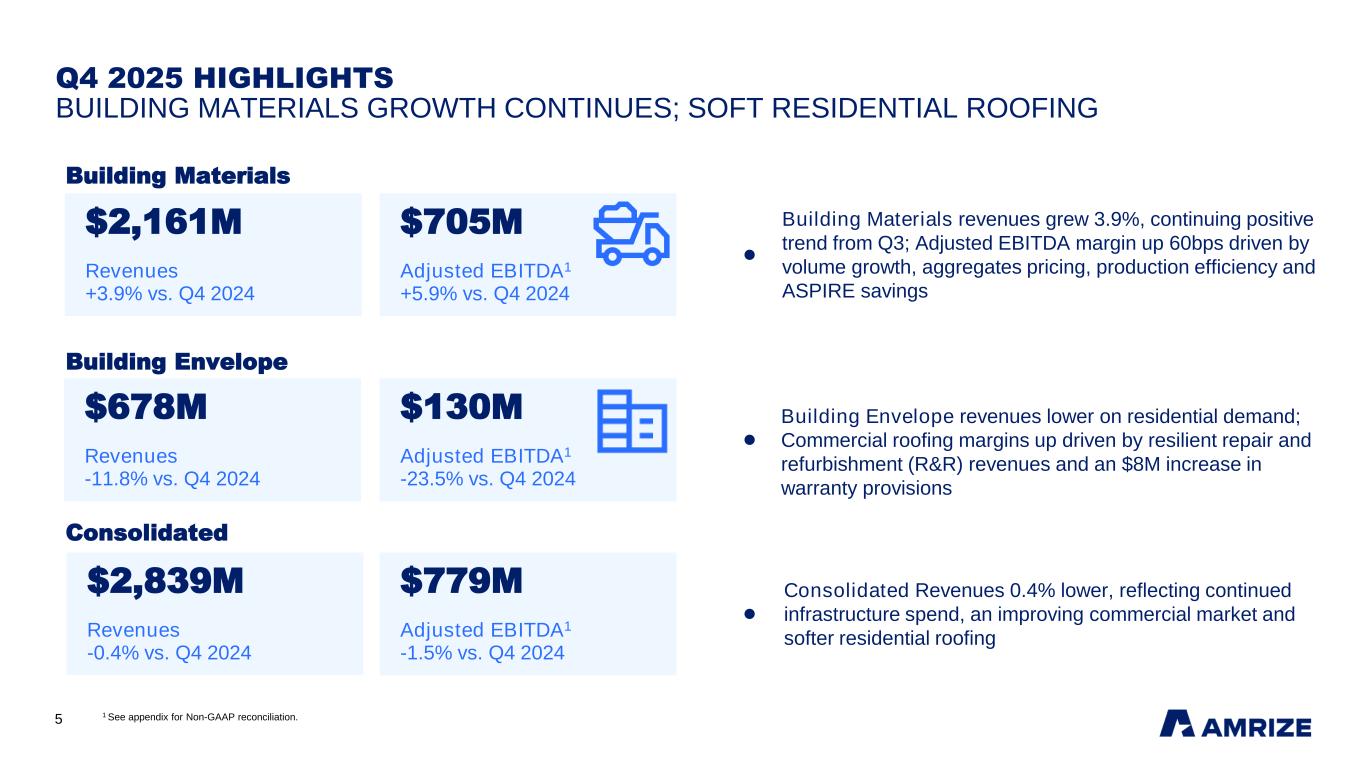 4 FULL YEAR 2025 HIGHLIGHTS STRONG FREE CASH FLOW GENERATION; SHAREHOLDER RETURN PLAN PROPOSED 1 See appendix for Non-GAAP reconciliation. 2 Amrize Board of Directors approved a share repurchase authorization for up to $1.0 billion, with a 12-month expiration, pending approval of the 2025 financial statements at the Annual General Meeting. 3 Dividends will be paid out of legal capital reserves from tax capital contributions and are not subject to Swiss withholding tax. 4 Amrize Board of Directors proposes a special one-time dividend of $0.44 per share, to be paid following shareholder approval at the Annual General Meeting. 5 Amrize Board of Directors proposes an annual ordinary dividend of $0.44 per share, to be paid in up to four quarterly installments at the discretion of the Board, following shareholder approval at the Annual General Meeting. 6 These are forward-looking, Non-GAAP financial measures. Please refer to slide 21 for additional information. $11.8B Revenues +0.9% vs. FY 2024 $3.0B Adjusted EBITDA1 -5.5% vs. FY 2024 $1.5B Free Cash Flow1 vs. $1.7B in FY 2024 49% Cash Conversion1 vs. 54% in FY 2024 $788M CapEx vs. $642M in FY 2024 1.1x Net Leverage Ratio1 vs. guidance of <1.5x FY 2025 $0.44 Annual ordinary Dividend3,5 $1.0B Share Repurchase2 Shareholder Return 2026 Guidance6 +8% to +11% +4% to +6% Adjusted EBITDA Revenues $0.44 Special one-time Dividend3,4