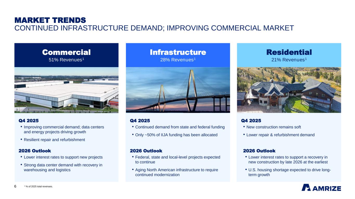 5 Q4 2025 HIGHLIGHTS BUILDING MATERIALS GROWTH CONTINUES; SOFT RESIDENTIAL ROOFING 1 See appendix for Non-GAAP reconciliation. $2,161M Revenues +3.9% vs. Q4 2024 $705M Adjusted EBITDA1 +5.9% vs. Q4 2024 $678M Revenues -11.8% vs. Q4 2024 $130M Adjusted EBITDA1 -23.5% vs. Q4 2024 Building Materials Building Envelope $2,839M Revenues -0.4% vs. Q4 2024 $779M Adjusted EBITDA1 -1.5% vs. Q4 2024 Consolidated Building Materials revenues grew 3.9%, continuing positive trend from Q3; Adjusted EBITDA margin up 60bps driven by volume growth, aggregates pricing, production efficiency and ASPIRE savings Building Envelope revenues lower on residential demand; Commercial roofing margins up driven by resilient repair and refurbishment (R&R) revenues and an $8M increase in warranty provisions Consolidated Revenues 0.4% lower, reflecting continued infrastructure spend, an improving commercial market and softer residential roofing