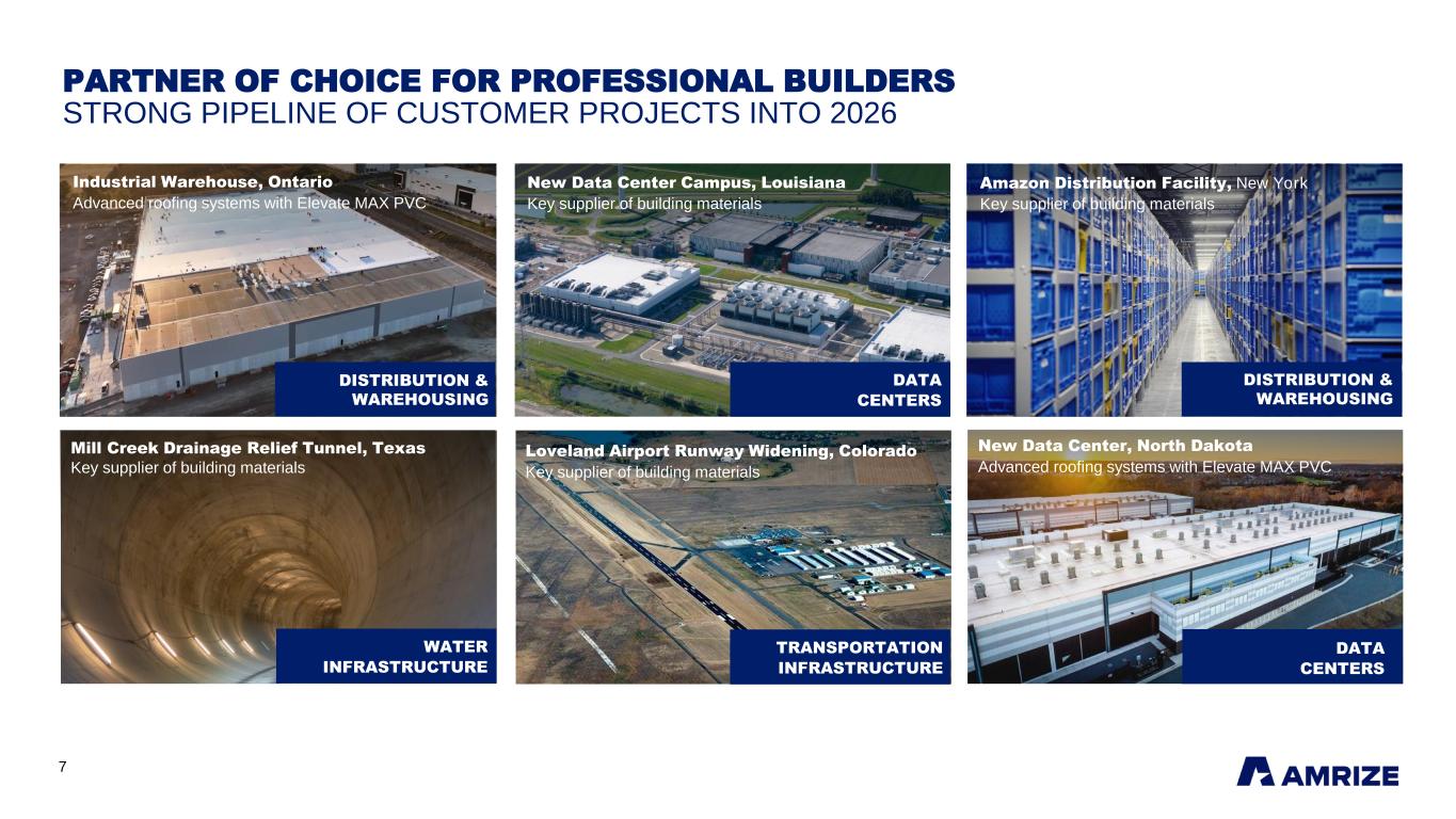6 Commercial 51% Revenues1 Infrastructure 28% Revenues1 Residential 21% Revenues1 MARKET TRENDS CONTINUED INFRASTRUCTURE DEMAND; IMPROVING COMMERCIAL MARKET 1 % of 2025 total revenues. 2026 Outlook • Lower interest rates to support new projects • Strong data center demand with recovery in warehousing and logistics Q4 2025 • Improving commercial demand; data centers and energy projects driving growth • Resilient repair and refurbishment 2026 Outlook • Federal, state and local-level projects expected to continue • Aging North American infrastructure to require continued modernization Q4 2025 • Continued demand from state and federal funding • Only ~50% of IIJA funding has been allocated 2026 Outlook • Lower interest rates to support a recovery in new construction by late 2026 at the earliest • U.S. housing shortage expected to drive long- term growth Q4 2025 • New construction remains soft • Lower repair & refurbishment demand