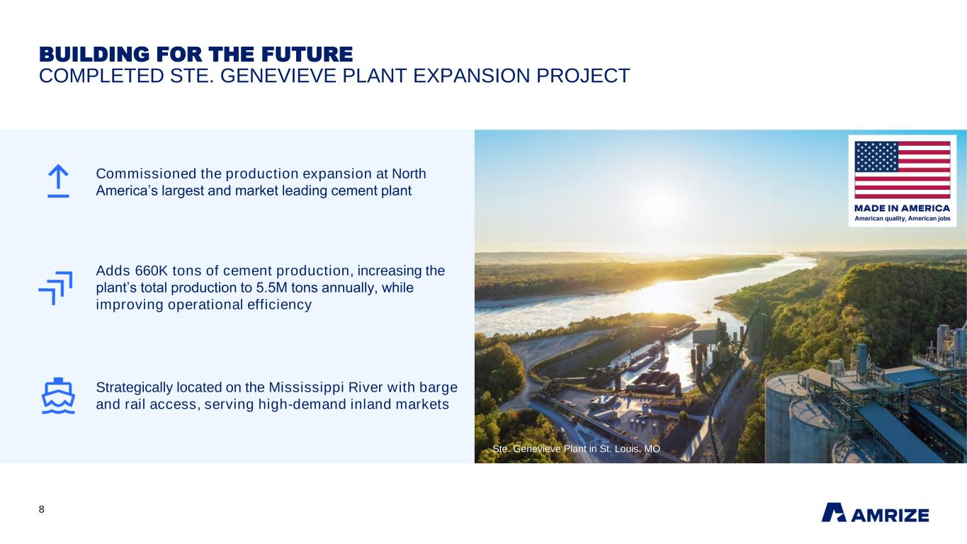7 PARTNER OF CHOICE FOR PROFESSIONAL BUILDERS STRONG PIPELINE OF CUSTOMER PROJECTS INTO 2026 New Data Center Campus, Louisiana Key supplier of building materials Project Nova Distribution Center, Minnesota ~80K cubic yards of ready-mix concrete Industrial Warehouse, Ontario Advanced roofing systems with Elevate MAX PVC DATA CENTERS DATA CENTERS DISTRIBUTION & WAREHOUSING TRANSPORTATION INFRASTRUCTURE Mill Creek Drainage Relief Tunnel, Texas Key supplier of building materials WATER INFRASTRUCTURE New Data Center, North Dakota Advanced roofing systems with Elevate MAX PVC Loveland Airport Runway Widening, Colorado Key supplier of building materials Amazon Distribution Facility, N w York Key supplier of building materials DISTRIBUTION & WAREHOUSING
