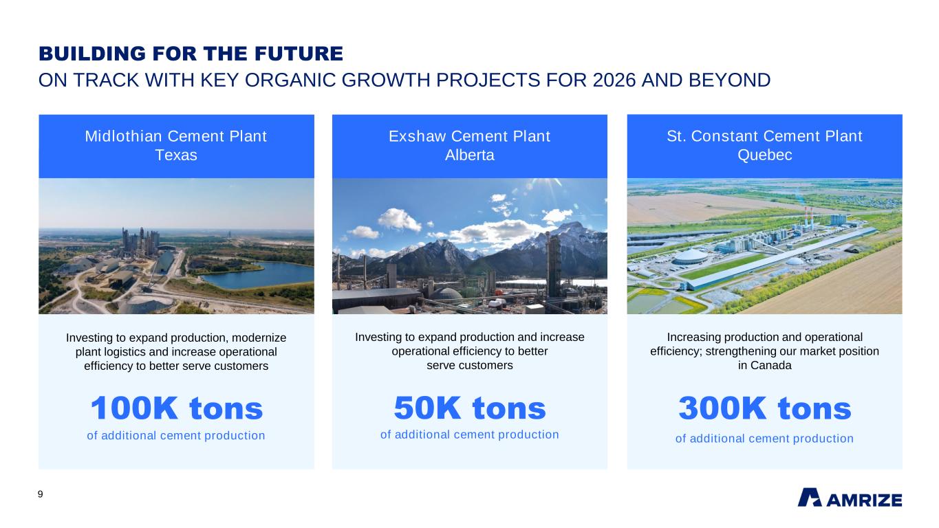 8 BUILDING FOR THE FUTURE COMPLETED STE. GENEVIEVE PLANT EXPANSION PROJECT Strategically located on the Mississippi River with barge and rail access, serving high-demand inland markets Commissioned the production expansion at North America’s largest and market leading cement plant Ste. Genevieve Plant in St. Louis, MO Adds 660K tons of cement production, increasing the plant’s total production to 5.5M tons annually, while improving operational efficiency