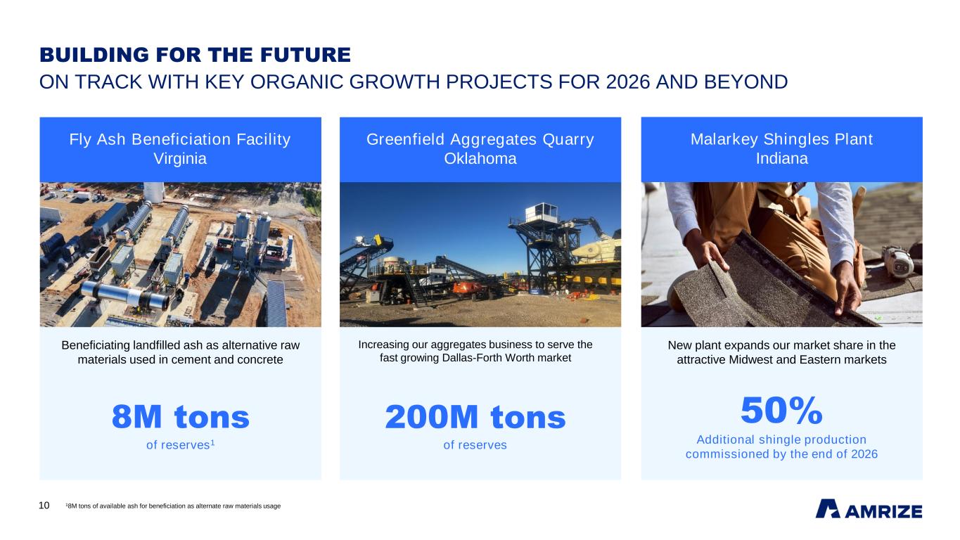 9 Midlothian Cement Plant Texas BUILDING FOR THE FUTURE ON TRACK WITH KEY ORGANIC GROWTH PROJECTS FOR 2026 AND BEYOND Exshaw Cement Plant Alberta St. Constant Cement Plant Quebec Increasing production and operational efficiency; strengthening our market position in Canada Investing to expand production, modernize plant logistics and increase operational efficiency to better serve customers Investing to expand production and increase operational efficiency to better serve customers 100K tons of additional cement production 50K tons of additional cement production 300K tons of additional cement production