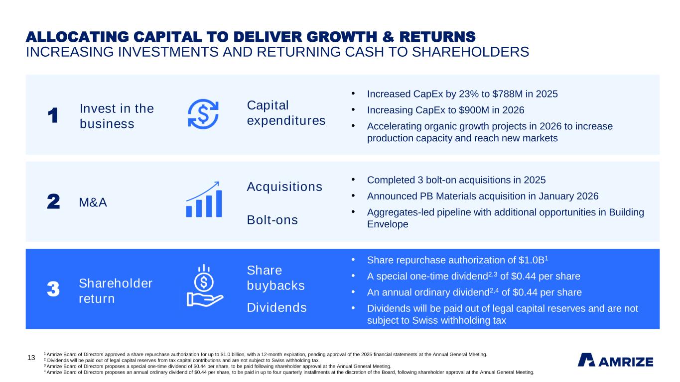 13 Invest in the business M&A Shareholder return Capital expenditures1 2 3 • Share repurchase authorization of $1.0B1 • A special one-time dividend2,3 of $0.44 per share • An annual ordinary dividend2,4 of $0.44 per share • Dividends will be paid out of legal capital reserves and are not subject to Swiss withholding tax Share buybacks • Completed 3 bolt-on acquisitions in 2025 • Announced PB Materials acquisition in January 2026 • Aggregates-led pipeline with additional opportunities in Building Envelope Dividends ALLOCATING CAPITAL TO DELIVER GROWTH & RETURNS INCREASING INVESTMENTS AND RETURNING CASH TO SHAREHOLDERS Bolt-ons Acquisitions 1 Amrize Board of Directors approved a share repurchase authorization for up to $1.0 billion, with a 12-month expiration, pending approval of the 2025 financial statements at the Annual General Meeting. 2 Dividends will be paid out of legal capital reserves from tax capital contributions and are not subject to Swiss withholding tax. 3 Amrize Board of Directors proposes a special one-time dividend of $0.44 per share, to be paid following shareholder approval at the Annual General Meeting. 4 Amrize Board of Directors proposes an annual ordinary dividend of $0.44 per share, to be paid in up to four quarterly installments at the discretion of the Board, following shareholder approval at the Annual General Meeting. • Increased CapEx by 23% to $788M in 2025 • Increasing CapEx to $900M in 2026 • Accelerating organic growth projects in 2026 to increase production capacity and reach new markets