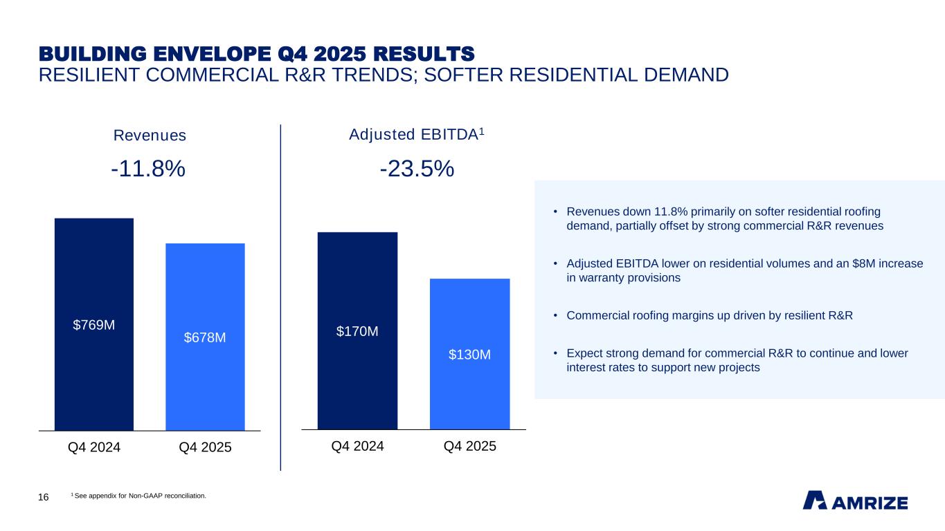 15 BUILDING MATERIALS Q4 2025 RESULTS GROWTH CONTINUES; STRONG MARGIN EXPANSION 1 See appendix for Non-GAAP reconciliation. 2 Cement volume and pricing figures presented above exclude trading. Aggregates pricing figures presented above are freight adjusted, excluding freight revenues. Cement and Aggregates pricing figures presented above are constant currency, which reflects price adjusted to prior period foreign exchange rates. $2,080M $2,161M Q4 2024 Q4 2025 $666M $705M Q4 2024 Q4 2025 Adjusted EBITDA1Revenues • Revenues grew 3.9% driven by higher volumes and continued aggregates pricing growth • Cement2 volumes up 3.6% with 0.8% lower pricing • Aggregates2 volumes increased 3.0% with freight adjusted pricing up 3.8% (including freight up 7.3%) • Adjusted EBITDA margin up 60bps driven by volume growth, aggregates pricing, production efficiency and ASPIRE savings +3.9% +5.9%