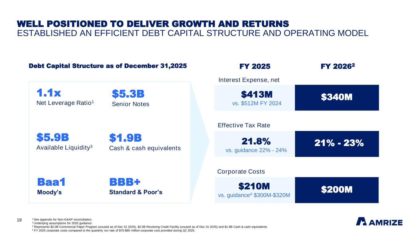 18 STRONG BALANCE SHEET & FOUNDATION FOR GROWTH ACHIEVED NET LEVERAGE RATIO OF 1.1X VS. GUIDANCE <1.5X 1 See appendix for Non-GAAP reconciliation 2 Net Leverage Ratio based on trailing twelve month Adjusted EBITDA. $5,597M $4,985M $3,347M Q2 2025 Q3 2025 Q4 2025 Net Debt1 (as of quarter end) 1.8x 1.7x 1.1x Q2 2025 Q3 2025 Q4 2025 Net Leverage Ratio1,2 (as of quarter end)