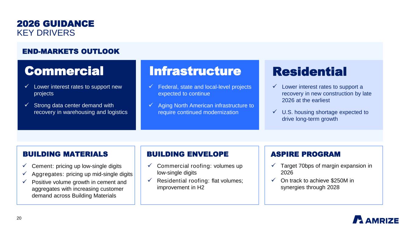 20 2026 GUIDANCE KEY DRIVERS END-MARKETS OUTLOOK BUILDING MATERIALS ✓ Cement: pricing up low-single digits ✓ Aggregates: pricing up mid-single digits ✓ Positive volume growth in cement and aggregates with increasing customer demand across Building Materials ASPIRE PROGRAM ✓ Lower interest rates to support a recovery in new construction by late 2026 at the earliest ✓ U.S. housing shortage expected to drive long-term growth BUILDING ENVELOPE ✓ Commercial roofing: volumes up low-single digits ✓ Residential roofing: flat volumes; improvement in H2 InfrastructureCommercial Residential ✓ Target 70bps of margin expansion in 2026 ✓ On track to achieve $250M in synergies through 2028 ✓ Federal, state and local-level projects expected to continue ✓ Aging North American infrastructure to require continued modernization ✓ Lower interest rates to support new projects ✓ Strong data center demand with recovery in warehousing and logistics