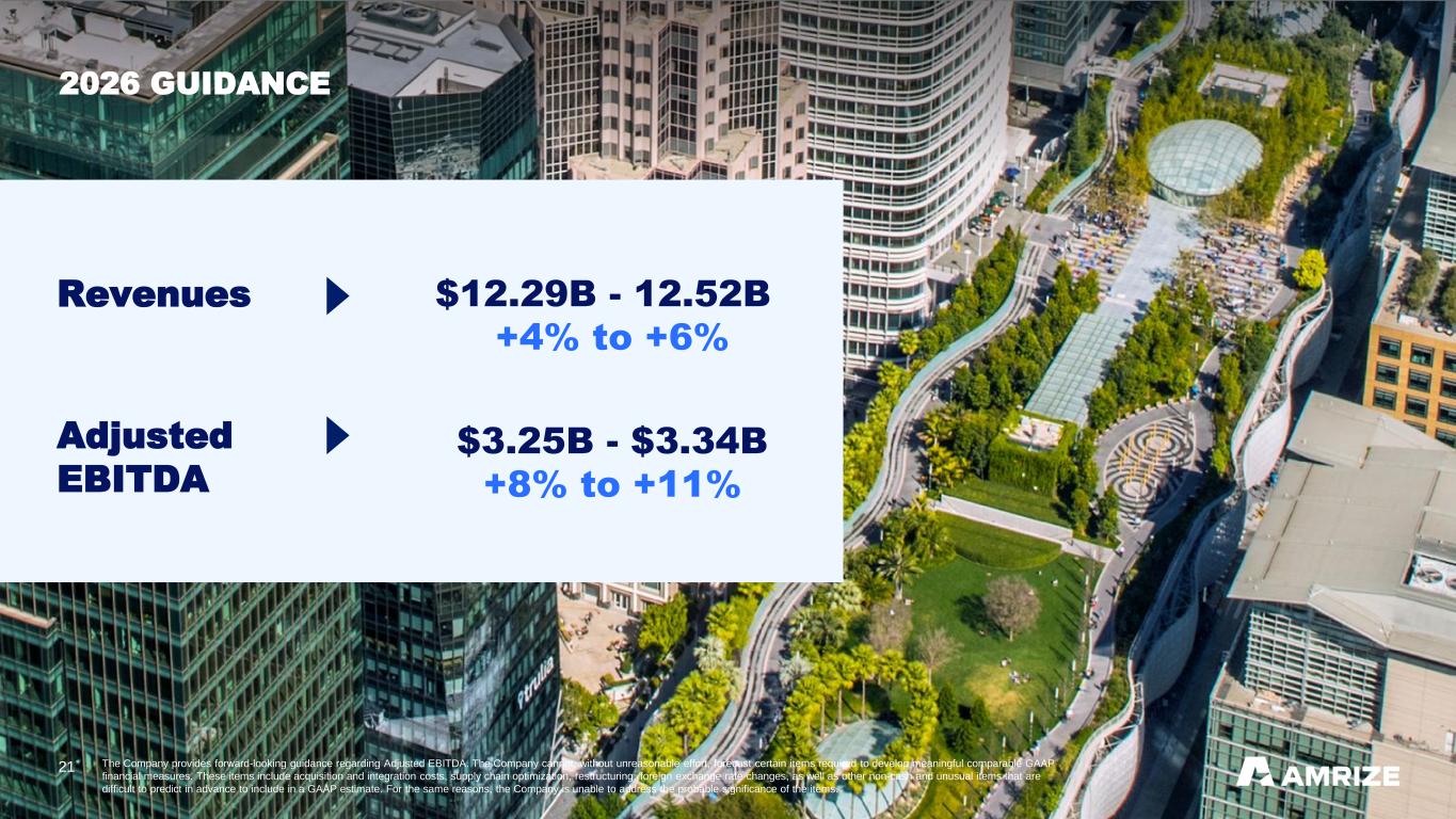 21 2026 GUIDANCE Revenues $12.29B - 12.52B +4% to +6% Adjusted EBITDA $3.25B - $3.34B +8% to +11% The Company provides forward-looking guidance regarding Adjusted EBITDA. The Company cannot, without unreasonable effort, forecast certain items required to develop meaningful comparable GAAP financial measures. These items include acquisition and integration costs, supply chain optimization, restructuring, foreign exchange rate changes, as well as other non-cash and unusual items that are difficult to predict in advance to include in a GAAP estimate. For the same reasons, the Company is unable to address the probable significance of the items.