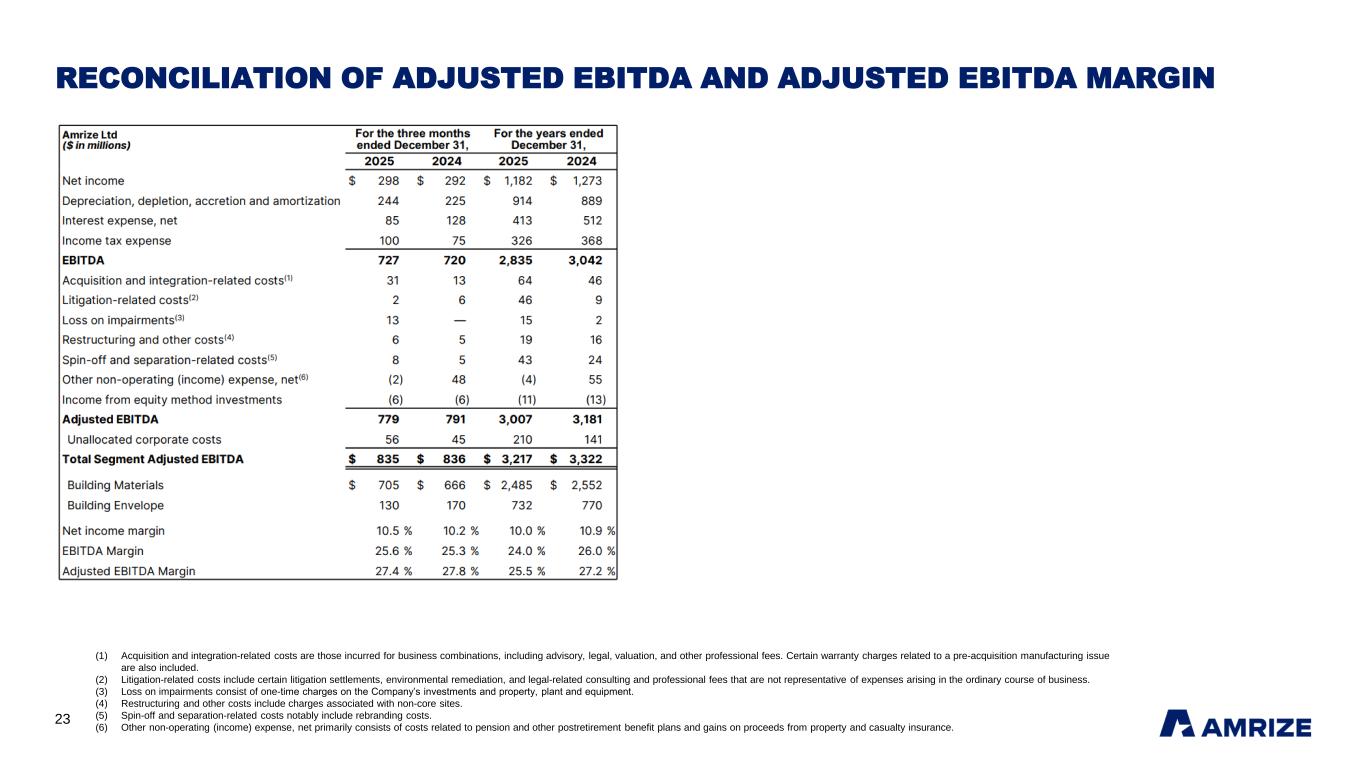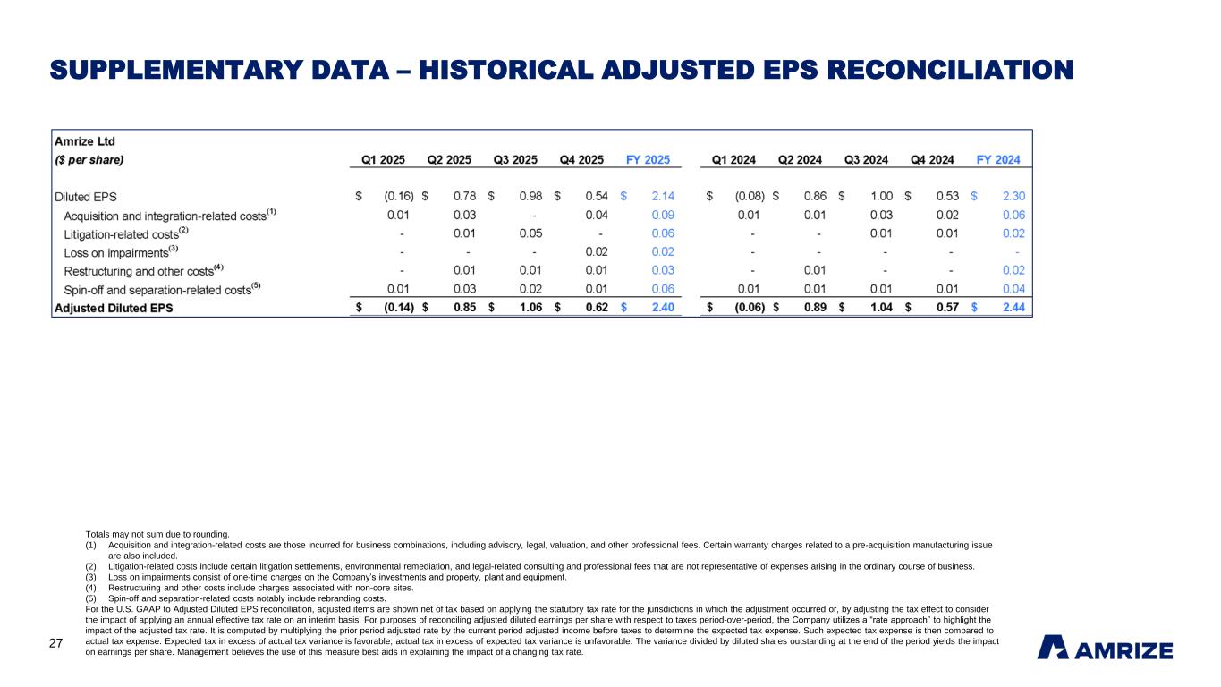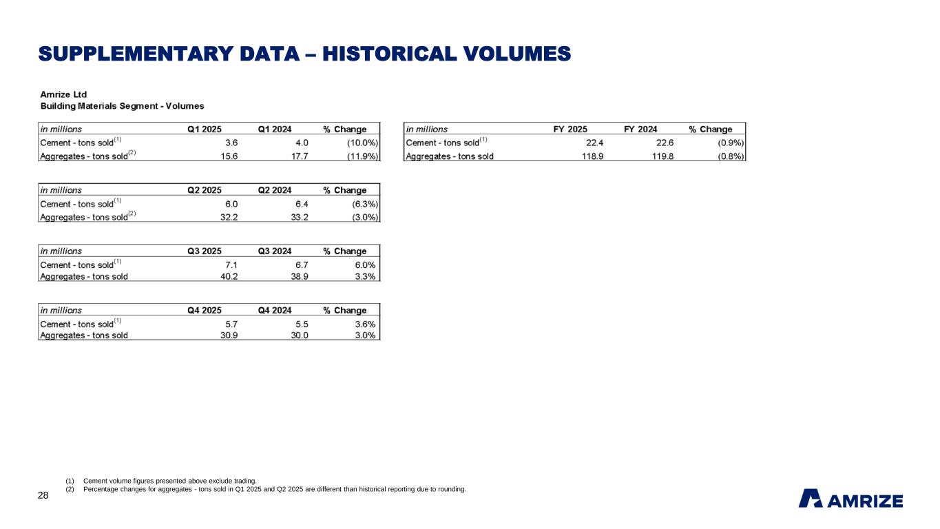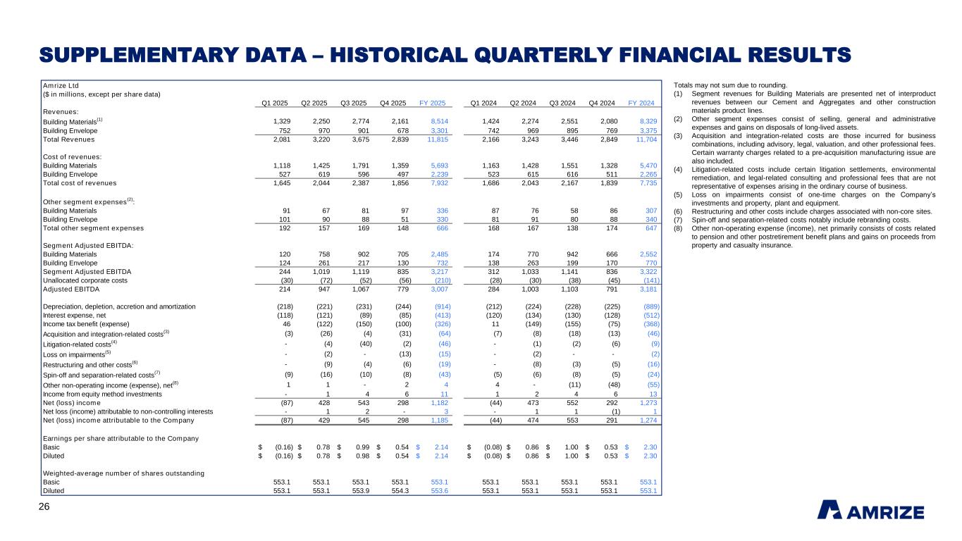 26 SUPPLEMENTARY DATA – HISTORICAL QUARTERLY FINANCIAL RESULTS Totals may not sum due to rounding. (1) Segment revenues for Building Materials are presented net of interproduct revenues between our Cement and Aggregates and other construction materials product lines. (2) Other segment expenses consist of selling, general and administrative expenses and gains on disposals of long-lived assets. (3) Acquisition and integration-related costs are those incurred for business combinations, including advisory, legal, valuation, and other professional fees. Certain warranty charges related to a pre-acquisition manufacturing issue are also included. (4) Litigation-related costs include certain litigation settlements, environmental remediation, and legal-related consulting and professional fees that are not representative of expenses arising in the ordinary course of business. (5) Loss on impairments consist of one-time charges on the Company’s investments and property, plant and equipment. (6) Restructuring and other costs include charges associated with non-core sites. (7) Spin-off and separation-related costs notably include rebranding costs. (8) Other non-operating expense (income), net primarily consists of costs related to pension and other postretirement benefit plans and gains on proceeds from property and casualty insurance. Amrize Ltd ($ in millions, except per share data) Q1 2025 Q2 2025 Q3 2025 Q4 2025 FY 2025 Q1 2024 Q2 2024 Q3 2024 Q4 2024 FY 2024 Revenues: Building Materials (1) 1,329 2,250 2,774 2,161 8,514 1,424 2,274 2,551 2,080 8,329 Building Envelope 752 970 901 678 3,301 742 969 895 769 3,375 Total Revenues 2,081 3,220 3,675 2,839 11,815 2,166 3,243 3,446 2,849 11,704 Cost of revenues: Building Materials 1,118 1,425 1,791 1,359 5,693 1,163 1,428 1,551 1,328 5,470 Building Envelope 527 619 596 497 2,239 523 615 616 511 2,265 Total cost of revenues 1,645 2,044 2,387 1,856 7,932 1,686 2,043 2,167 1,839 7,735 Other segment expenses (2) : Building Materials 91 67 81 97 336 87 76 58 86 307 Building Envelope 101 90 88 51 330 81 91 80 88 340 Total other segment expenses 192 157 169 148 666 168 167 138 174 647 Segment Adjusted EBITDA: Building Materials 120 758 902 705 2,485 174 770 942 666 2,552 Building Envelope 124 261 217 130 732 138 263 199 170 770 Segment Adjusted EBITDA 244 1,019 1,119 835 3,217 312 1,033 1,141 836 3,322 Unallocated corporate costs (30) (72) (52) (56) (210) (28) (30) (38) (45) (141) Adjusted EBITDA 214 947 1,067 779 3,007 284 1,003 1,103 791 3,181 Depreciation, depletion, accretion and amortization (218) (221) (231) (244) (914) (212) (224) (228) (225) (889) Interest expense, net (118) (121) (89) (85) (413) (120) (134) (130) (128) (512) Income tax benefit (expense) 46 (122) (150) (100) (326) 11 (149) (155) (75) (368) Acquisition and integration-related costs (3) (3) (26) (4) (31) (64) (7) (8) (18) (13) (46) Litigation-related costs (4) - (4) (40) (2) (46) - (1) (2) (6) (9) Loss on impairments (5) - (2) - (13) (15) - (2) - - (2) Restructuring and other costs (6) - (9) (4) (6) (19) - (8) (3) (5) (16) Spin-off and separation-related costs (7) (9) (16) (10) (8) (43) (5) (6) (8) (5) (24) Other non-operating income (expense), net (8) 1 1 - 2 4 4 - (11) (48) (55) Income from equity method investments - 1 4 6 11 1 2 4 6 13 Net (loss) income (87) 428 543 298 1,182 (44) 473 552 292 1,273 Net loss (income) attributable to non-controlling interests - 1 2 - 3 - 1 1 (1) 1 Net (loss) income attributable to the Company (87) 429 545 298 1,185 (44) 474 553 291 1,274 Earnings per share attributable to the Company Basic $ (0.16) $ 0.78 $ 0.99 $ 0.54 $ 2.14 $ (0.08) $ 0.86 $ 1.00 $ 0.53 $ 2.30 Diluted $ (0.16) $ 0.78 $ 0.98 $ 0.54 $ 2.14 $ (0.08) $ 0.86 $ 1.00 $ 0.53 $ 2.30 Weighted-average number of shares outstanding Basic 553.1 553.1 553.1 553.1 553.1 553.1 553.1 553.1 553.1 553.1 Diluted 553.1 553.1 553.9 554.3 553.6 553.1 553.1 553.1 553.1 553.1