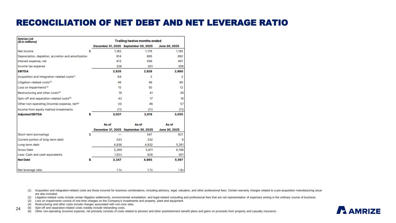 24 RECONCILIATION OF NET DEBT AND NET LEVERAGE RATIO (1) Acquisition and integration-related costs are those incurred for business combinations, including advisory, legal, valuation, and other professional fees. Certain warranty charges related to a pre-acquisition manufacturing issue are also included. (2) Litigation-related costs include certain litigation settlements, environmental remediation, and legal-related consulting and professional fees that are not representative of expenses arising in the ordinary course of business. (3) Loss on impairments consist of one-time charges on the Company’s investments and property, plant and equipment. (4) Restructuring and other costs include charges associated with non-core sites. (5) Spin-off and separation-related costs notably include rebranding costs. (6) Other non-operating (income) expense, net primarily consists of costs related to pension and other postretirement benefit plans and gains on proceeds from property and casualty insurance.