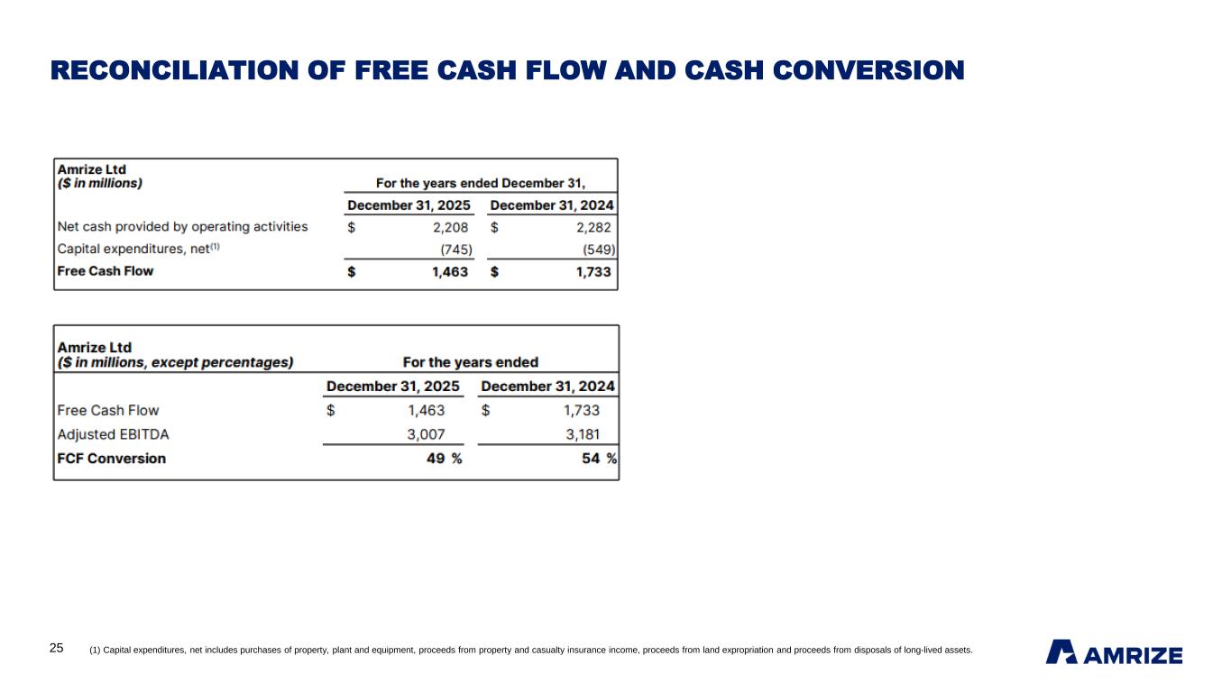 25 RECONCILIATION OF FREE CASH FLOW AND CASH CONVERSION (1) Capital expenditures, net includes purchases of property, plant and equipment, proceeds from property and casualty insurance income, proceeds from land expropriation and proceeds from disposals of long-lived assets.