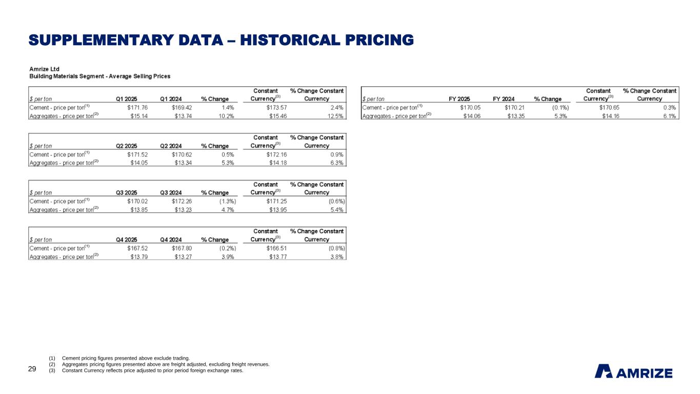 28 SUPPLEMENTARY DATA – HISTORICAL VOLUMES (1) Cement volume figures presented above exclude trading. (2) Percentage changes for aggregates - tons sold in Q1 2025 and Q2 2025 are different than historical reporting due to rounding.
