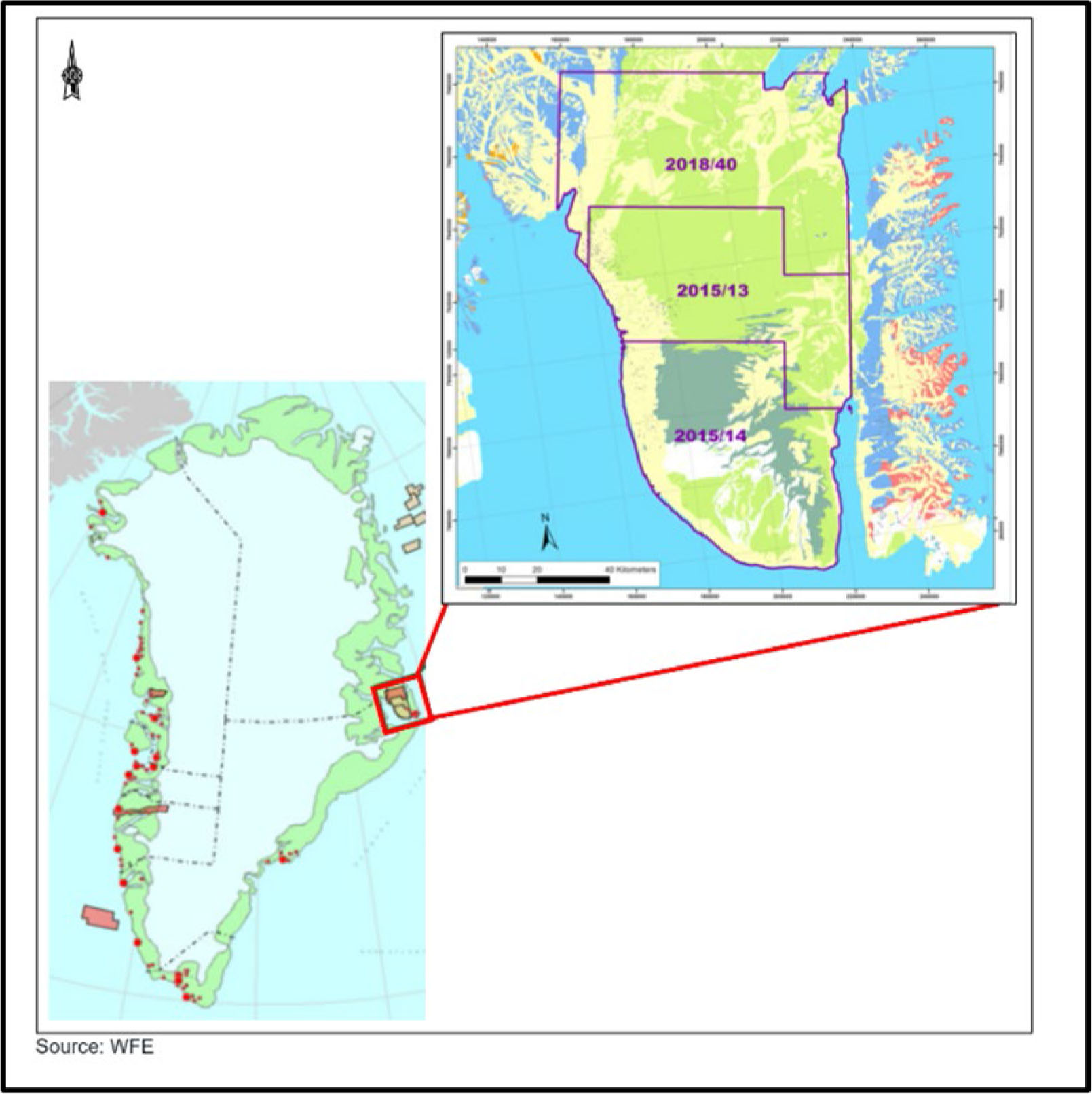 The Jameson Land Basin has decades of exploration history primarily conducted by ARCO Oil and Gas Company from 1985 to 1990. There was no exploration activity for twenty-five years until White Flame Energy (WFE) then won an open tender for blocks 2015/13 and 2015/14 in 2014 and applied for and won 2018/40 in 2018. In 2025 80 Mile (formerly Bluejay Mining) acquired White Flame Energy. Over the course of this time the Geological Survey of Denmark and Greenland (GEUS) has conducted several geological and geophysical investigations.