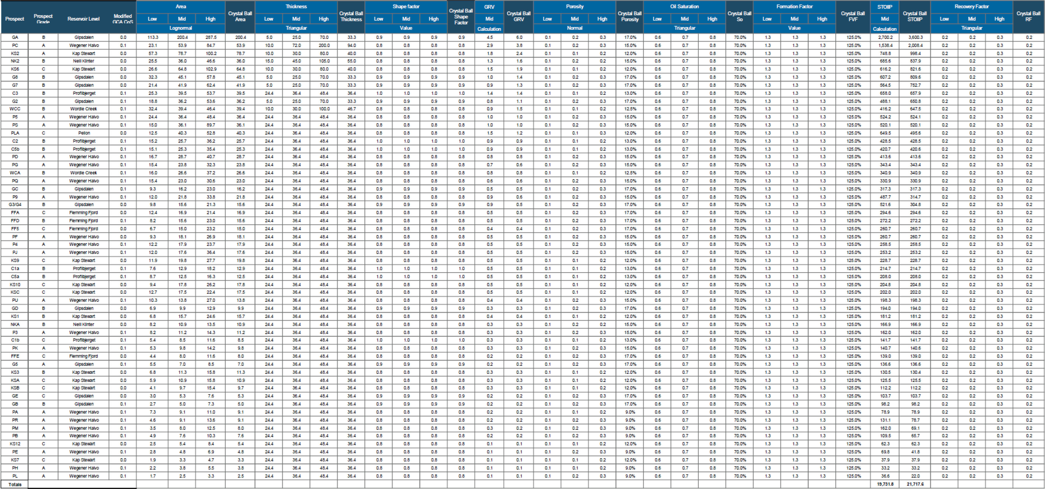 Sproule ERCE calculated a probabilistic range of Original Oil in Place (OOIP) and a Gross Recoverable Oil for each individual prospect of the fifty-eight prospects on the 80M list. As the GCA single factor was within the Low to High range of 80M and the 80M range was reasonable and matched data from the ARCO and GUES reports Sproule ERCE used the 80M reservoir parameters as inputs to the probabilistic runs. Sproule ERCE set the distributions of the factors as noted in Appendix A and the values used can be reviewed in Appendix A. The results of the probabilistic runs are shown in Appendix B.