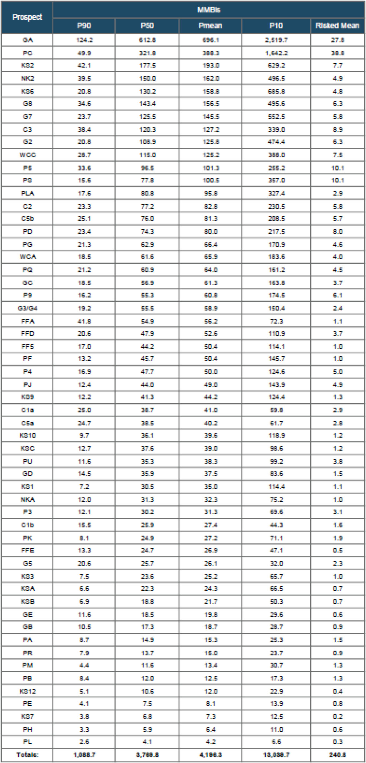 These resource assessments have been done according to PRMS standards using the P90 (1U) \ Pmean (2U) \ P10 (3U) ranges and nomenclature. Standard Geologic Chance of Success (Pg) and Chance of Commercial Development (Pc) have been assessed for 3 drilling prospects. The purpose of this report will be both to give an independent validation of the exploration potential and to show that beyond the current drilling campaign there are already a large number of identified prospects, with associated volumes, and that within the greater basin as exploration continues with additional seismic data there is the potential for continued discoveries.