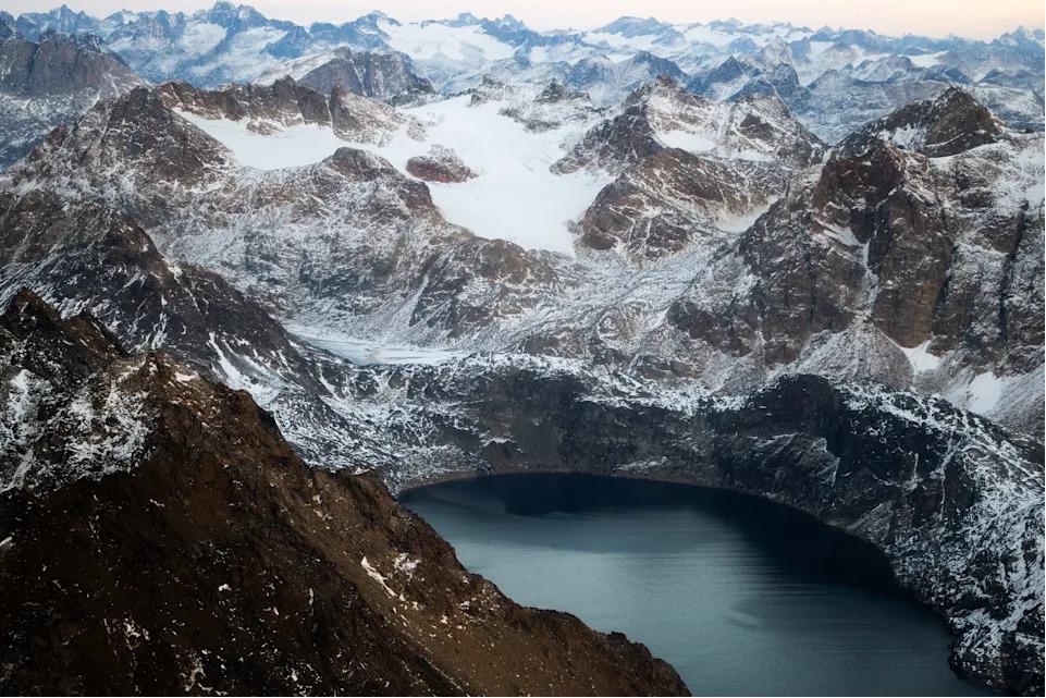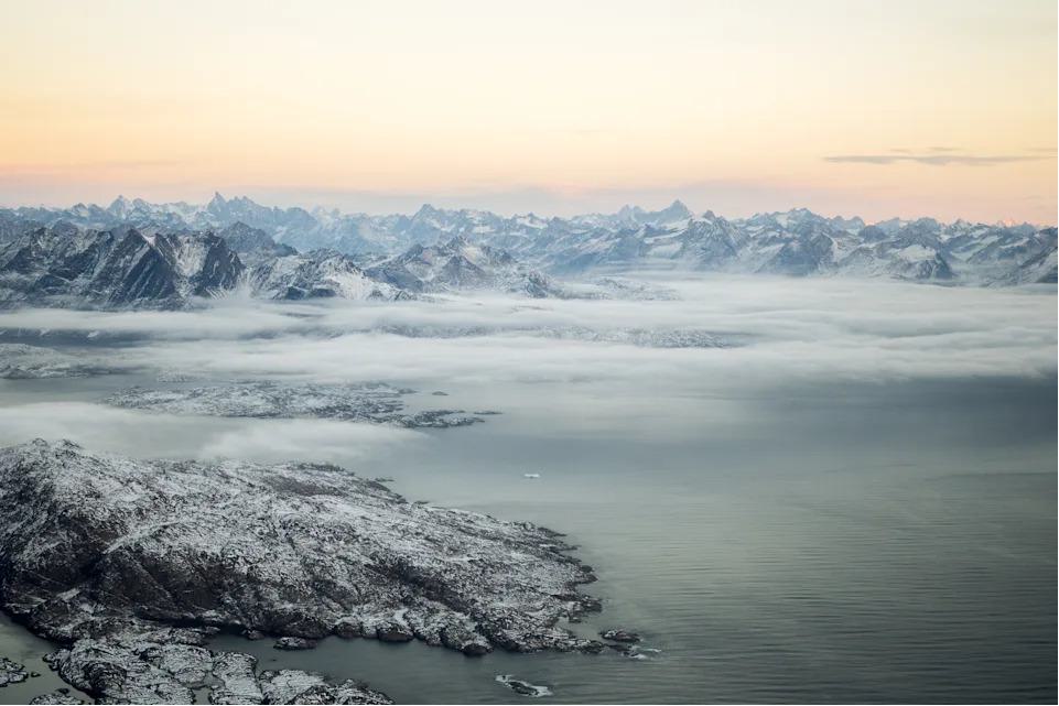 In the air over Greenland, outside of the settled regions, mountain ranges reach as far back as the horizon, cut by glaciers that have spent millions of years carving the landscape. The sky glows blue and yellow before reaching pitch-black darkness once the sun goes down, leaving only stars and the Northern Lights to illuminate swaths of the unsettled wilderness.