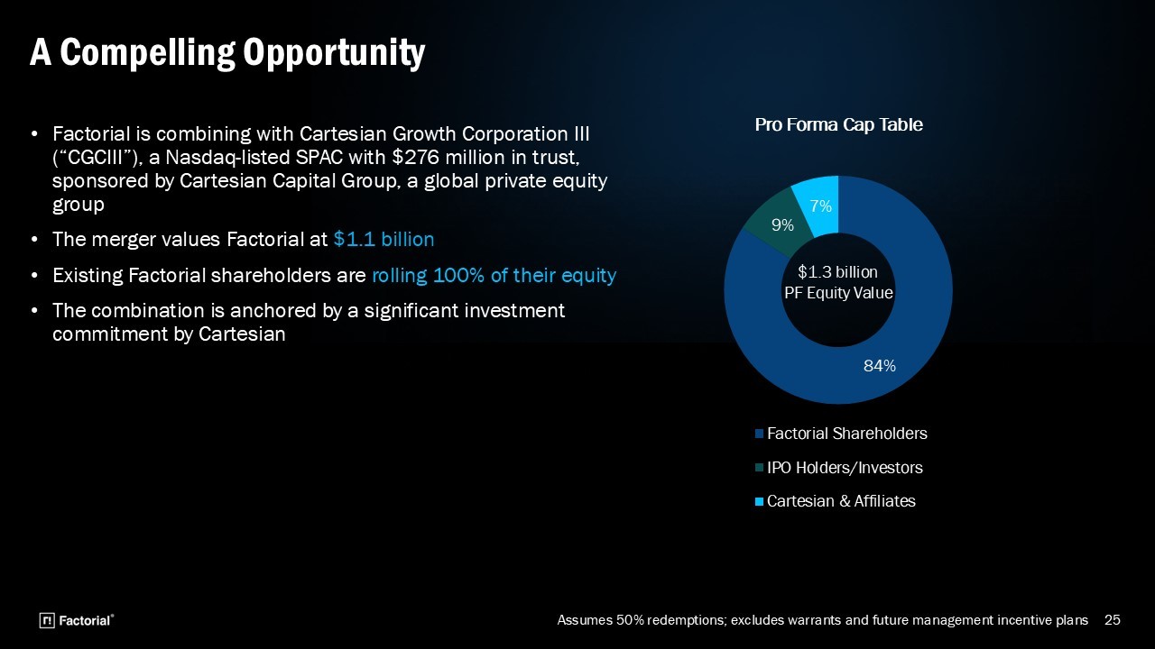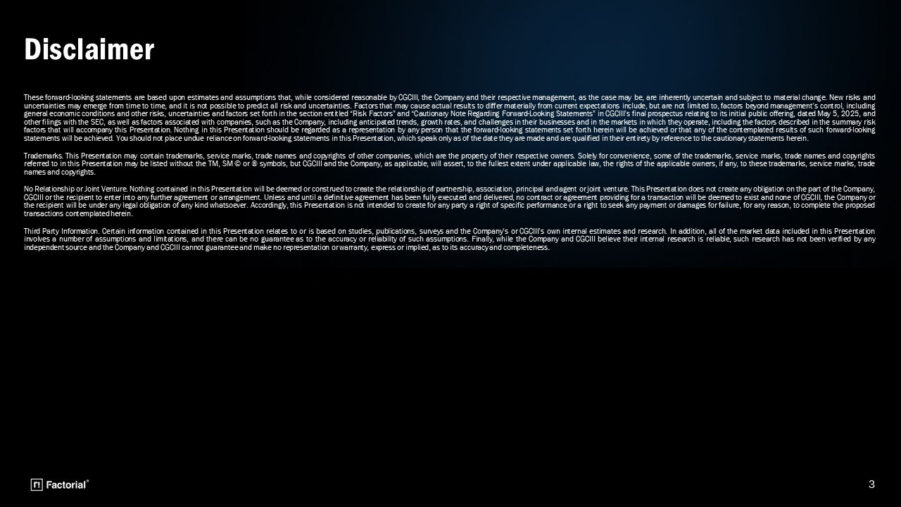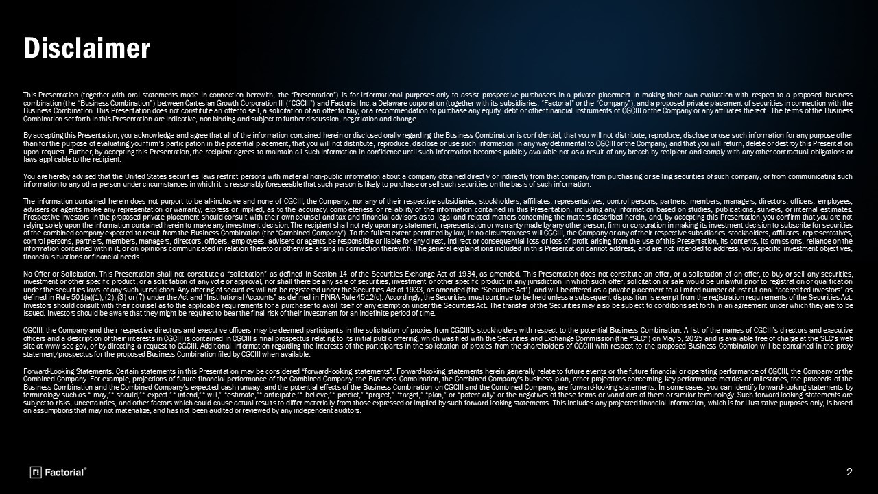2 This Presentation (together with oral statements made in connection herewith, the “Presentation”) is for informational purposes only to assist prospective purchasers in a private placement in making their own evaluation with respect to a proposed business combination (the “Business Combination”) between Cartesian Growth Corporation III (“CGCIII”) and Factorial Inc, a Delaware corporation (together with its subsidiaries, “Factorial” or the “Company”), and a proposed private placement of securities in connection with the Business Combination . This Presentation does not constitute an offer to sell, a solicitation of an offer to buy, or a recommendation to purchase any equity, debt or other financial instruments of CGCIII or the Company or any affiliates thereof . The terms of the Business Combination set forth in this Presentation are indicative, non - binding and subject to further discussion, negotiation and change . By accepting this Presentation, you acknowledge and agree that all of the information contained herein or disclosed orally regarding the Business Combination is confidential, that you will not distribute, reproduce, disclose or use such information for any purpose other than for the purpose of evaluating your firm’s participation in the potential placement, that you will not distribute, reproduce, disclose or use such information in any way detrimental to CGCIII or the Company, and that you will return, delete or destroy this Presentation upon request . Further, by accepting this Presentation, the recipient agrees to maintain all such information in confidence until such information becomes publicly available not as a result of any breach by recipient and comply with any other contractual obligations or laws applicable to the recipient . You are hereby advised that the United States securities laws restrict persons with material non - public information about a company obtained directly or indirectly from that company from purchasing or selling securities of such company, or from communicating such information to any other person under circumstances in which it is reasonably foreseeable that such person is likely to purchase or sell such securities on the basis of such information . The information contained herein does not purport to be all - inclusive and none of CGCIII, the Company, nor any of their respective subsidiaries, stockholders, affiliates, representatives, control persons, partners, members, managers, directors, officers, employees, advisers or agents make any representation or warranty, express or implied, as to the accuracy, completeness or reliability of the information contained in this Presentation, including any information based on studies, publications, surveys, or internal estimates . Prospective investors in the proposed private placement should consult with their own counsel and tax and financial advisors as to legal and related matters concerning the matters described herein, and, by accepting this Presentation, you confirm that you are not relying solely upon the information contained herein to make any investment decision . The recipient shall not rely upon any statement, representation or warranty made by any other person, firm or corporation in making its investment decision to subscribe for securities of the combined company expected to result from the Business Combination (the “Combined Company”) . To the fullest extent permitted by law, in no circumstances will CGCIII, the Company or any of their respective subsidiaries, stockholders, affiliates, representatives, control persons, partners, members, managers, directors, officers, employees, advisers or agents be responsible or liable for any direct, indirect or consequential loss or loss of profit arising from the use of this Presentation, its contents, its omissions, reliance on the information contained within it, or on opinions communicated in relation thereto or otherwise arising in connection therewith . The general explanations included in this Presentation cannot address, and are not intended to address, your specific investment objectives, financial situations or financial needs . No Offer or Solicitation . This Presentation shall not constitute a “solicitation” as defined in Section 14 of the Securities Exchange Act of 1934 , as amended . This Presentation does not constitute an offer, or a solicitation of an offer, to buy or sell any securities, investment or other specific product, or a solicitation of any vote or approval, nor shall there be any sale of securities, investment or other specific product in any jurisdiction in which such offer, solicitation or sale would be unlawful prior to registration or qualification under the securities laws of any such jurisdiction . Any offering of securities will not be registered under the Securities Act of 1933 , as amended (the “Securities Act”), and will be offered as a private placement to a limited number of institutional “accredited investors” as defined in Rule 501 (a)( 1 ), ( 2 ), ( 3 ) or ( 7 ) under the Act and “Institutional Accounts” as defined in FINRA Rule 4512 (c) . Accordingly, the Securities must continue to be held unless a subsequent disposition is exempt from the registration requirements of the Securities Act . Investors should consult with their counsel as to the applicable requirements for a purchaser to avail itself of any exemption under the Securities Act . The transfer of the Securities may also be subject to conditions set forth in an agreement under which they are to be issued . Investors should be aware that they might be required to bear the final risk of their investment for an indefinite period of time . CGCIII, the Company and their respective directors and executive o ffi cers may be deemed participants in the solicitation of proxies from CGCIII’s stockholders with respect to the potential Business Combination . A list of the names of CGCIII’s directors and exec