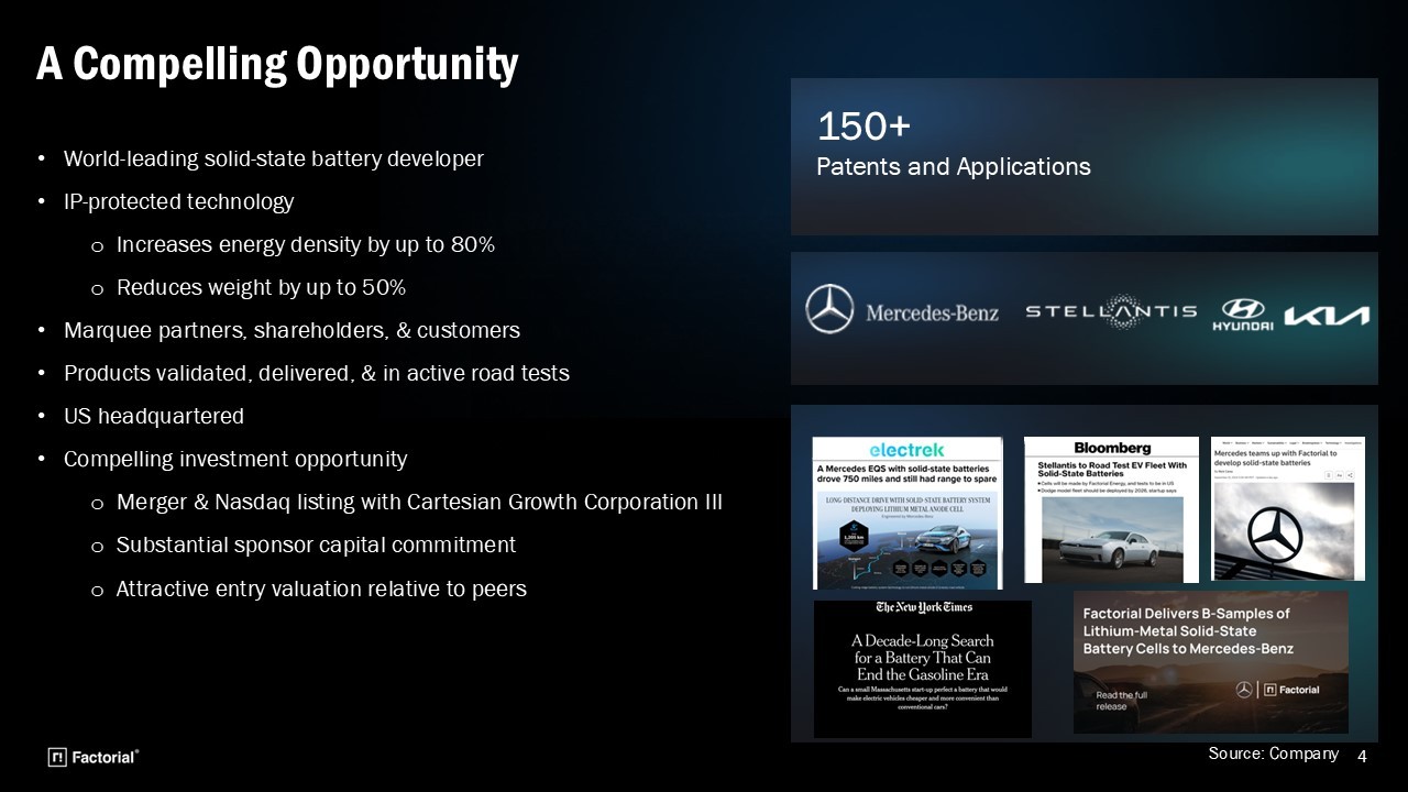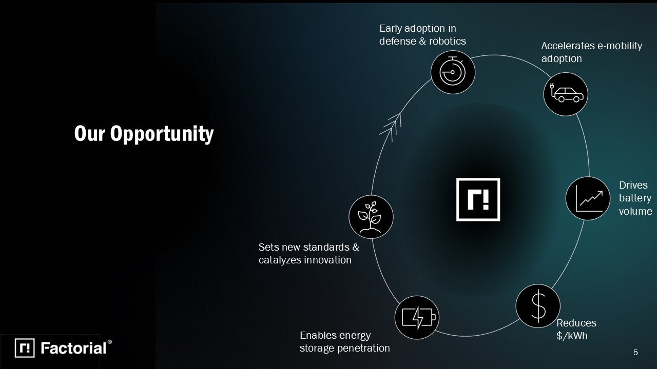 4 • World - leading solid - state battery developer • IP - protected technology o Increases energy density by up to 80% o Reduces weight by up to 50% • Marquee partners, shareholders, & customers • Products validated, delivered, & in active road tests • US headquartered • Compelling investment opportunity o Merger & Nasdaq listing with Cartesian Growth Corporation III o Substantial sponsor capital commitment o Attractive entry valuation relative to peers A Compelling Opportunity 150+ Patents and Applications Source: Company