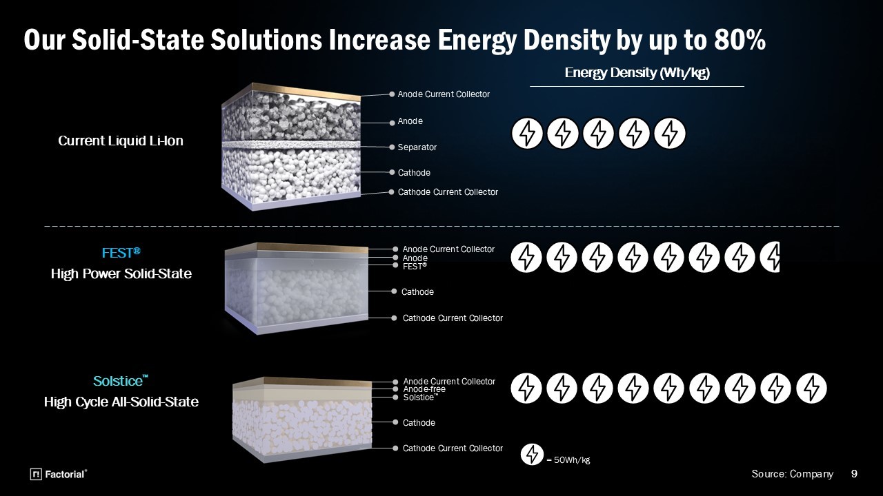 9 Our Solid - State Solutions Increase Energy Density by up to 80% 9 FEST ® High Power Solid - State Current Liquid Li - Ion Solstice High Cycle All - Solid - State Energy Density (Wh/kg) Energy Density ( Wh /kg) : 1. = 50Wh/kg Anode Current Collector Cathode Cathode Current Collector S eparator Anode Anode Current Collector Anode FEST ® Cathode Cathode Current Collector Anode Current Collector Solstice Cathode Cathode Current Collector Anode - free Source: Company