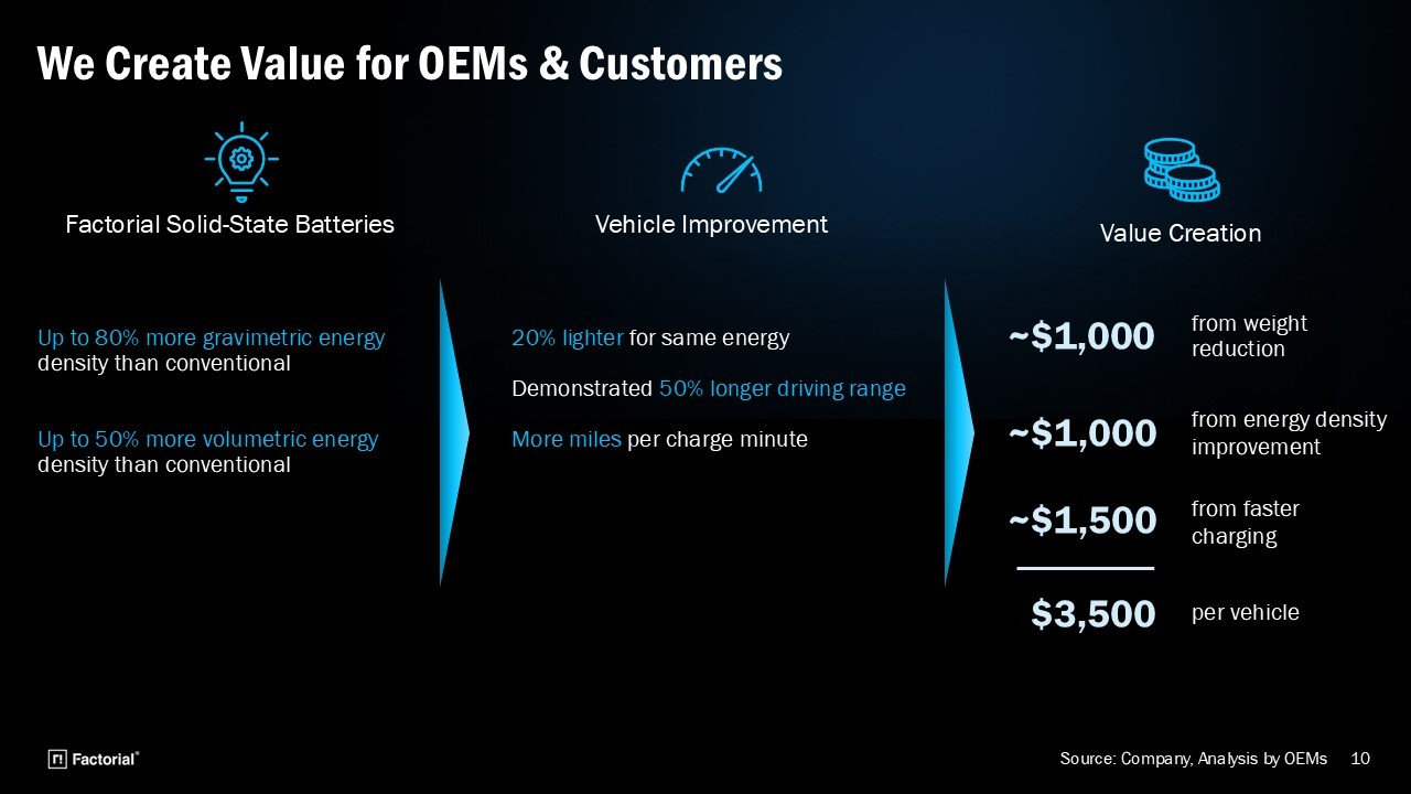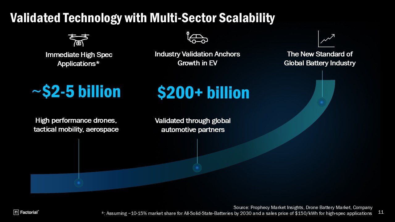 10 Factorial Solid - State Batteries Up to 80% more gravimetric energy density than conventional Up to 50% more volumetric energy density than conventional We Create Value for OEMs & Customers Vehicle Improvement 20% lighter for same energy Demonstrated 50% longer driving range More miles per charge minute from weight reduction ~$1,000 ~$1,000 ~$1,500 $3,500 Value Creation from energy density improvement from faster charging per vehicle Source: Company, Analysis by OEMs