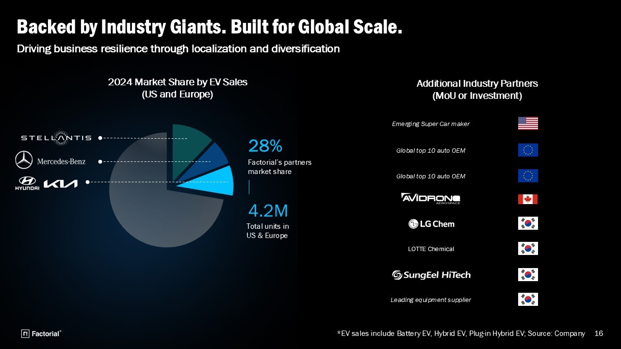 15 Positioned to Win *: Publicly disclosed partnership, not including undisclosed names; Source: Compan y, QuantumScape 1 * Announced Auto OEM partners * 4 * ~ 5Ah Product size released 100+Ah Ducati Motorcycle September 2025 Real - world driving demonstration 1,205 km record drive by Mercedes EQS completed from Stuttgart to Malmö September 2025 1 Product portfolios validated by OEMs 3 Technology license / royalties Development / service revenue Manufacturing / sales of battery cells Business Model Technology license / royalties Development / service revenue Material supply revenue Manufacturing / sales of battery cells $7 - 9 bn (spot market cap. Nov. 2025) Valuation $1.1 bn (current pre - merger)