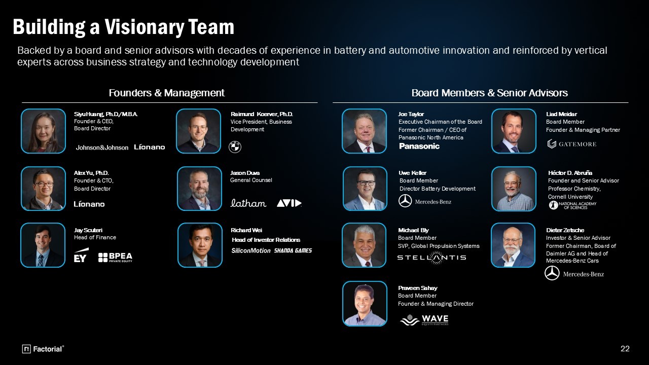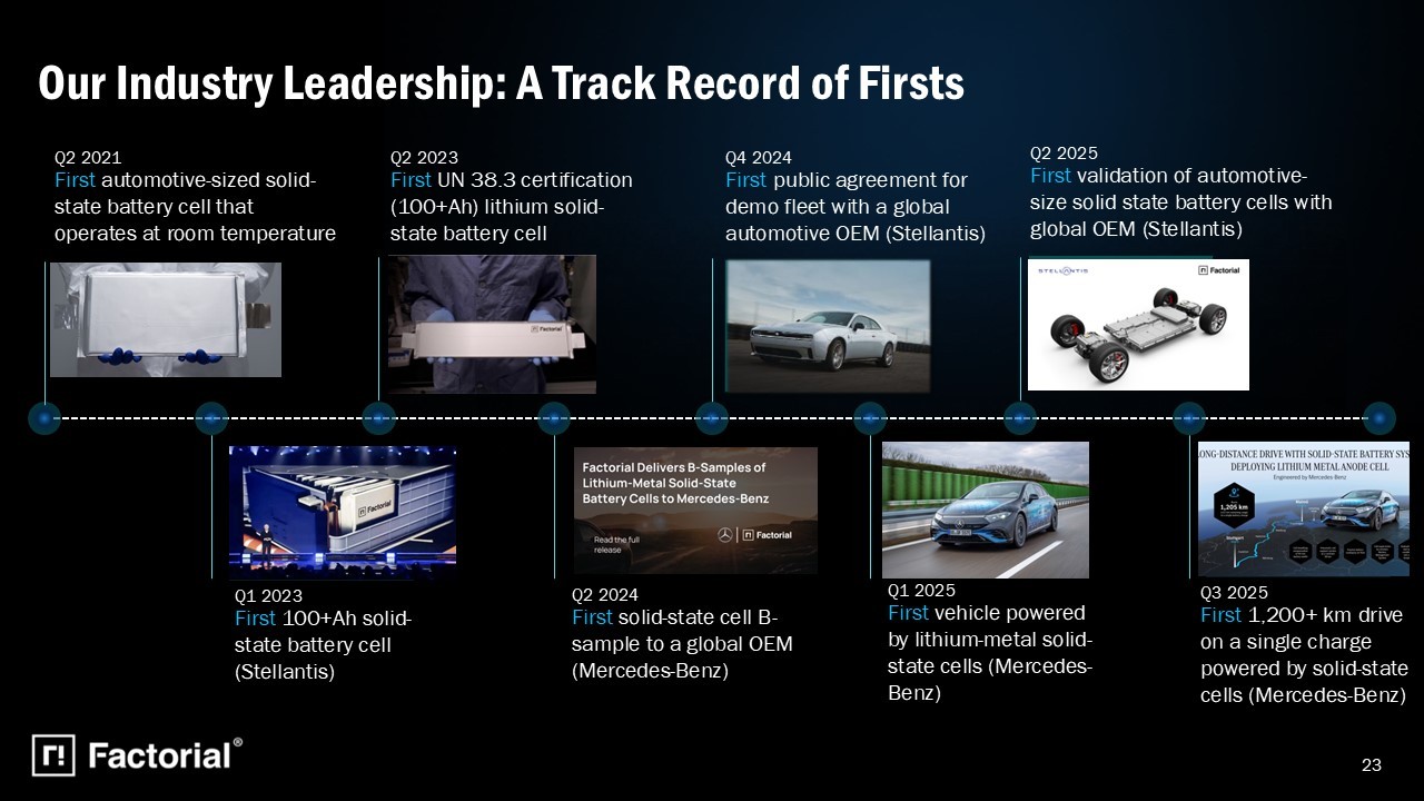 22 Jason Duva General Counsel Siyu Huang, Ph.D./M.B.A. Founder & CEO , Board Director Jay Scuteri Head of Finance Alex Yu, Ph . D . Founder & CTO , Board Director Raimund Koerver , Ph.D. Vice President, Business Development Joe Taylor Executive Chairman of the Board Former Chairman / CEO of Panasonic North America Héctor D. Abruña Founder and Senior Advisor Professor Chemistry, Cornell University Uwe Keller Board Member Director Battery Development Michael Bly Board Member SVP, Global Propulsion Systems Dieter Zetsche Investor & Senior Advisor Former Chairman, Board of Daimler AG and Head of Mercedes - Benz Cars Praveen Sahay Board Member Founder & Managing Director Liad Meidar Board Member Founder & Managing Partner Founders & Management Board Members & Senior Advisors Richard Wei Head of Investor Relations Backed by a board and senior advisors with decades of experience in battery and automotive innovation and reinforced by verti cal experts across business strategy and technology development Building a Visionary Team