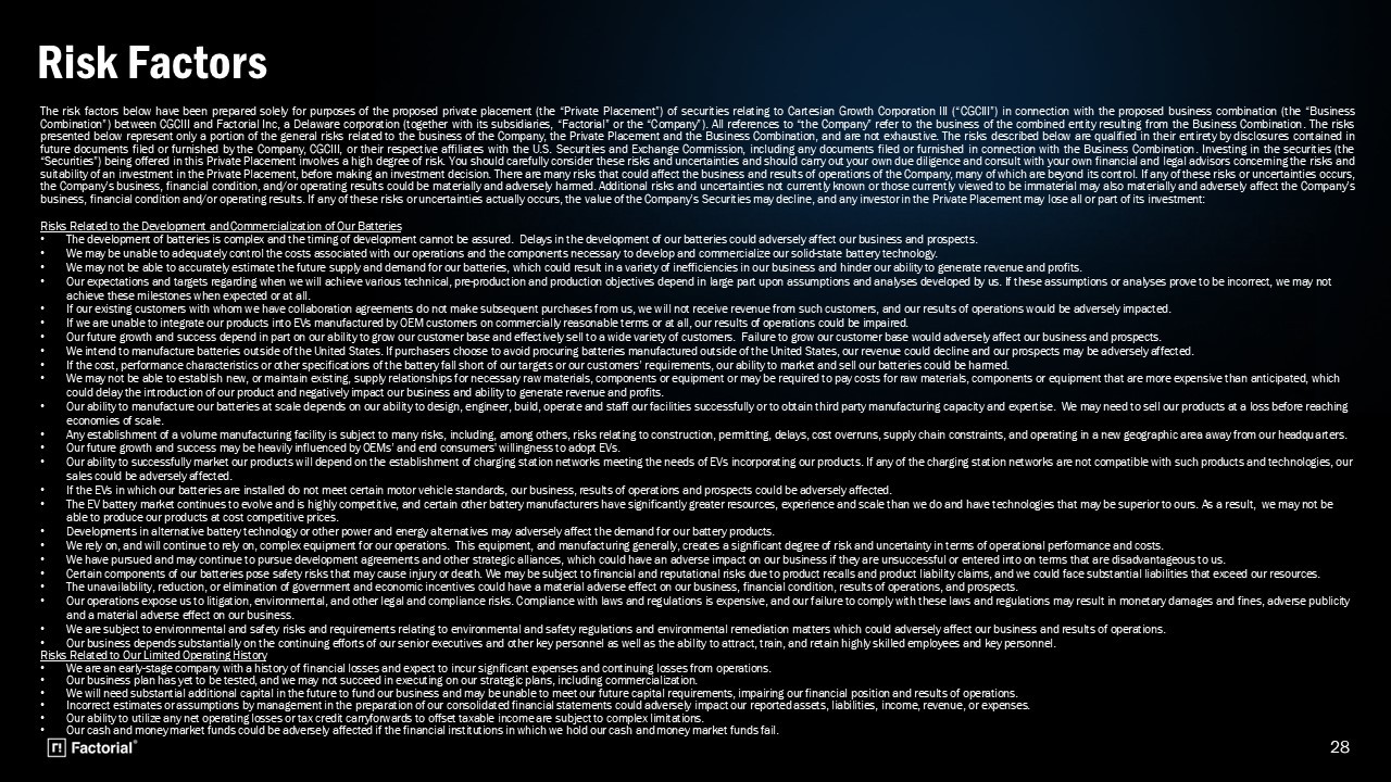28 The risk factors below have been prepared solely for purposes of the proposed private placement (the “Private Placement”) of securities relating to Cartesian Growth Corporation III (“CGCIII”) in connection with the proposed business combination (the “Business Combination”) between CGCIII and Factorial Inc, a Delaware corporation (together with its subsidiaries, “Factorial” or the “Company”) . All references to “the Company” refer to the business of the combined entity resulting from the Business Combination . The risks presented below represent only a portion of the general risks related to the business of the Company, the Private Placement and the Business Combination, and are not exhaustive . The risks described below are qualified in their entirety by disclosures contained in future documents filed or furnished by the Company, CGCIII, or their respective affiliates with the U . S . Securities and Exchange Commission, including any documents filed or furnished in connection with the Business Combination . Investing in the securities (the “Securities”) being offered in this Private Placement involves a high degree of risk . You should carefully consider these risks and uncertainties and should carry out your own due diligence and consult with your own financial and legal advisors concerning the risks and suitability of an investment in the Private Placement, before making an investment decision . There are many risks that could affect the business and results of operations of the Company, many of which are beyond its control . If any of these risks or uncertainties occurs, the Company’s business, financial condition, and/or operating results could be materially and adversely harmed . Additional risks and uncertainties not currently known or those currently viewed to be immaterial may also materially and adversely affect the Company’s business, financial condition and/or operating results . If any of these risks or uncertainties actually occurs, the value of the Company’s Securities may decline, and any investor in the Private Placement may lose all or part of its investment : Risks Related to the Development and Commercialization of Our Batteries • The development of batteries is complex and the timing of development cannot be assured. Delays in the development of our ba tte ries could adversely affect our business and prospects. • We may be unable to adequately control the costs associated with our operations and the components necessary to develop and c omm ercialize our solid - state battery technology. • We may not be able to accurately estimate the future supply and demand for our batteries, which could result in a variety of ine fficiencies in our business and hinder our ability to generate revenue and profits. • Our expectations and targets regarding when we will achieve various technical, pre - production and production objectives depend i n large part upon assumptions and analyses developed by us. If these assumptions or analyses prove to be incorrect, we may no t achieve these milestones when expected or at all. • If our existing customers with whom we have collaboration agreements do not make subsequent purchases from us, we will not re cei ve revenue from such customers, and our results of operations would be adversely impacted. • If we are unable to integrate our products into EVs manufactured by OEM customers on commercially reasonable terms or at all, ou r results of operations could be impaired. • Our future growth and success depend in part on our ability to grow our customer base and effectively sell to a wide variety of customers. Failure to grow our customer base would adversely affect our business and prospects. • We intend to manufacture batteries outside of the United States. If purchasers choose to avoid procuring batteries manufactur ed outside of the United States, our revenue could decline and our prospects may be adversely affected. • If the cost, performance characteristics or other specifications of the battery fall short of our targets or our customers’ r equ irements, our ability to market and sell our batteries could be harmed. • We may not be able to establish new, or maintain existing, supply relationships for necessary raw materials, components or eq uip ment or may be required to pay costs for raw materials, components or equipment that are more expensive than anticipated, whi ch could delay the introduction of our product and negatively impact our business and ability to generate revenue and profits. • Our ability to manufacture our batteries at scale depends on our ability to design, engineer, build, operate and staff our fa cil ities successfully or to obtain third party manufacturing capacity and expertise. We may need to sell our products at a loss be fore reaching economies of scale. • Any establishment of a volume manufacturing facility is subject to many risks, including, among others, risks relating to con str uction, permitting, delays, cost overruns, supply chain constraints, and operating in a new geographic area away from our hea dqu arters. • Our future growth and success may be heavily influenced by OEMs’ and end consumers' willingness to adopt EVs. • Our ability to successfully market our products will depend on the establishment of charging station networks meeting the nee ds of EVs incorporating our products. If any of the charging station networks are not compatible with such products and technolo gie s, our sales could be adversely affected. • If the EVs in which our batteries are installed do not meet certain motor vehicle standards, our business, results of operati ons and prospects could be adversely affected. • The EV battery market continues to evolve and is highly competitive, and certain other battery manufacturers have significant ly greater resources, experience and scale than we do and have technologies that may be superior to ours. As a result, we 
