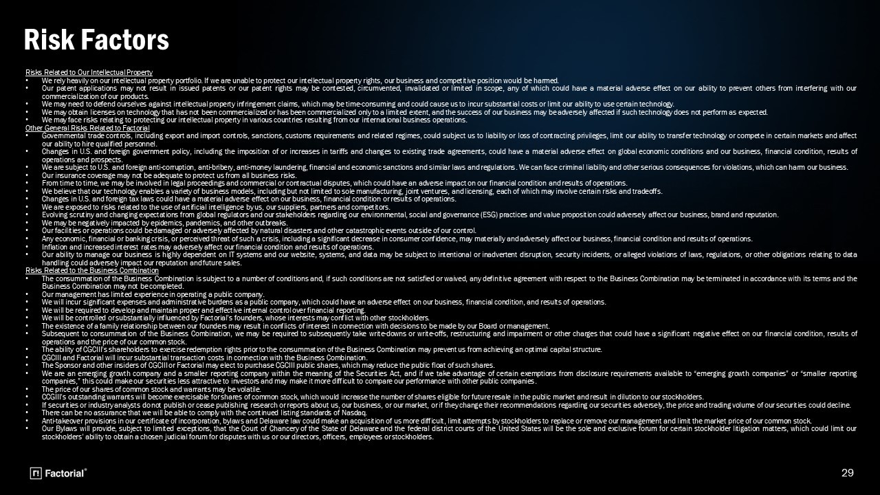 29 Risks Related to Our Intellectual Property • We rely heavily on our intellectual property portfolio . If we are unable to protect our intellectual property rights, our business and competitive position would be harmed . • Our patent applications may not result in issued patents or our patent rights may be contested, circumvented, invalidated or limited in scope, any of which could have a material adverse effect on our ability to prevent others from interfering with our commercialization of our products . • We may need to defend ourselves against intellectual property infringement claims, which may be time - consuming and could cause us to incur substantial costs or limit our ability to use certain technology . • We may obtain licenses on technology that has not been commercialized or has been commercialized only to a limited extent, and the success of our business may be adversely affected if such technology does not perform as expected . • We may face risks relating to protecting our intellectual property in various countries resulting from our international business operations . Other General Risks Related to Factorial • Governmental trade controls, including export and import controls, sanctions, customs requirements and related regimes, could subject us to liability or loss of contracting privileges, limit our ability to transfer technology or compete in certain markets and affect our ability to hire qualified personnel . • Changes in U . S . and foreign government policy, including the imposition of or increases in tariffs and changes to existing trade agreements, could have a material adverse effect on global economic conditions and our business, financial condition, results of operations and prospects . • We are subject to U . S . and foreign anti - corruption, anti - bribery, anti - money laundering, financial and economic sanctions and similar laws and regulations . We can face criminal liability and other serious consequences for violations, which can harm our business . • Our insurance coverage may not be adequate to protect us from all business risks . • From time to time, we may be involved in legal proceedings and commercial or contractual disputes, which could have an adverse impact on our financial condition and results of operations . • We believe that our technology enables a variety of business models, including but not limited to sole manufacturing, joint ventures, and licensing, each of which may involve certain risks and tradeoffs . • Changes in U . S . and foreign tax laws could have a material adverse effect on our business, financial condition or results of operations . • We are exposed to risks related to the use of artificial intelligence by us, our suppliers, partners and competitors . • Evolving scrutiny and changing expectations from global regulators and our stakeholders regarding our environmental, social and governance (ESG) practices and value proposition could adversely affect our business, brand and reputation . • We may be negatively impacted by epidemics, pandemics, and other outbreaks . • Our facilities or operations could be damaged or adversely affected by natural disasters and other catastrophic events outside of our control . • Any economic, financial or banking crisis, or perceived threat of such a crisis, including a significant decrease in consumer confidence, may materially and adversely affect our business, financial condition and results of operations . • Inflation and increased interest rates may adversely affect our financial condition and results of operations . • Our ability to manage our business is highly dependent on IT systems and our website, systems, and data may be subject to intentional or inadvertent disruption, security incidents, or alleged violations of laws, regulations, or other obligations relating to data handling could adversely impact our reputation and future sales . Risks Related to the Business Combination • The consummation of the Business Combination is subject to a number of conditions and, if such conditions are not satisfied or waived, any definitive agreement with respect to the Business Combination may be terminated in accordance with its terms and the Business Combination may not be completed . • Our management has limited experience in operating a public company . • We will incur significant expenses and administrative burdens as a public company, which could have an adverse effect on our business, financial condition, and results of operations . • We will be required to develop and maintain proper and effective internal control over financial reporting . • We will be controlled or substantially influenced by Factorial’s founders, whose interests may conflict with other stockholders . • The existence of a family relationship between our founders may result in conflicts of interest in connection with decisions to be made by our Board or management . • Subsequent to consummation of the Business Combination, we may be required to subsequently take write - downs or write - offs, restructuring and impairment or other charges that could have a significant negative effect on our financial condition, results of operations and the price of our common stock . • The ability of CGCIII’s shareholders to exercise redemption rights prior to the consummation of the Business Combination may prevent us from achieving an optimal capital structure . • CGCIII and Factorial will incur substantial transaction costs in connection with the Business Combination . • The Sponsor and other insiders of CGCIII or Factorial may elect to purchase CGCIII public shares, which may reduce the public float of such shares . • We are an emerging growth company and a smaller reporting company within the meaning of the Securities Act, and if we take advantage of certain exemptions from disclosure requirements available to “emerging growth companies” or “smaller reporting comp