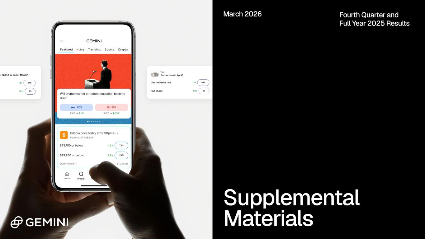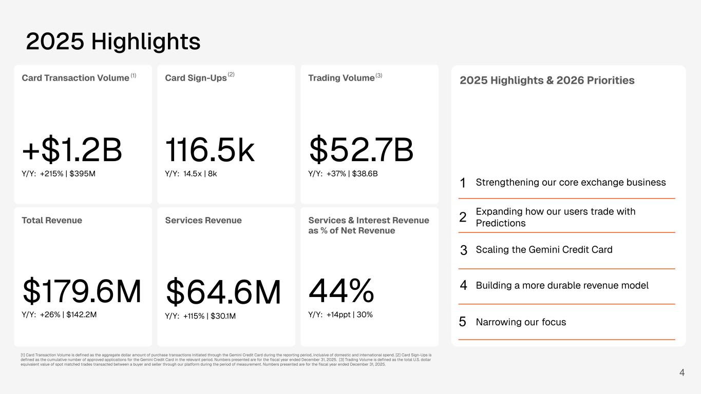 2025 Highlights & 2026 Priorities Strengthening our core exchange business Expanding how our users trade with Predictions 4 2025 Highlights Card Transaction Volume +$1.2B Y/Y: +215% | $395M (1) Card Sign-Ups 116.5k Y/Y: 14.5x | 8k (2) Trading Volume $52.7B Y/Y: +37% | $38.6B (3) Assets on Platform $15.9B Y/Y: -13% | $18.1B (4)Total Revenue 79.6M / : +26% | $142.2M Services Revenue $64.6M Y/Y: +115% | $30.1M [1] Card Transaction Volume is defined as the aggregate dollar amount of purchase transactions initiated through the Gemini Credit Card during the reporting period, inclusive of domestic and international spend. [2] Card Sign-Ups is defined as the cumulative number of approved applications for the Gemini Credit Card in the relevant period. Numbers presented are for the fiscal year ended December 31, 2025. [3] Trading Volume is defined as the total U.S. dollar equivalent value of spot matched trades transacted between a buyer and seller through our platform during the period of measurement. Numbers presented are for the fiscal year ended December 31, 2025. option 2 - fy 2025 Services & Interest Revenue as % of Net Revenue 44% Y/Y: +14ppt | 30% Scaling the Gemini Credit Card Building a more durable revenue model Narrowing our focus 1 3 2 4 5