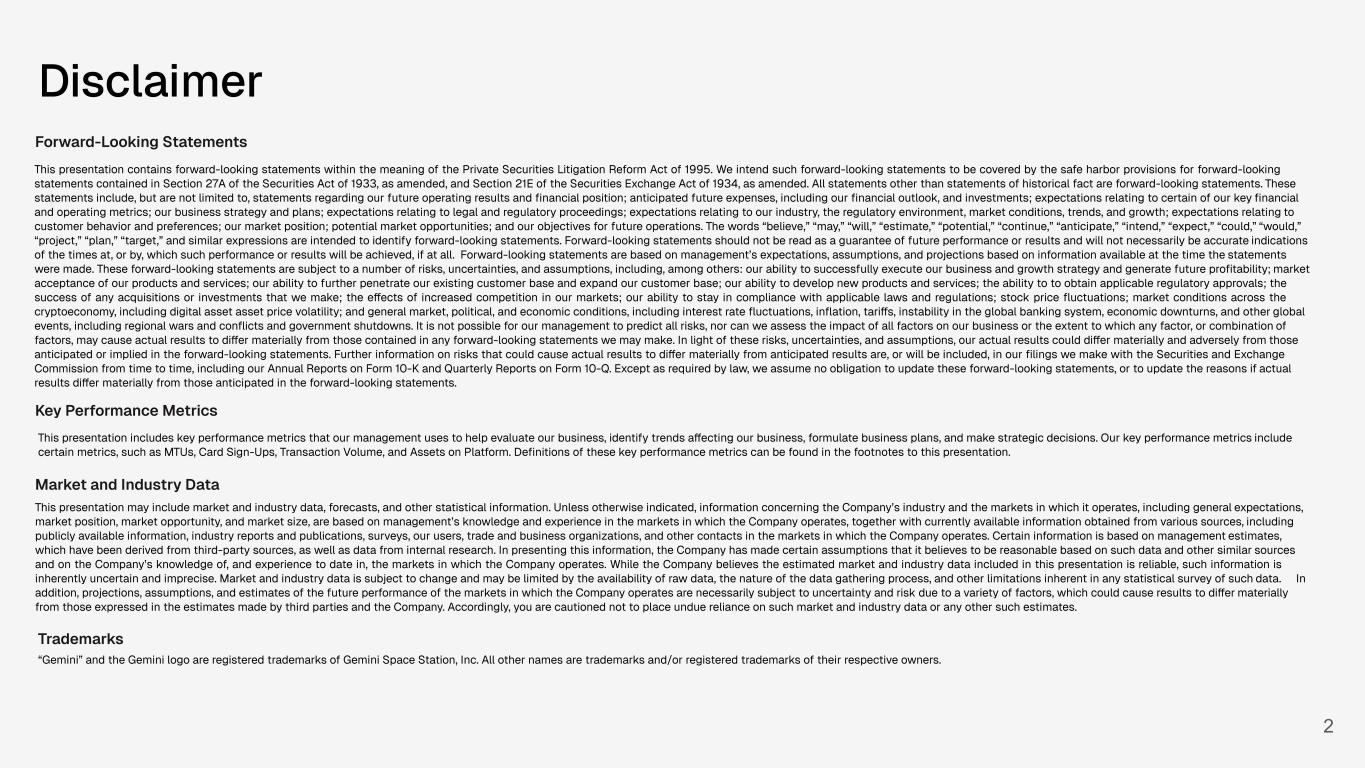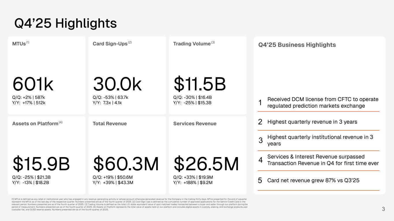 2 Disclaimer Forward-Looking Statements This presentation contains forward-looking statements within the meaning of the Private Securities Litigation Reform Act of 1995. We intend such forward-looking statements to be covered by the safe harbor provisions for forward-looking statements contained in Section 27A of the Securities Act of 1933, as amended, and Section 21E of the Securities Exchange Act of 1934, as amended. All statements other than statements of historical fact are forward-looking statements. These statements include, but are not limited to, statements regarding our future operating results and financial position; anticipated future expenses, including our financial outlook, and investments; expectations relating to certain of our key financial and operating metrics; our business strategy and plans; expectations relating to legal and regulatory proceedings; expectations relating to our industry, the regulatory environment, market conditions, trends, and growth; expectations relating to customer behavior and preferences; our market position; potential market opportunities; and our objectives for future operations. The words “believe,” “may,” “will,” “estimate,” “potential,” “continue,” “anticipate,” “intend,” “expect,” “could,” “would,” “project,” “plan,” “target,” and similar expressions are intended to identify forward-looking statements. Forward-looking statements should not be read as a guarantee of future performance or results and will not necessarily be accurate indications of the times at, or by, which such performance or results will be achieved, if at all. Forward-looking statements are based on management’s expectations, assumptions, and projections based on information available at the time the statements were made. These forward-looking statements are subject to a number of risks, uncertainties, and assumptions, including, among others: our ability to successfully execute our business and growth strategy and generate future profitability; market acceptance of our products and services; our ability to further penetrate our existing customer base and expand our customer base; our ability to develop new products and services; the ability to to obtain applicable regulatory approvals; the success of any acquisitions or investments that we make; the effects of increased competition in our markets; our ability to stay in compliance with applicable laws and regulations; stock price fluctuations; market conditions across the cryptoeconomy, including digital asset asset price volatility; and general market, political, and economic conditions, including interest rate fluctuations, inflation, tariffs, instability in the global banking system, economic downturns, and other global events, including regional wars and conflicts and government shutdowns. It is not possible for our management to predict all risks, nor can we assess the impact of all factors on our business or the extent to which any factor, or combination of factors, may cause actual results to differ materially from those contained in any forward-looking statements we may make. In light of these risks, uncertainties, and assumptions, our actual results could differ materially and adversely from those anticipated or implied in the forward-looking statements. Further information on risks that could cause actual results to differ materially from anticipated results are, or will be included, in our filings we make with the Securities and Exchange Commission from time to time, including our Annual Reports on Form 10-K and Quarterly Reports on Form 10-Q. Except as required by law, we assume no obligation to update these forward-looking statements, or to update the reasons if actual results differ materially from those anticipated in the forward-looking statements. Key Performance Metrics This presentation includes key performance metrics that our management uses to help evaluate our business, identify trends affecting our business, formulate business plans, and make strategic decisions. Our key performance metrics include certain metrics, such as MTUs, Card Sign-Ups, Transaction Volume, and Assets on Platform. Definitions of these key performance metrics can be found in the footnotes to this presentation. Market and Industry Data This presentation may include market and industry data, forecasts, and other statistical information. Unless otherwise indicated, information concerning the Company’s industry and the markets in which it operates, including general expectations, market position, market opportunity, and market size, are based on management’s knowledge and experience in the markets in which the Company operates, together with currently available information obtained from various sources, including publicly available information, industry reports and publications, surveys, our users, trade and business organizations, and other contacts in the markets in which the Company operates. Certain information is based on management estimates, which have been derived from third-party sources, as well as data from internal research. In presenting this information, the Company has made certain assumptions that it believes to be reasonable based on such data and other similar sources and on the Company’s knowledge of, and experience to date in, the markets in which the Company operates. While the Company believes the estimated market and industry data included in this presentation is reliable, such information is inherently uncertain and imprecise. Market and industry data is subject to change and may be limited by the availability of raw data, the nature of the data gathering process, and other limitations inherent in any statistical survey of such data. In addition, projections, assumptions, and estimates of the future performance of the markets in which the Company operates are necessarily subject to uncertainty and risk due to a variety of factors, which coul