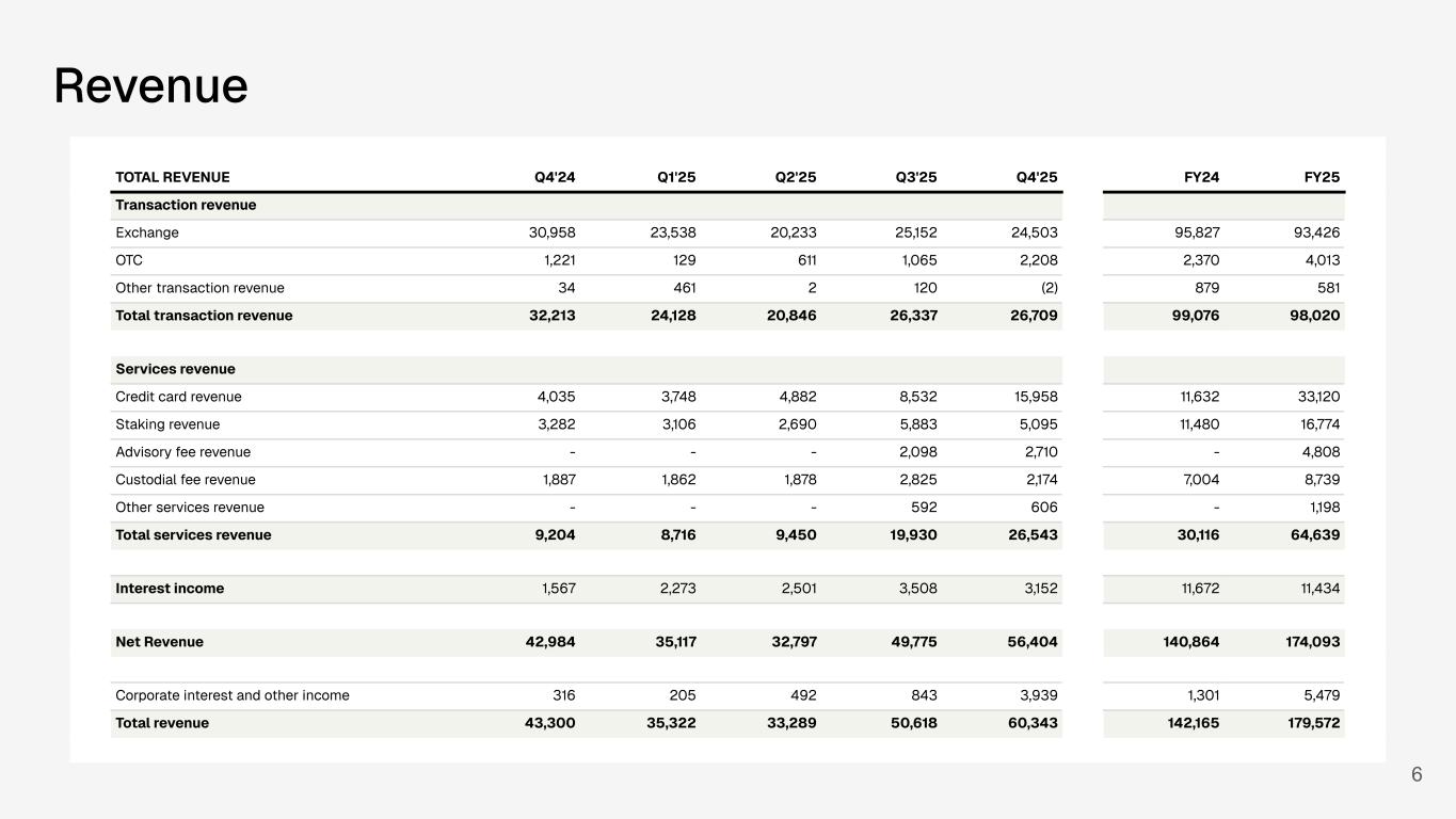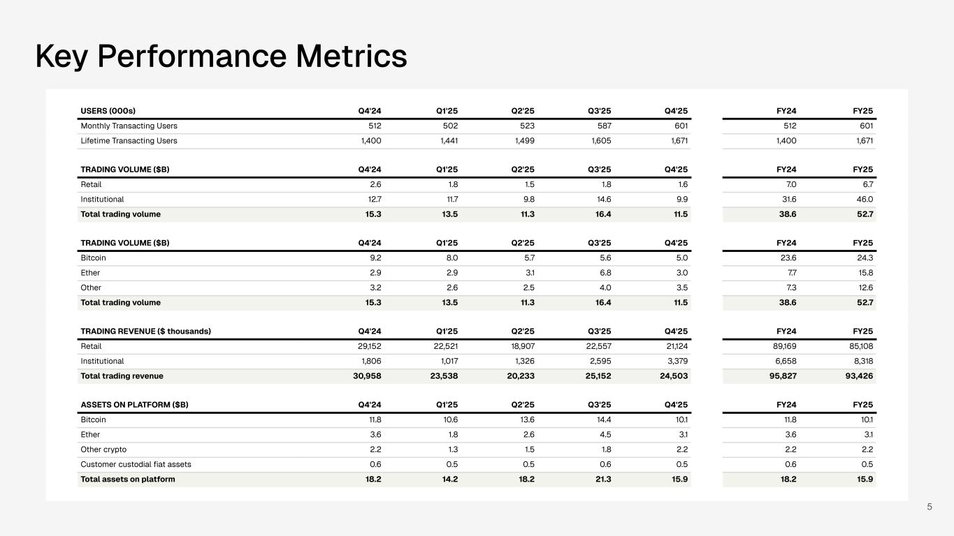 5 USERS (000s) Q4'24 Q1'25 Q2'25 Q3'25 Q4'25 FY24 FY25 Monthly Transacting Users 512 502 523 587 601 512 601 Lifetime Transacting Users 1,400 1,441 1,499 1,605 1,671 1,400 1,671 TRADING VOLUME ($B) Q4'24 Q1'25 Q2'25 Q3'25 Q4'25 FY24 FY25 Retail 2.6 1.8 1.5 1.8 1.6 7.0 6.7 Institutional 12.7 11.7 9.8 14.6 9.9 31.6 46.0 Total trading volume 15.3 13.5 11.3 16.4 11.5 38.6 52.7 TRADING VOLUME ($B) Q4'24 Q1'25 Q2'25 Q3'25 Q4'25 FY24 FY25 Bitcoin 9.2 8.0 5.7 5.6 5.0 23.6 24.3 Ether 2.9 2.9 3.1 6.8 3.0 7.7 15.8 Other 3.2 2.6 2.5 4.0 3.5 7.3 12.6 Total trading volume 15.3 13.5 11.3 16.4 11.5 38.6 52.7 TRADING REVENUE ($ thousands) Q4'24 Q1'25 Q2'25 Q3'25 Q4'25 FY24 FY25 Retail 29,152 22,521 18,907 22,557 21,124 89,169 85,108 Institutional 1,806 1,017 1,326 2,595 3,379 6,658 8,318 Total trading revenue 30,958 23,538 20,233 25,152 24,503 95,827 93,426 ASSETS ON PLATFORM ($B) Q4'24 Q1'25 Q2'25 Q3'25 Q4'25 FY24 FY25 Bitcoin 11.8 10.6 13.6 14.4 10.1 11.8 10.1 Ether 3.6 1.8 2.6 4.5 3.1 3.6 3.1 Other crypto 2.2 1.3 1.5 1.8 2.2 2.2 2.2 Customer custodial fiat assets 0.6 0.5 0.5 0.6 0.5 0.6 0.5 Total assets on platform 18.2 14.2 18.2 21.3 15.9 18.2 15.9 Key Performance Metrics