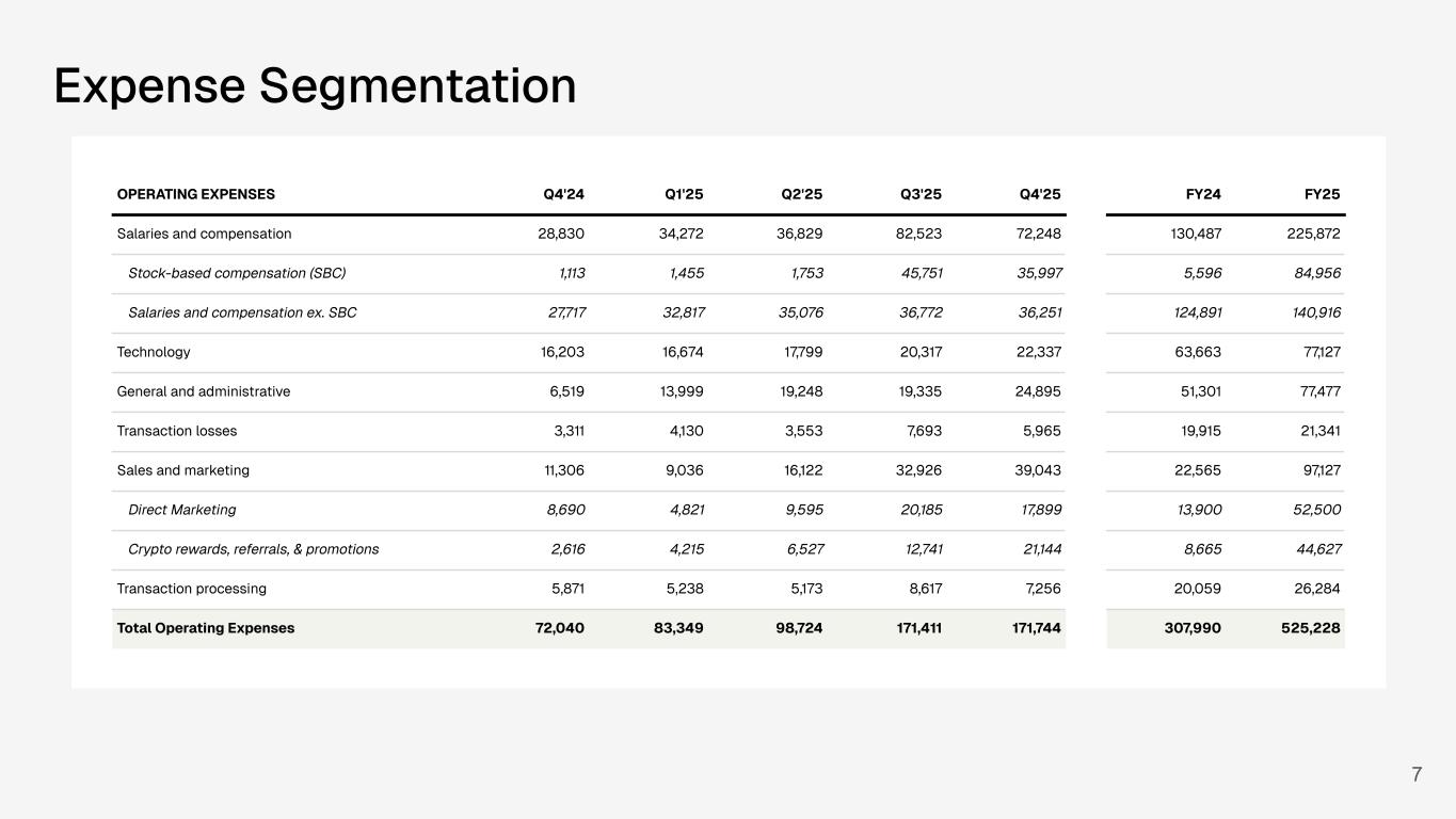 OPERATING EXPENSES 4Q'24 1Q'25 2Q'25 3Q'25 4Q'25 Salaries and compensation 28,830 34,272 36,829 82,523 72,752 Technology 16,203 16,674 17,799 20,317 22,336 General and administrative 6,519 13,999 19,248 19,335 22,050 Transaction losses 3,311 4,130 3,553 7,693 6,551 Sales and marketing 11,306 9,036 16,122 32,926 37,361 Transaction processing 5,871 5,238 5,173 8,617 7,102 Total Operating Expenses 72,040 83,349 98,724 171,411 168,1527 Expense Segmentation Break out SBC from Comp Break out crypto rewards, promos, referrals, etc from marketing OPERATING EXPENSES Q4'24 Q1'25 Q2'25 Q3'25 Q4'25 FY24 FY25 Salaries and compensation 28,830 34,272 36,829 82,523 72,248 130,487 225,872 Stock-based compensation (SBC) 1,113 1,455 1,753 45,751 35,997 5,596 84,956 Salaries and compensation ex. SBC 27,717 32,817 35,076 36,772 36,251 124,891 140,916 Technology 16,203 16,674 17,799 20,317 22,337 63,663 77,127 General and administrative 6,519 13,999 19,248 19,335 24,895 51,301 77,477 Transaction losses 3,311 4,130 3,553 7,693 5,965 19,915 21,341 Sales and marketing 11,306 9,036 16,122 32,926 39,043 22,565 97,127 Direct Marketing 8,690 4,821 9,595 20,185 17,899 13,900 52,500 Crypto rewards, referrals, & promotions 2,616 4,215 6,527 12,741 21,144 8,665 44,627 Transaction processing 5,871 5,238 5,173 8,617 7,256 20,059 26,284 Total Operating Expenses 72,040 83,349 98,724 171,411 171,744 307,990 525,228