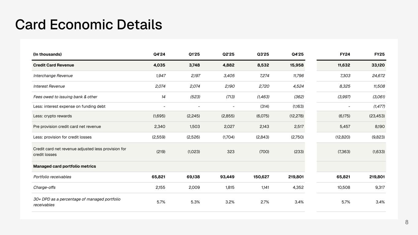 Card Economic Details 8 (In thousands) Q4'24 Q1'25 Q2'25 Q3'25 Q4'25 FY24 FY25 Credit Card Revenue 4,035 3,748 4,882 8,532 15,958 11,632 33,120 Interchange Revenue 1,947 2,197 3,405 7,274 11,796 7,303 24,672 Interest Revenue 2,074 2,074 2,190 2,720 4,524 8,325 11,508 Fees owed to issuing bank & other 14 (523) (713) (1,463) (362) (3,997) (3,061) Less: interest expense on funding debt - - - (314) (1,163) - (1,477) Less: crypto rewards (1,695) (2,245) (2,855) (6,075) (12,278) (6,175) (23,453) Pre provision credit card net revenue 2,340 1,503 2,027 2,143 2,517 5,457 8,190 Less: provision for credit losses (2,559) (2,526) (1,704) (2,843) (2,750) (12,820) (9,823) Credit card net revenue adjusted less provision for credit losses (219) (1,023) 323 (700) (233) (7,363) (1,633) Managed card portfolio metrics Portfolio receivables 65,821 69,138 93,449 150,627 219,801 65,821 219,801 Charge-offs 2,155 2,009 1,815 1,141 4,352 10,508 9,317 30+ DPD as a percentage of managed portfolio receivables 5.7% 5.3% 3.2% 2.7% 3.4% 5.7% 3.4%