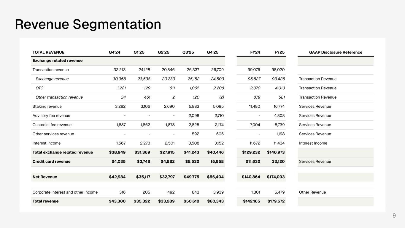 Revenue Segmentation 9 TOTAL REVENUE Q4'24 Q1'25 Q2'25 Q3'25 Q4'25 FY24 FY25 GAAP Disclosure Reference Exchange related revenue Transaction revenue 32,213 24,128 20,846 26,337 26,709 99,076 98,020 Exchange revenue 30,958 23,538 20,233 25,152 24,503 95,827 93,426 Transaction Revenue OTC 1,221 129 611 1,065 2,208 2,370 4,013 Transaction Revenue Other transaction revenue 34 461 2 120 (2) 879 581 Transaction Revenue Staking revenue 3,282 3,106 2,690 5,883 5,095 11,480 16,774 Services Revenue Advisory fee revenue - - - 2,098 2,710 - 4,808 Services Revenue Custodial fee revenue 1,887 1,862 1,878 2,825 2,174 7,004 8,739 Services Revenue Other services revenue - - - 592 606 - 1,198 Services Revenue Interest income 1,567 2,273 2,501 3,508 3,152 11,672 11,434 Interest Income Total exchange related revenue $38,949 $31,369 $27,915 $41,243 $40,446 $129,232 $140,973 Credit card revenue $4,035 $3,748 $4,882 $8,532 15,958 $11,632 33,120 Services Revenue Net Revenue $42,984 $35,117 $32,797 $49,775 $56,404 $140,864 $174,093 Corporate interest and other income 316 205 492 843 3,939 1,301 5,479 Other Revenue Total revenue $43,300 $35,322 $33,289 $50,618 $60,343 $142,165 $179,572