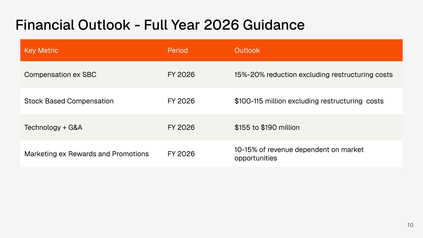 10 Financial Outlook - Full Year 2026 Guidance Key Metric Period Outlook Compensation ex SBC FY 2026 15%-20% reduction excluding restructuring costs Stock Based Compensation FY 2026 $100-115 million excluding restructuring costs Technology + G&A FY 2026 $155 to $190 million Marketing ex Rewards and Promotions FY 2026 10-15% of revenue dependent on market opportunities