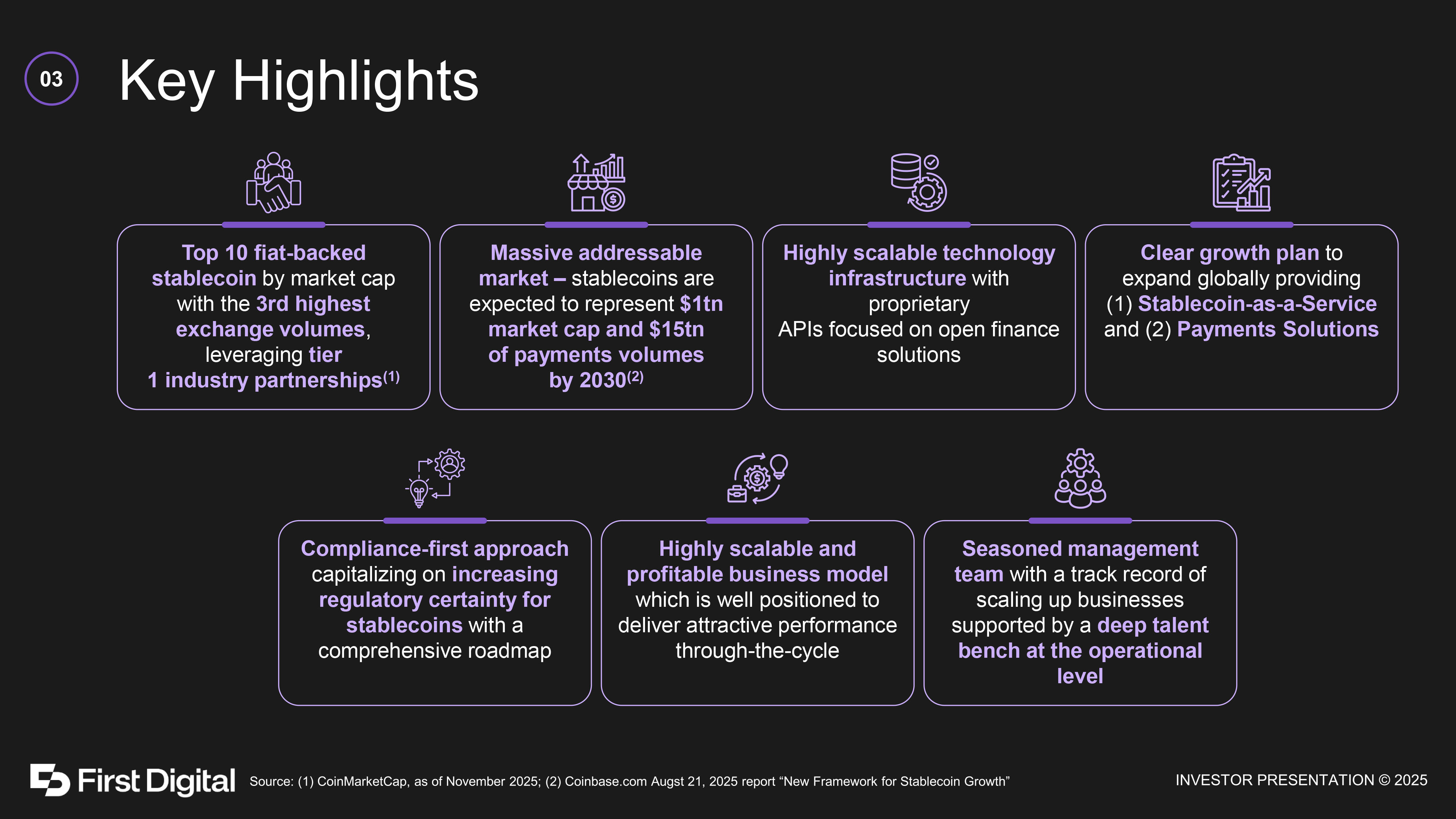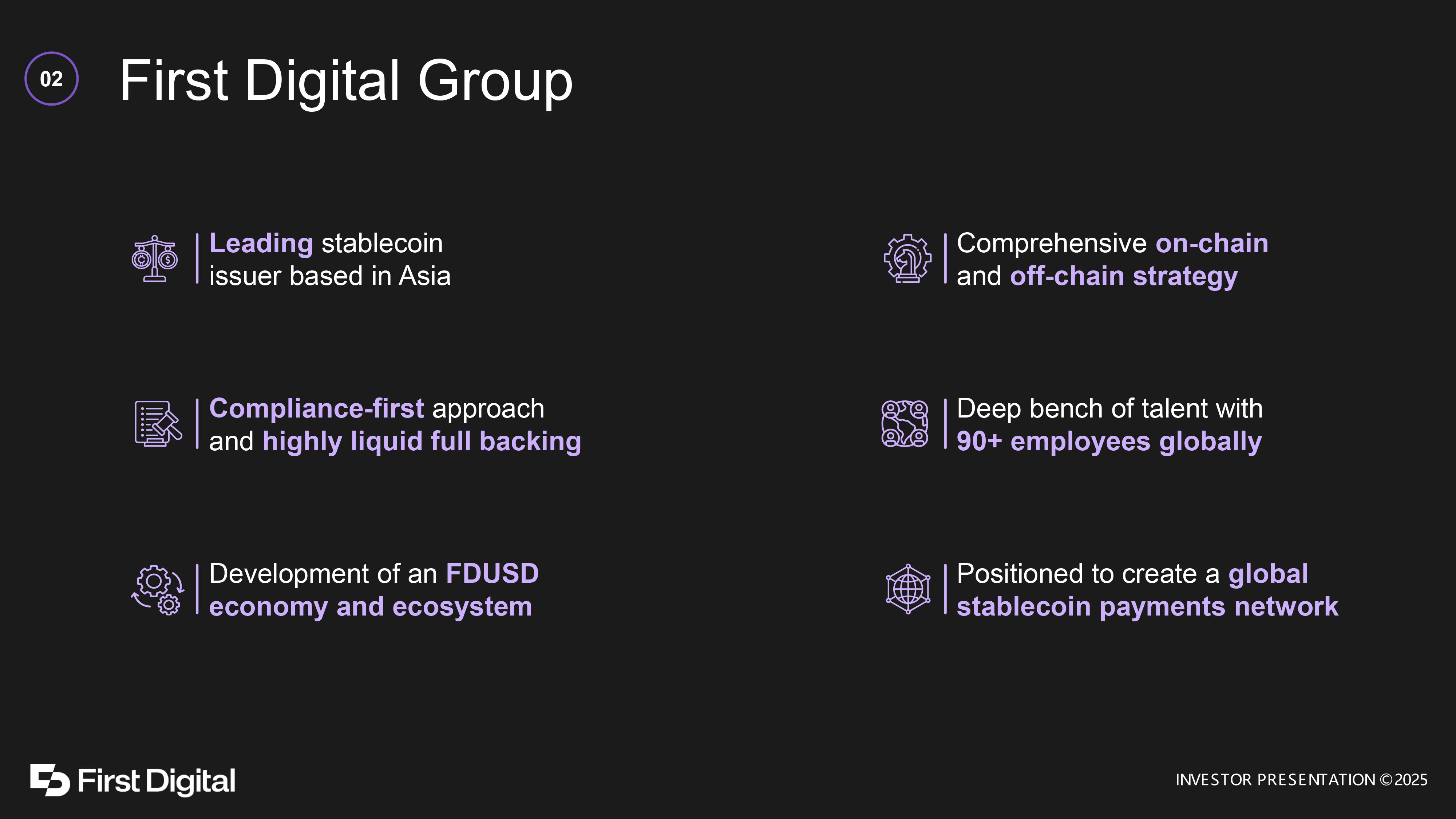 First Digital Group Compliance - first approach and highly liquid full backing Deep bench of talent with 90+ employees globally Leading stablecoin issuer based in Asia Comprehensive on - chain and off - chain strategy Development of an FDUSD economy and ecosystem Positioned to create a global stablecoin payments network 02