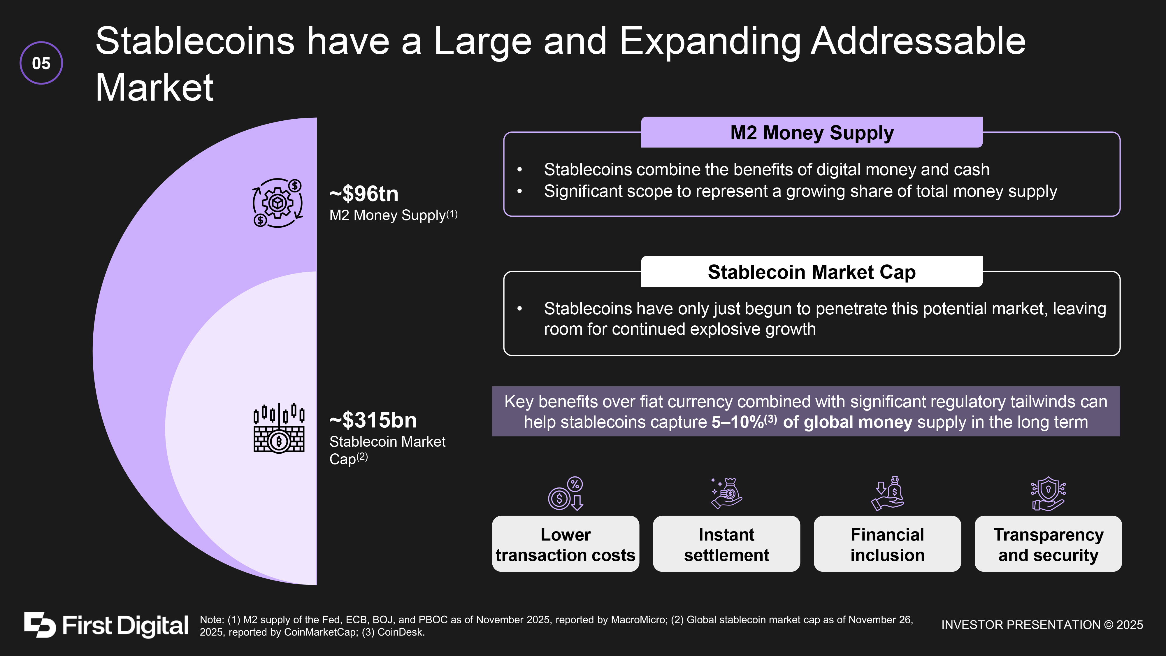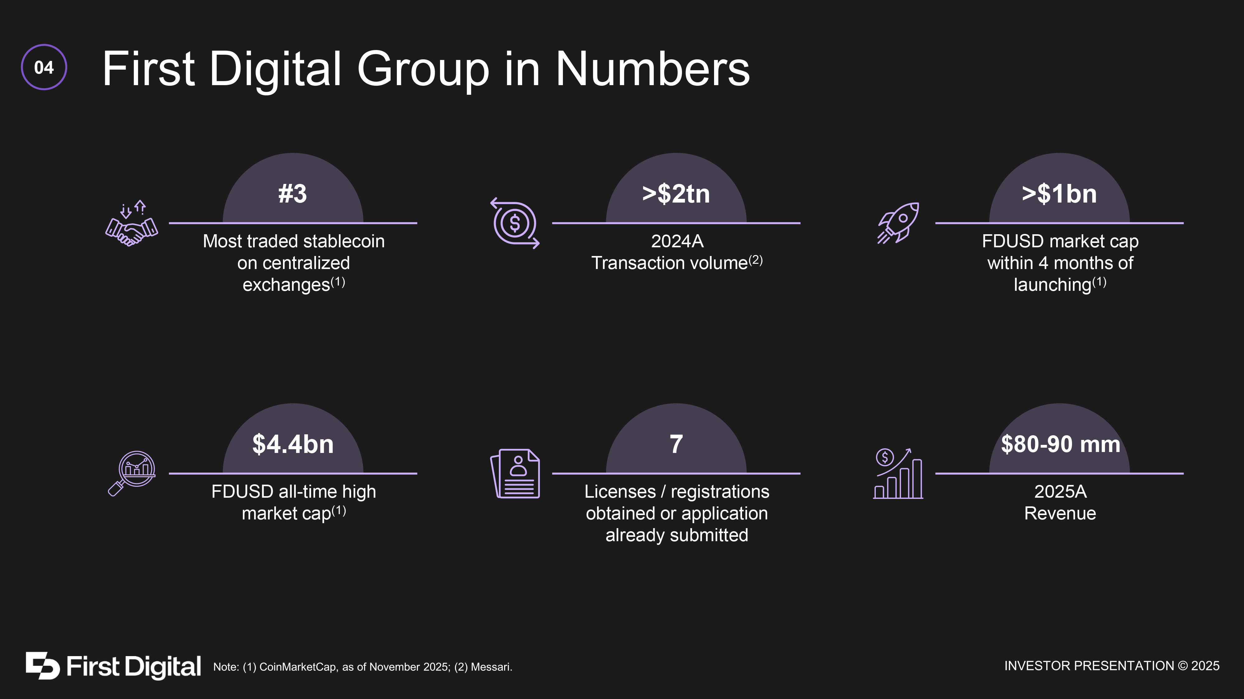 First Digital Group in Numbers #3 Most traded stablecoin on centralized exchanges (1) >$2tn 2024A Transaction volume (2) >$1bn FDUSD market cap within 4 months of launching (1) $4.4bn FDUSD all - time high market cap (1) 7 Licenses / registrations obtained or application already submitted $80 - 90 mm 2025A Revenue 04