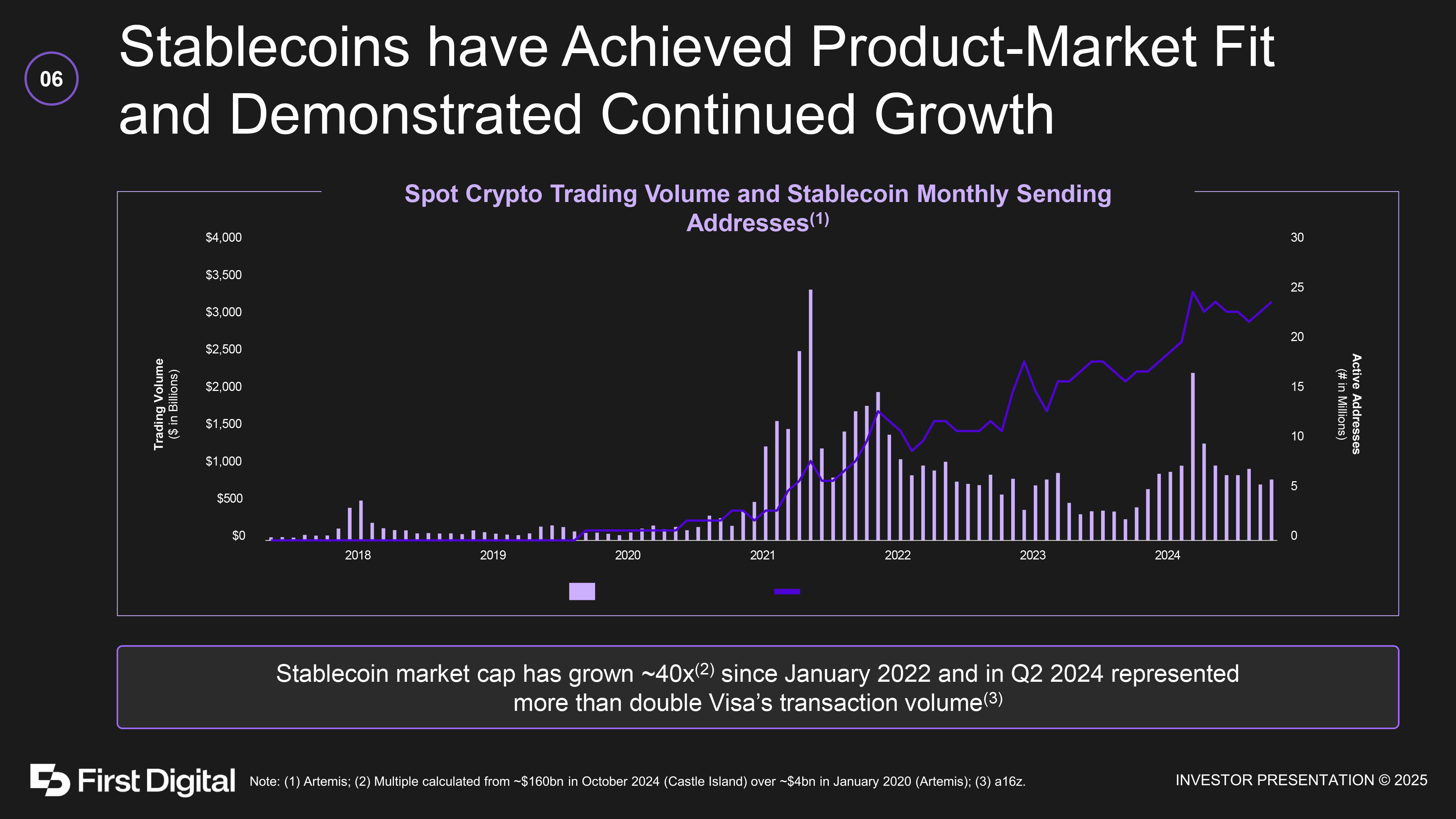 Stablecoins have Achieved Product - Market Fit and Demonstrated Continued Growth 06 Stablecoin market cap has grown ~40x (2) since January 2022 and in Q2 2024 represented more than double Visa’s transaction volume (3) 0 5 10 15 20 25 30 $0 $500 $1,000 $1,500 $2,000 $2,500 $3,000 $3,500 $4,000 2018 2019 2020 2021 2022 2023 2024 Trading Volume ($ in Billions) Active Addresses (# in Millions) Spot Crypto Trading Volume and Stablecoin Monthly Sending Addresses (1)