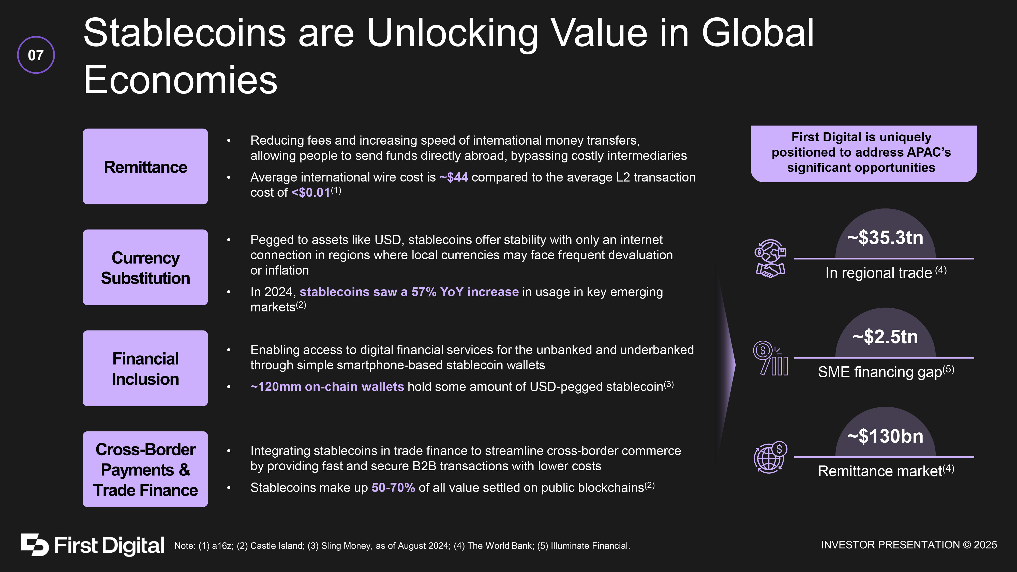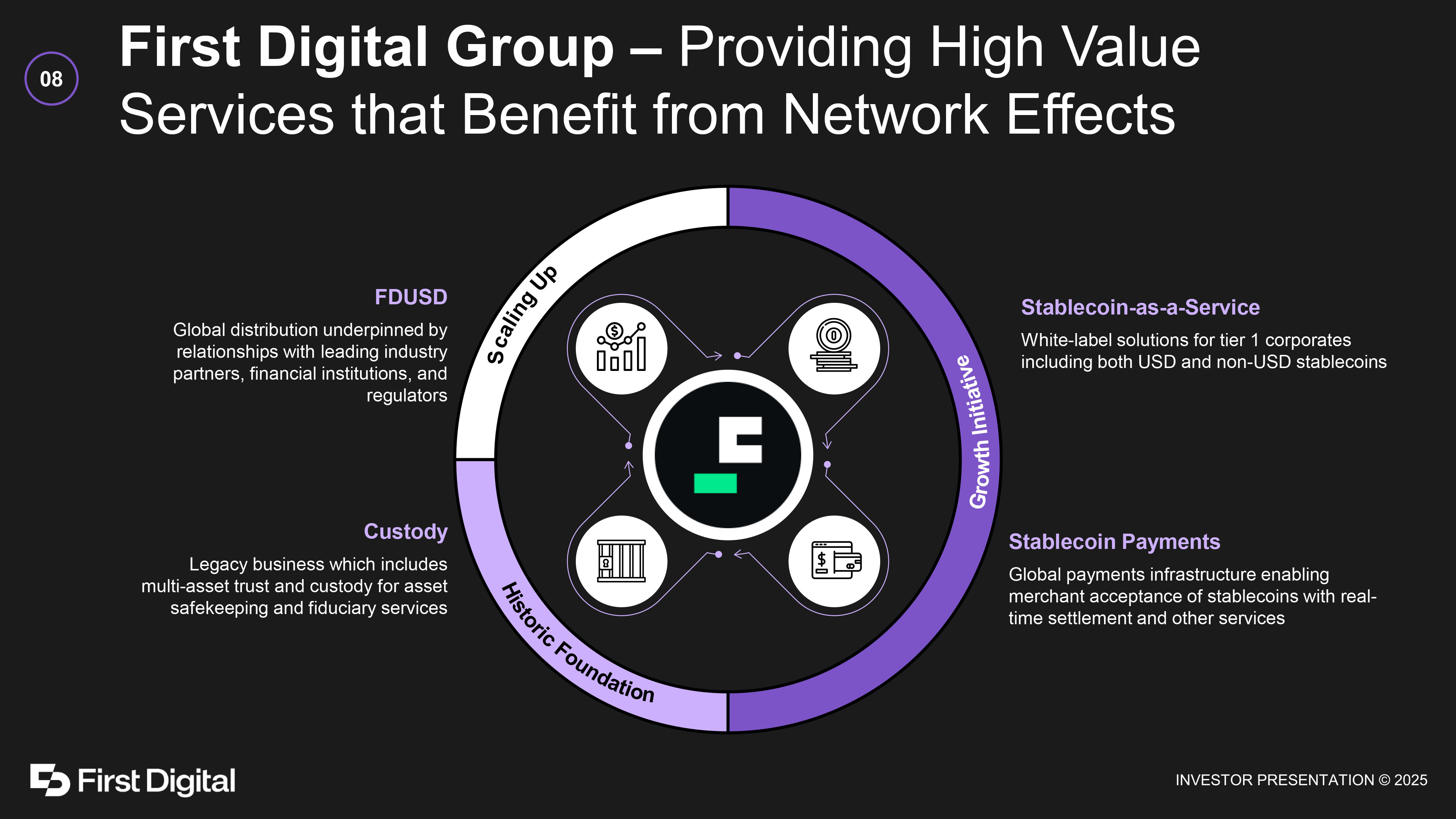 Stablecoins are Unlocking Value in Global Economies 07 • Reducing fees and increasing speed of international money transfers, allowing people to send funds directly abroad, bypassing costly intermediaries • Average international wire cost is ~$44 compared to the average L2 transaction cost of <$0.01 (1) • Pegged to assets like USD, stablecoins offer stability with only an internet connection in regions where local currencies may face frequent devaluation or inflation • In 2024, stablecoins saw a 57% YoY increase in usage in key emerging markets (2) • Enabling access to digital financial services for the unbanked and underbanked through simple smartphone - based stablecoin wallets • ~120mm on - chain wallets hold some amount of USD - pegged stablecoin (3) • Integrating stablecoins in trade finance to streamline cross - border commerce by providing fast and secure B2B transactions with lower costs • Stablecoins make up 50 - 70% of all value settled on public blockchains (2) First Digital is uniquely positioned to address APAC’s significant opportunities ~$35.3tn In regional trade (4) ~$2.5tn SME financing gap (5) ~$130bn Remittance market (4)