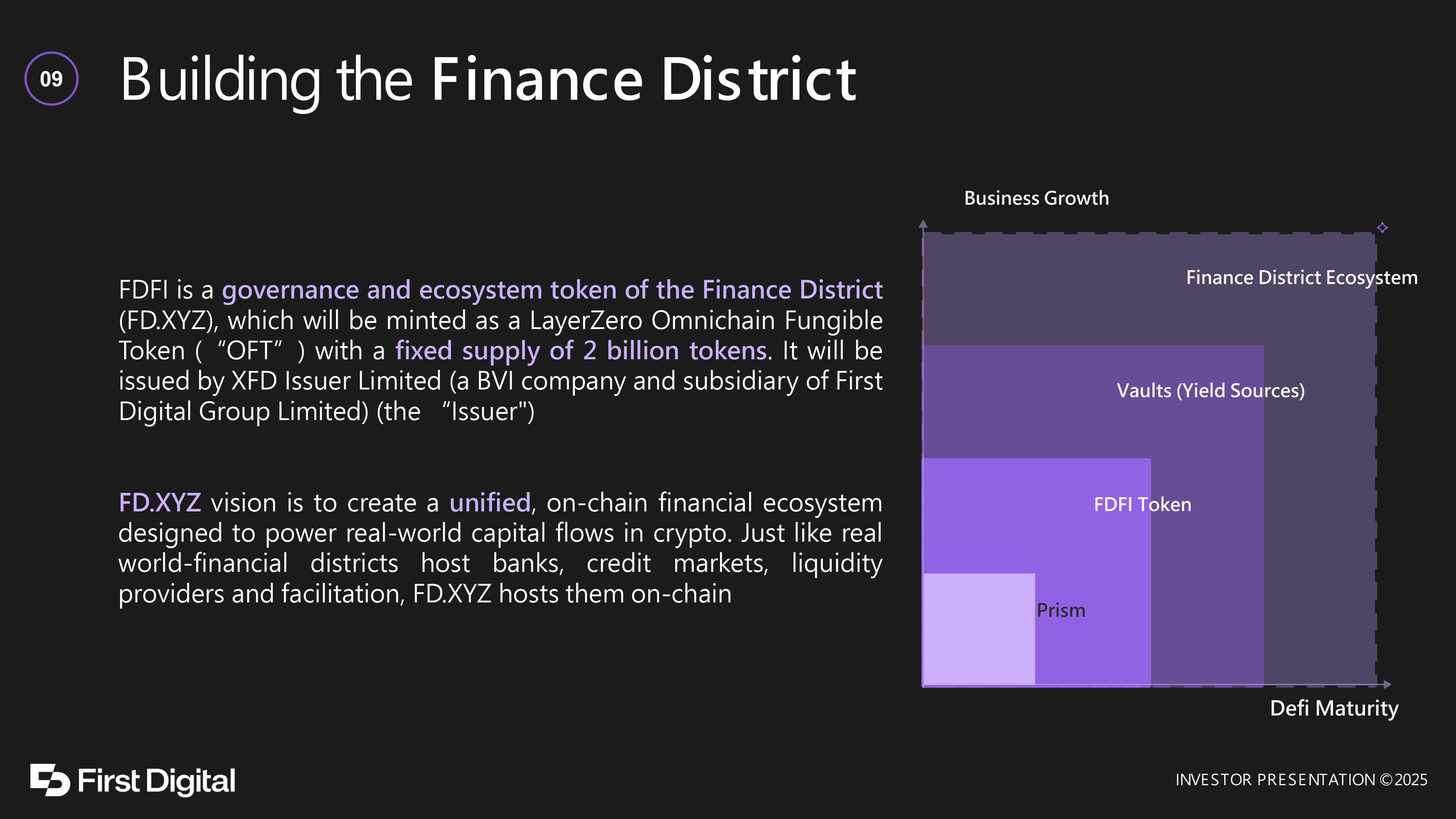 Building the Finance District FDFI is a governance and ecosystem token of the Finance District (FD . XYZ), which will be minted as a LayerZero Omnichain Fungible Token (“OFT”) with a fixed supply of 2 billion tokens . It will be issued by XFD Issuer Limited (a BVI company and subsidiary of First Digital Group Limited) (the “Issuer") FD . XYZ vision is to create a unified , on - chain financial ecosystem designed to power real - world capital flows in crypto . Just like real world - financial districts host banks, credit markets, liquidity providers and facilitation, FD . XYZ hosts them on - chain 09