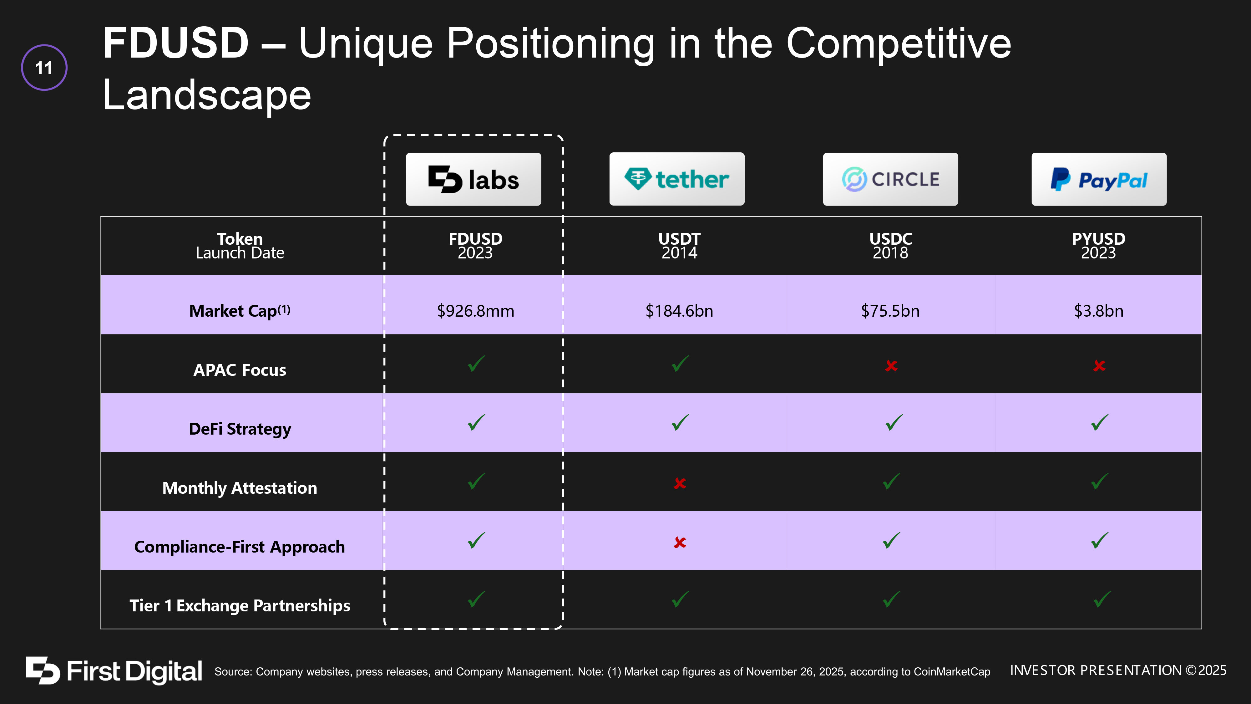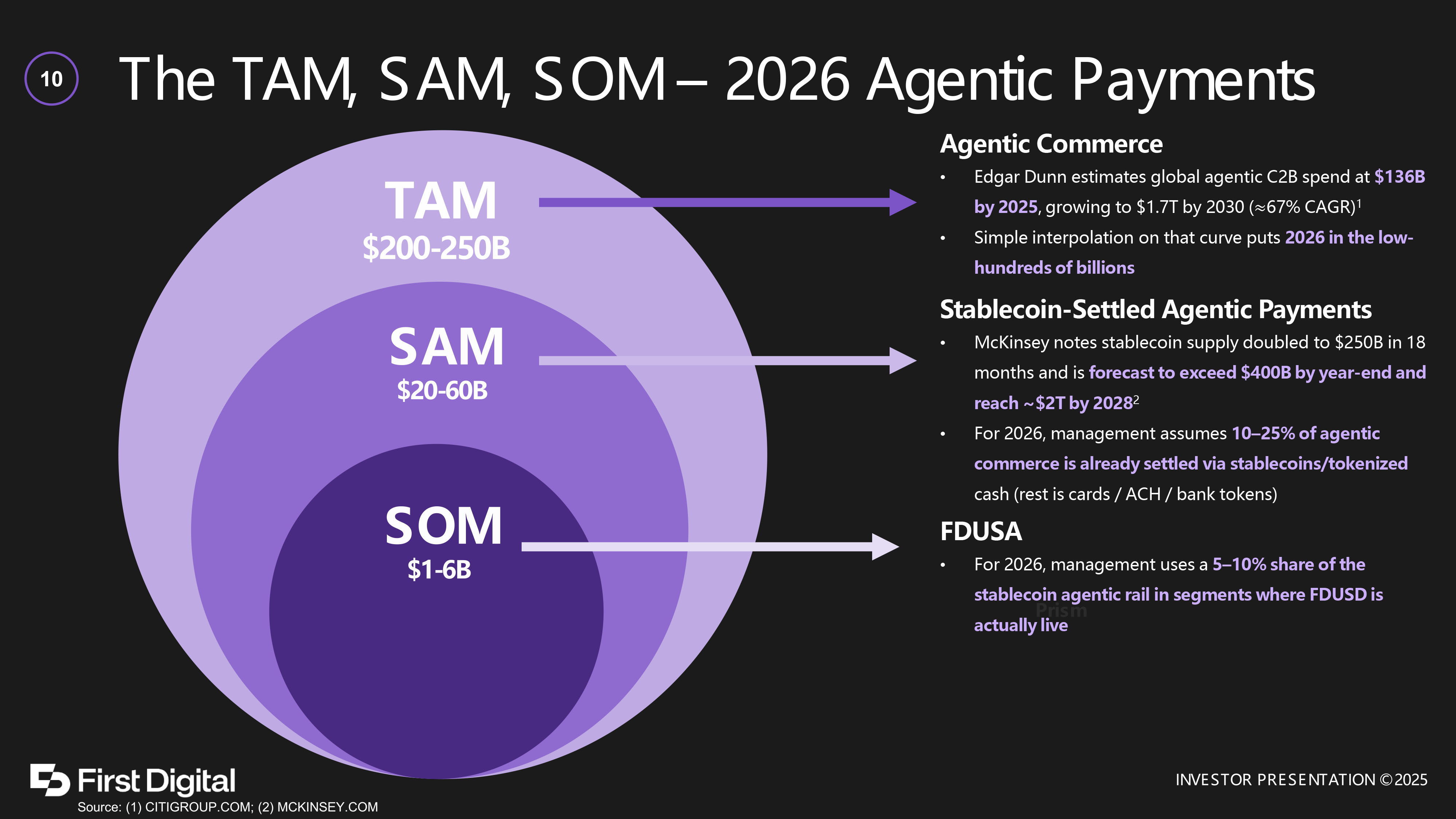 The TAM, SAM, SOM – 2026 Agentic Payments 10 Agentic Commerce • Edgar Dunn estimates global agentic C2B spend at $136B by 2025 , growing to $1.7T by 2030 ( ≈ 67% CAGR) 1 • Simple interpolation on that curve puts 2026 in the low - hundreds of billions Stablecoin - Settled Agentic Payments • McKinsey notes stablecoin supply doubled to $250B in 18 months and is forecast to exceed $400B by year - end and reach ~$2T by 2028 2 • For 2026, management assumes 10 – 25% of agentic commerce is already settled via stablecoins/tokenized cash (rest is cards / ACH / bank tokens) FDUSA • For 2026, management uses a 5 – 10% share of the stablecoin agentic rail in segments where FDUSD is actually live