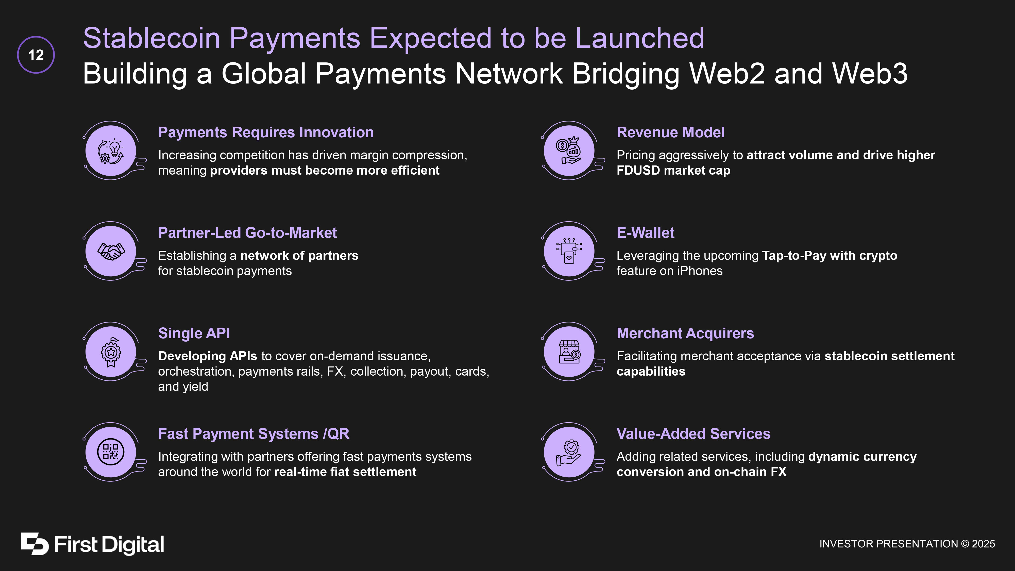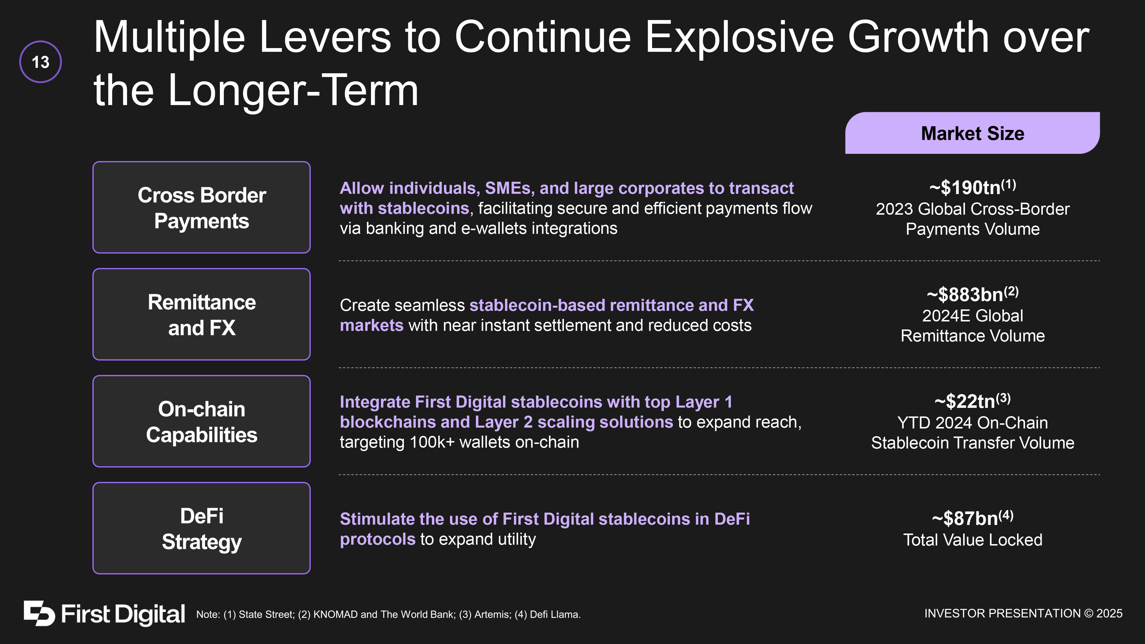 Stablecoin Payments Expected to be Launched Building a Global Payments Network Bridging Web2 and Web3 12 Payments Requires Innovation Increasing competition has driven margin compression, meaning providers must become more efficient Partner - Led Go - to - Market Establishing a network of partners for stablecoin payments Single API Developing APIs to cover on - demand issuance, orchestration, payments rails, FX, collection, payout, cards, and yield Fast Payment Systems /QR Integrating with partners offering fast payments systems around the world for real - time fiat settlement Revenue Model Pricing aggressively to attract volume and drive higher FDUSD market cap E - Wallet Leveraging the upcoming Tap - to - Pay with crypto feature on iPhones Merchant Acquirers Facilitating merchant acceptance via stablecoin settlement capabilities Value - Added Services Adding related services, including dynamic currency conversion and on - chain FX