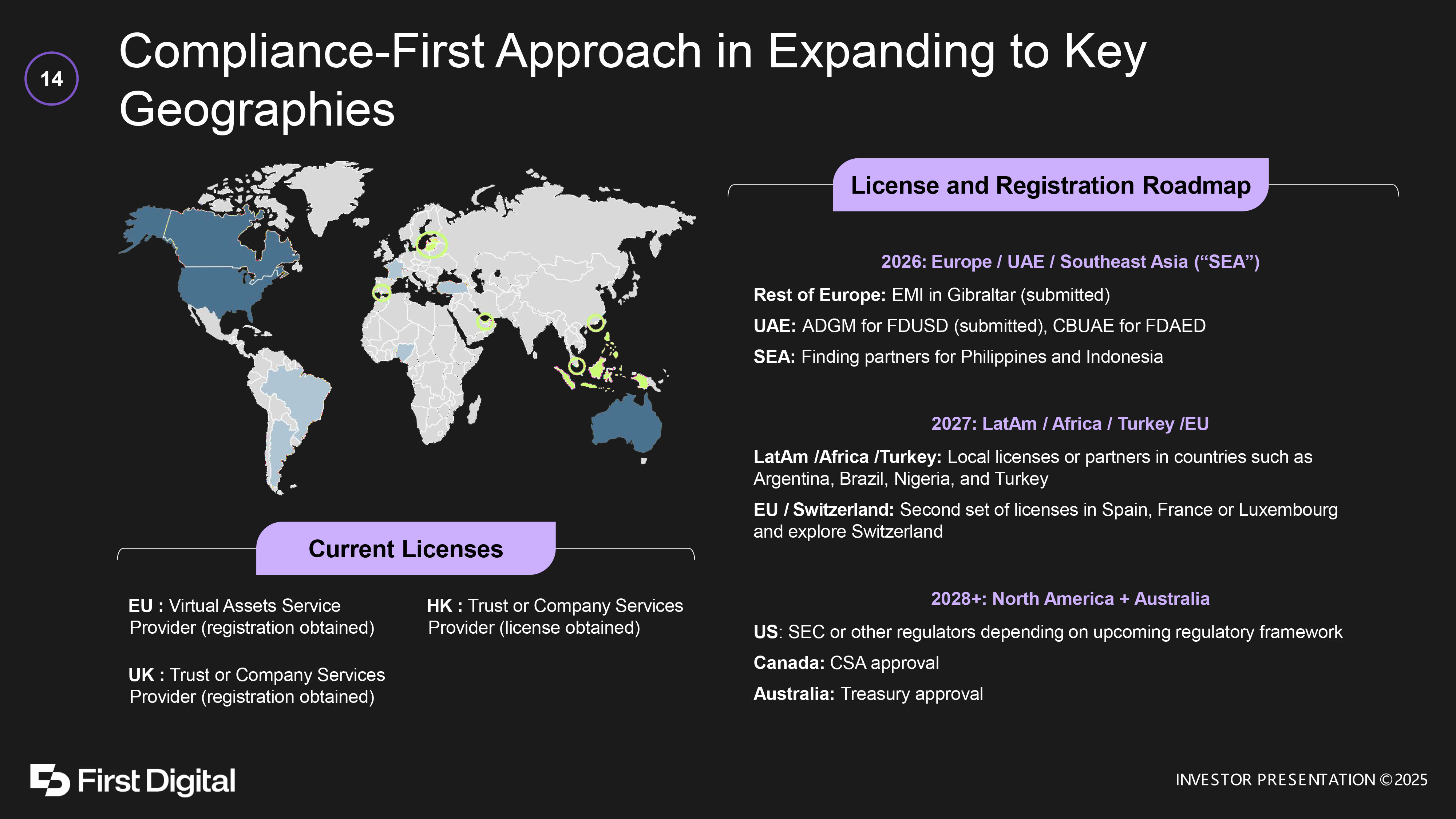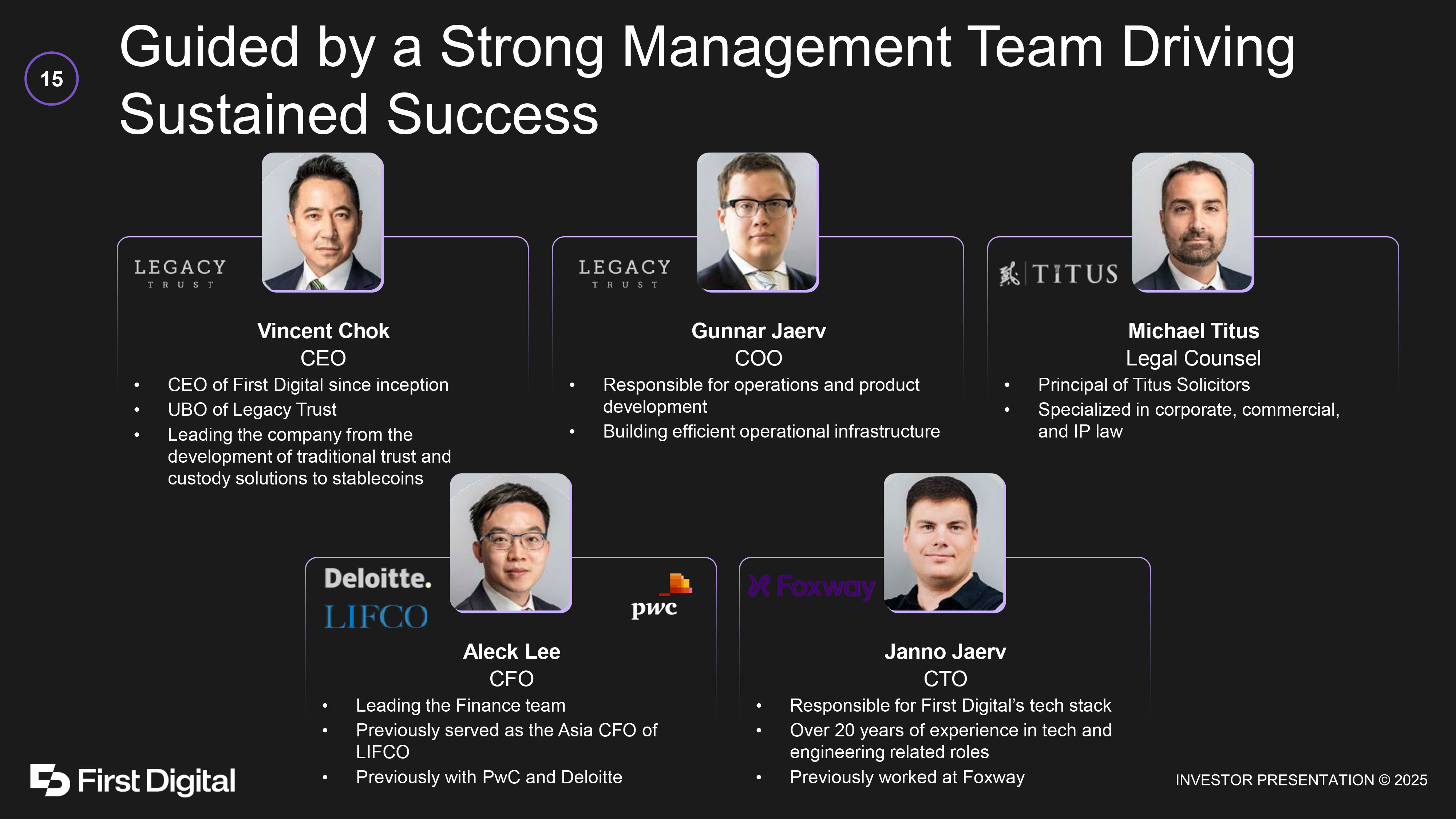 Compliance - First Approach in Expanding to Key Geographies 14 License and Registration Roadmap 2026: Europe / UAE / Southeast Asia (“SEA”) Rest of Europe: EMI in Gibraltar (submitted) UAE: ADGM for FDUSD (submitted), CBUAE for FDAED SEA: Finding partners for Philippines and Indonesia 2027: LatAm / Africa / Turkey /EU LatAm /Africa /Turkey: Local licenses or partners in countries such as Argentina, Brazil, Nigeria, and Turkey EU / Switzerland : Second set of licenses in Spain, France or Luxembourg and explore Switzerland 2028+: North America + Australia US : SEC or other regulators depending on upcoming regulatory framework Canada : CSA approval Australia: Treasury approval UK : Trust or Company Services Provider (registration obtained) EU : Virtual Assets Service Provider (registration obtained) HK : Trust or Company Services Provider (license obtained) Current Licenses