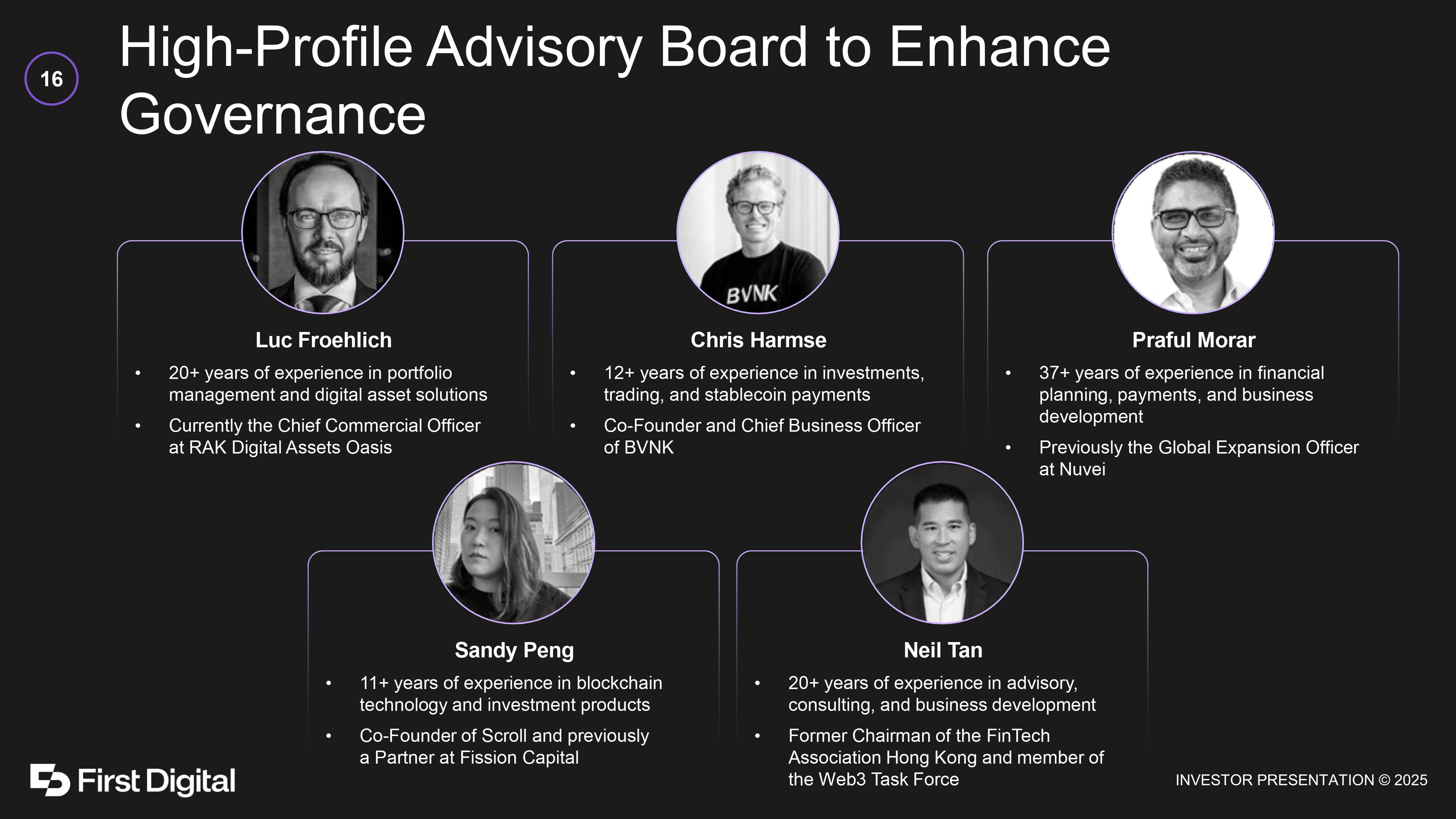 High - Profile Advisory Board to Enhance Governance 16 Luc Froehlich • 20+ years of experience in portfolio management and digital asset solutions • Currently the Chief Commercial Officer at RAK Digital Assets Oasis Chris Harmse • 12+ years of experience in investments, trading, and stablecoin payments • Co - Founder and Chief Business Officer of BVNK Praful Morar • 37+ years of experience in financial planning, payments, and business development • Previously the Global Expansion Officer at Nuvei Sandy Peng • 11+ years of experience in blockchain technology and investment products • Co - Founder of Scroll and previously a Partner at Fission Capital Neil Tan • 20+ years of experience in advisory, consulting, and business development • Former Chairman of the FinTech Association Hong Kong and member of the Web3 Task Force
