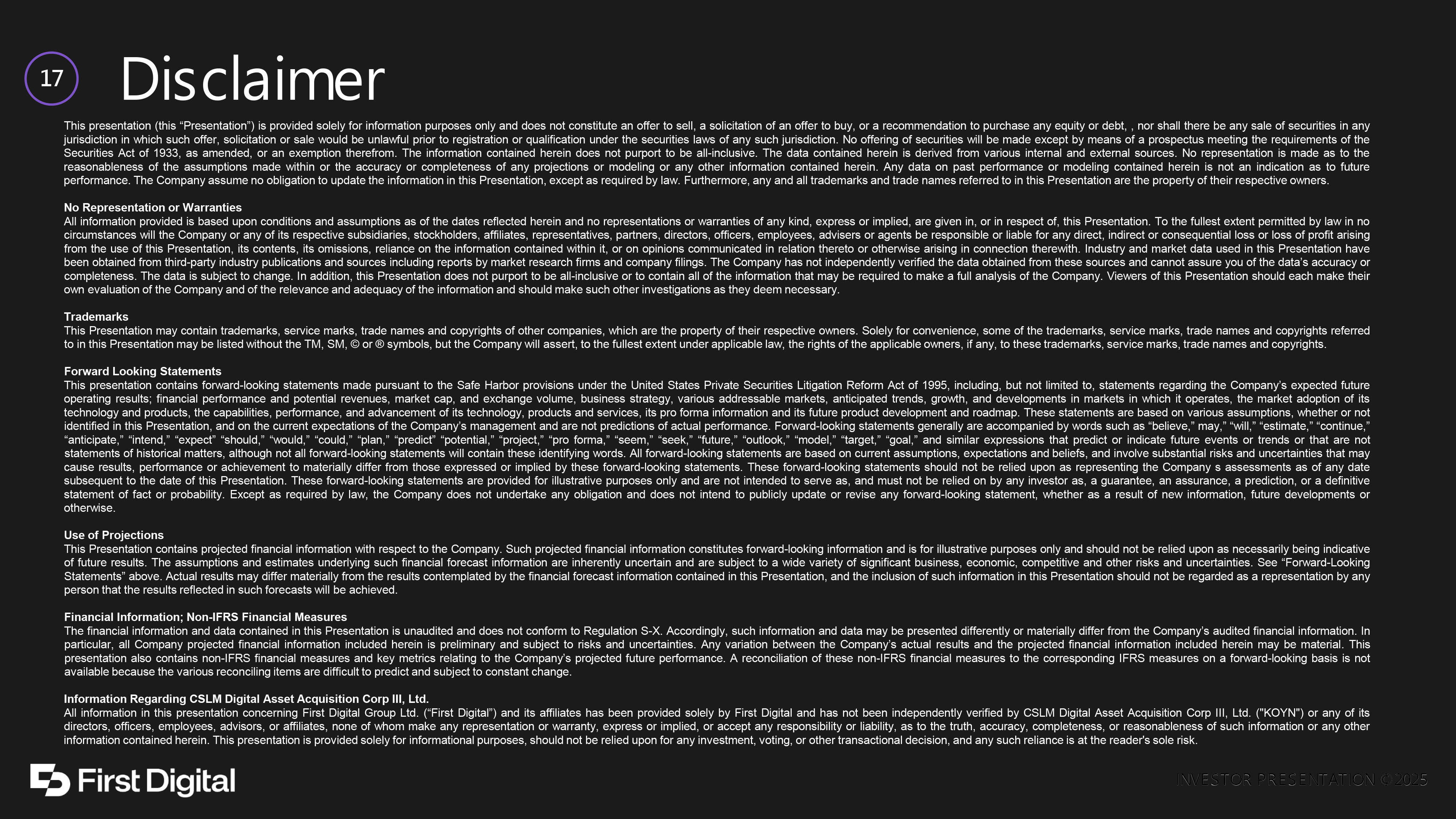 INVESTOR PRESENTATION © 2025 17 Disclaimer This presentation (this “Presentation”) is provided solely for information purposes only and does not constitute an offer to sell, a solicitation of an offer to buy, or a recommendation to purchase any equity or debt, , nor shall there be any sale of securities in any jurisdiction in which such offer, solicitation or sale would be unlawful prior to registration or qualification under the securities laws of any such jurisdiction . No offering of securities will be made except by means of a prospectus meeting the requirements of the Securities Act of 1933 , as amended, or an exemption therefrom . The information contained herein does not purport to be all - inclusive . The data contained herein is derived from various internal and external sources . No representation is made as to the reasonableness of the assumptions made within or the accuracy or completeness of any projections or modeling or any other information contained herein . Any data on past performance or modeling contained herein is not an indication as to future performance . The Company assume no obligation to update the information in this Presentation, except as required by law . Furthermore, any and all trademarks and trade names referred to in this Presentation are the property of their respective owners . No Representation or Warranties All information provided is based upon conditions and assumptions as of the dates reflected herein and no representations or warranties of any kind, express or implied, are given in, or in respect of, this Presentation . To the fullest extent permitted by law in no circumstances will the Company or any of its respective subsidiaries, stockholders, affiliates, representatives, partners, directors, officers, employees, advisers or agents be responsible or liable for any direct, indirect or consequential loss or loss of profit arising from the use of this Presentation, its contents, its omissions, reliance on the information contained within it, or on opinions communicated in relation thereto or otherwise arising in connection therewith . Industry and market data used in this Presentation have been obtained from third - party industry publications and sources including reports by market research firms and company filings . The Company has not independently verified the data obtained from these sources and cannot assure you of the data’s accuracy or completeness . The data is subject to change . In addition, this Presentation does not purport to be all - inclusive or to contain all of the information that may be required to make a full analysis of the Company . Viewers of this Presentation should each make their own evaluation of the Company and of the relevance and adequacy of the information and should make such other investigations as they deem necessary . Trademarks This Presentation may contain trademarks, service marks, trade names and copyrights of other companies, which are the property of their respective owners . Solely for convenience, some of the trademarks, service marks, trade names and copyrights referred to in this Presentation may be listed without the TM, SM, © or ® symbols, but the Company will assert, to the fullest extent under applicable law, the rights of the applicable owners, if any, to these trademarks, service marks, trade names and copyrights . Forward Looking Statements This presentation contains forward - looking statements made pursuant to the Safe Harbor provisions under the United States Private Securities Litigation Reform Act of 1995 , including, but not limited to, statements regarding the Company’s expected future operating results ; financial performance and potential revenues, market cap, and exchange volume, business strategy, various addressable markets, anticipated trends, growth, and developments in markets in which it operates, the market adoption of its technology and products, the capabilities, performance, and advancement of its technology, products and services, its pro forma information and its future product development and roadmap . These statements are based on various assumptions, whether or not identified in this Presentation, and on the current expectations of the Company’s management and are not predictions of actual performance . Forward - looking statements generally are accompanied by words such as “believe,” may,” “will,” “estimate,” “continue,” “anticipate,” “intend,” “expect” “should,” “would,” “could,” “plan,” “predict” “potential,” “project,” “pro forma,” “seem,” “seek,” “future,” “outlook,” “model,” “target,” “goal,” and similar expressions that predict or indicate future events or trends or that are not statements of historical matters, although not all forward - looking statements will contain these identifying words . All forward - looking statements are based on current assumptions, expectations and beliefs, and involve substantial risks and uncertainties that may cause results, performance or achievement to materially differ from those expressed or implied by these forward - looking statements . These forward - looking statements should not be relied upon as representing the Company s assessments as of any date subsequent to the date of this Presentation . These forward - looking statements are provided for illustrative purposes only and are not intended to serve as, and must not be relied on by any investor as, a guarantee, an assurance, a prediction, or a definitive statement of fact or probability . Except as required by law, the Company does not undertake any obligation and does not intend to publicly update or revise any forward - looking statement, whether as a result of new information, future developments or otherwise . Use of Projections This Presentation contains projected financial information with respect to the Company . Such projected financial information constitute