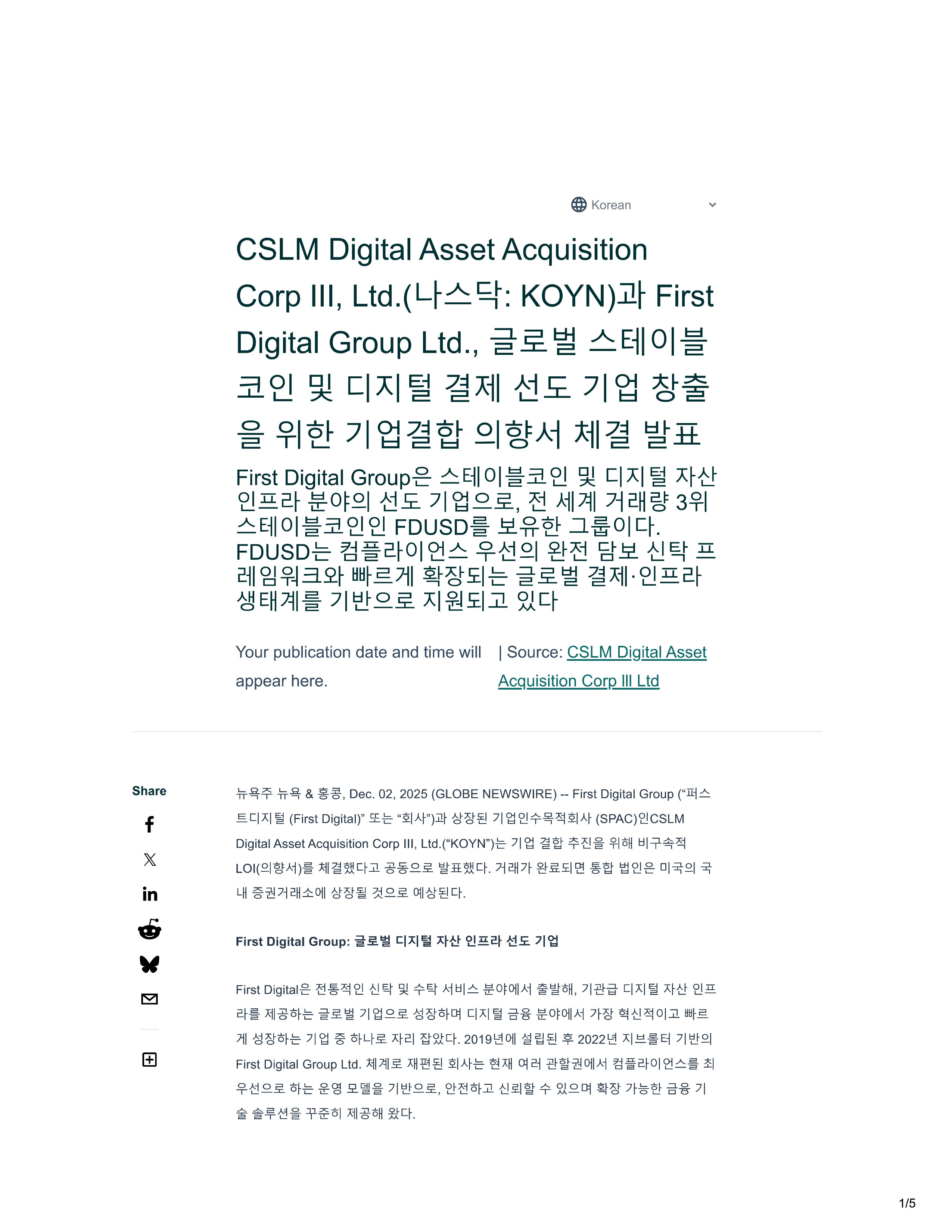 @ Korean v 1 /5 CSLM D i gital Asset Acqu i s i t i on Corp Ill, L td . ( L A '9 ƒ : KOYN ) F i rst D i g i tal Grou p Ltd . , " † " £ A E i l OI : F i rst D i g i tal Group A E il o I .TI CZ! Cl Al A e z!.u c 0 0 1 £ 71 0 £, A 11 741 J - i c H 3S ? I A E il o I .TI CZ! CZ! FDUSD A i l £ 71 c 1 x 1 . n '2 .! “ I: . gt 0 1 A i : t i l 71 I .:i. o I c . FDUSD {:j c OI <2! A 0 1 - @! - Et st .u 2:il - 9:l .3..2 H H 2 Jil : g £ 1 £ A 1 1 · ez! .u. c EH 7 4 1 71 0 £ Al £ 1 .JJ. S: L c Y our pu b l i cation date and t i me will I Sou r ce: CSLM Digital Asset appear here. A u i sit i on Cor12 Ill L td Share f - \ 'i -- &? - \ 'i - ,& & - 8 - . Dec. 02, 2025 (GLOBE NEWSW I RE ) - F i rst D i g i tal Group ( " I i i . † .CiXI ( F i rst D i g i tal )" EE. - e "2IAt" ) .Ef - S 71 £!:y: 21A/ - (S P AC ) £!CSLM Dig i tal Asset Acquisition Corp Ill, Ltd.( " KOYN" ) E 7 1 gj ti" 1 5fl l::ll - ,1 - L O l( A · l) :lcl li q2 .2.£ 1 U l q - 7i 2/17t % '2!_ ru - '2).g DI 7i2/l .2..£ in • " 1 “ 1 F i rst D i g i tal Group: W£W c p tlil A! - H C2.!l ! i!I - .!c. 71'l;I F i rst Digita l g '21 i! 'ill :y: A l::ll O O U A i H. 7 1 - f! -- a - CIXI 1!! ;t;ttl £)!!. 2 } l ot - E .£ 7lgj.2..£ :g - otD! qx 1 'ii 'E".g O OII A i 7t:g - i ] Ol2 HHt.s. }II :g - ote 7l gj ot q .£ xt2 . 1 q . 2019'.:!0II - 8 .$ 2022'.:! ;t;l..!:! - i - E i 71 1 F i rst Digital Group Ltd. P U £ All @ At - E All 012:l O I I A i { ! 2.tOl 'l! ¥ - .2..£ ot - E .2.l!! 71 .2.£, £1 - ot2 il :y: .2.D! 1 m 7t - a - E.g. 71 - F - t:1 ,1 0 1 J : 5fl ct.